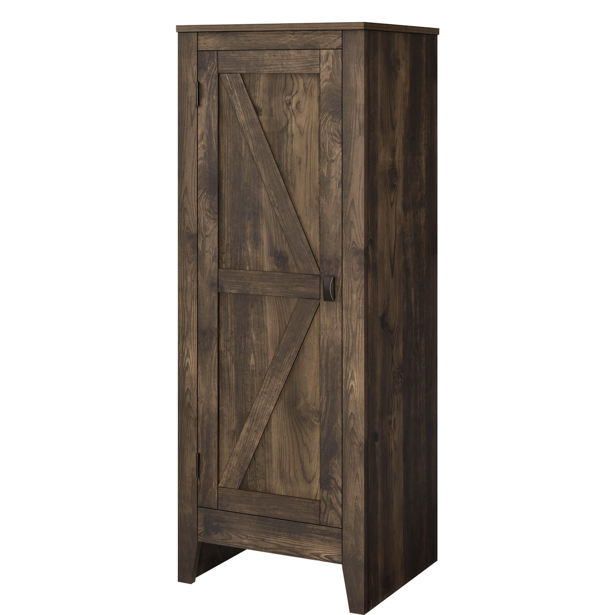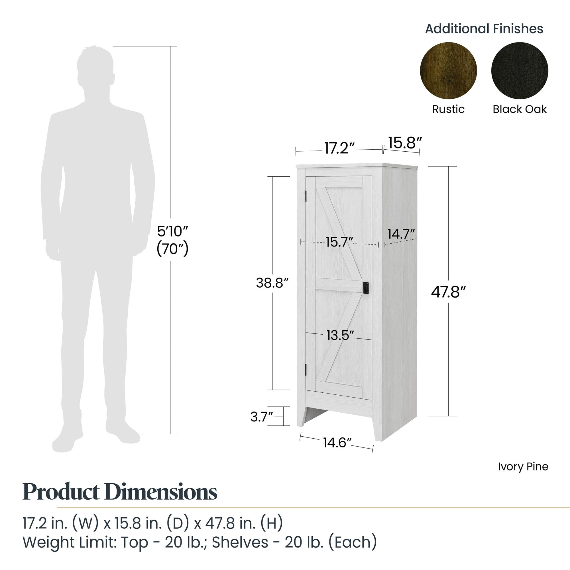 The Systembuild Evolution Farmington Storage Cabinet is a stylish way to stay on top of your organization. The rustic barn style design and sleek tapered feet gives the look of an old weathered cabinet but the sturdy laminated particleboard and MDF make this Cabinet the perfect piece to house your home office supplies, extra linens and more! Open up the door to 4 spacious shelves, 2 adjustable, to fit items of differing sizes. The weathered medium brown finish will bring a nice rustic appeal to your space. The Farmington Cabinet is recommended to be assembled and moved by 2 adults. A wall anchor kit is provided for extra safety and security. After assembled, this Cabinet measures to be 47.8″H x 17.2″W x 15.8″D.
