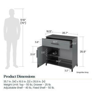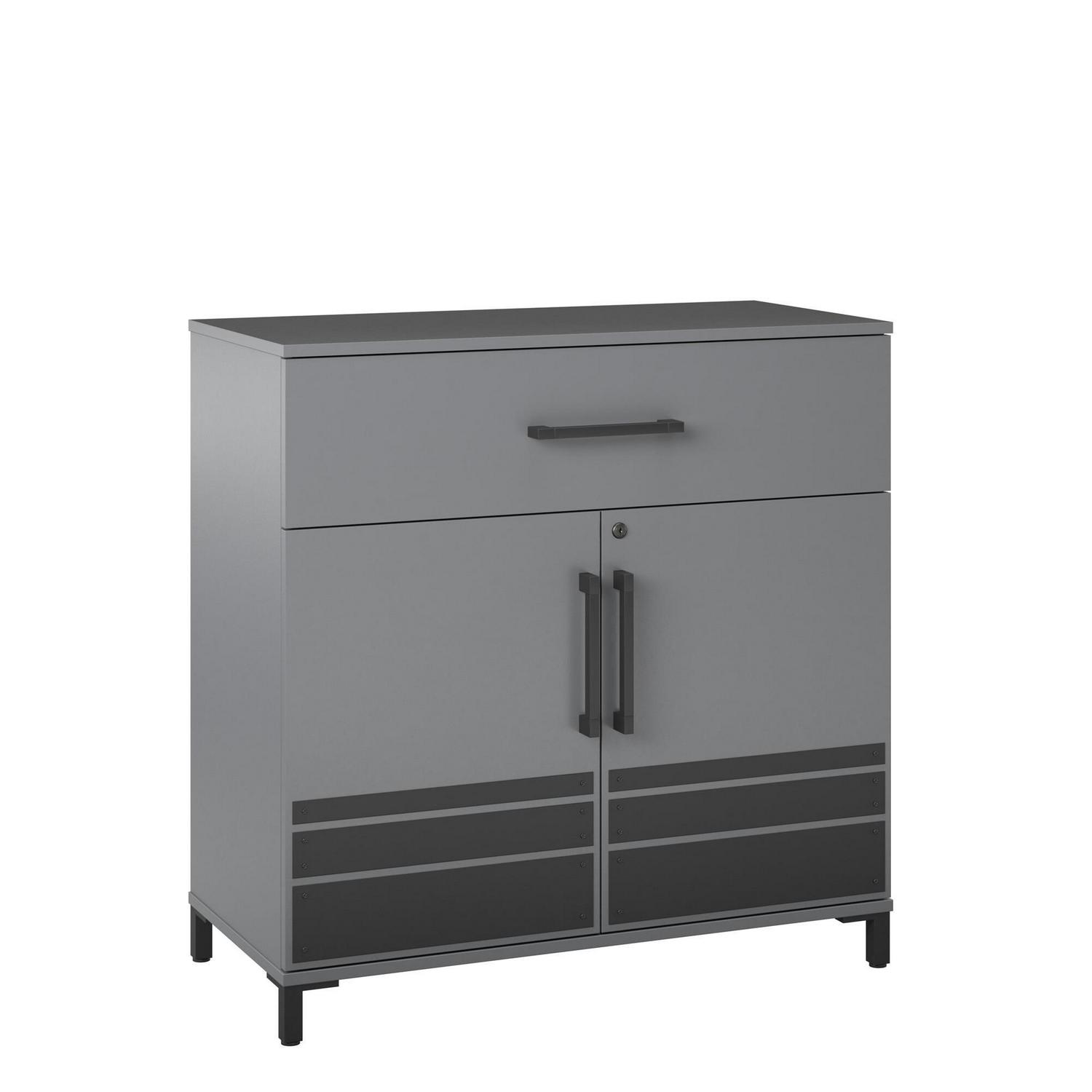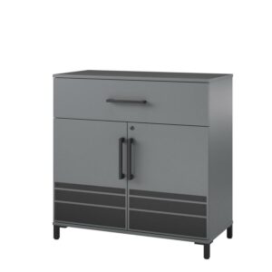 Your garage deserves to look and function at its absolute best. Get organized in style with the Shelby Collection by Systembuild Evolution. Constructed from durable engineered wood with metal plates, handles and feet, the 2 Door/1 Drawer Base Cabinet will go a long way in whipping your garage gear into shape. Behind the two cabinet doors is one fixed and one adjustable shelf for storing items tall to small. The drawer is perfect for tucking away smaller items you need at your fingertips. Safety is key, so keep less kid-friendly items behind lock and key in the convenient cabinets equipped with safety lock. A wall anchor kit is included to prevent tipping injuries. Mix and match storage cabinets from the entire collection. (each sold separately) The Base Cabinet ships flat to your door in one box and requires assembly. Two adults are recommended to assemble. Once assembled the Cabinet measures to be 35.67″ W x 16.46″ D x 35.98″ H.