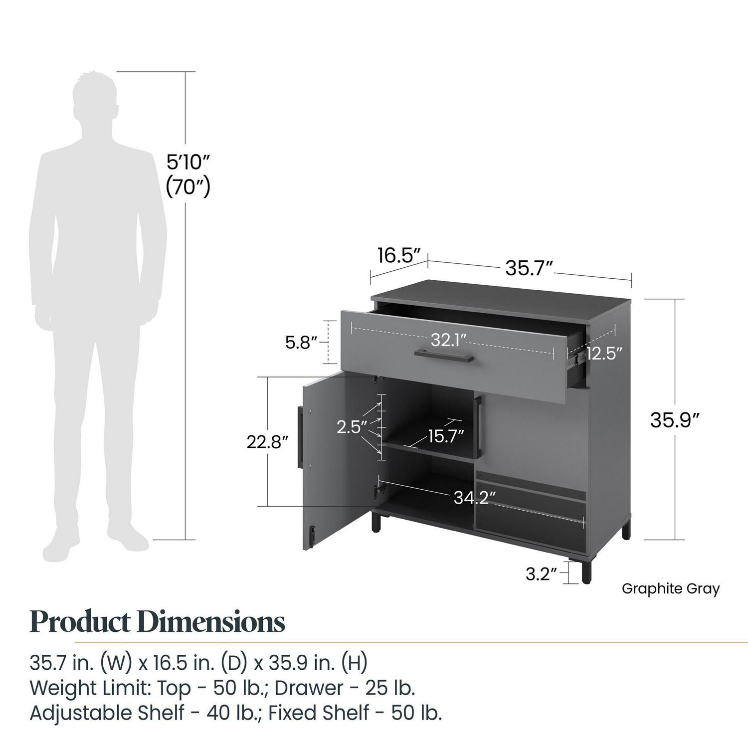 – Max Weight Capacities: Top: 50 lbs. Drawer: 25 lbs. Adjustable shelf: 40 lbs. Fixed shelf: 50 lbs.
