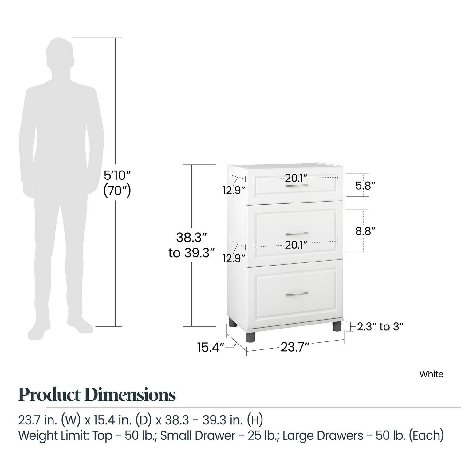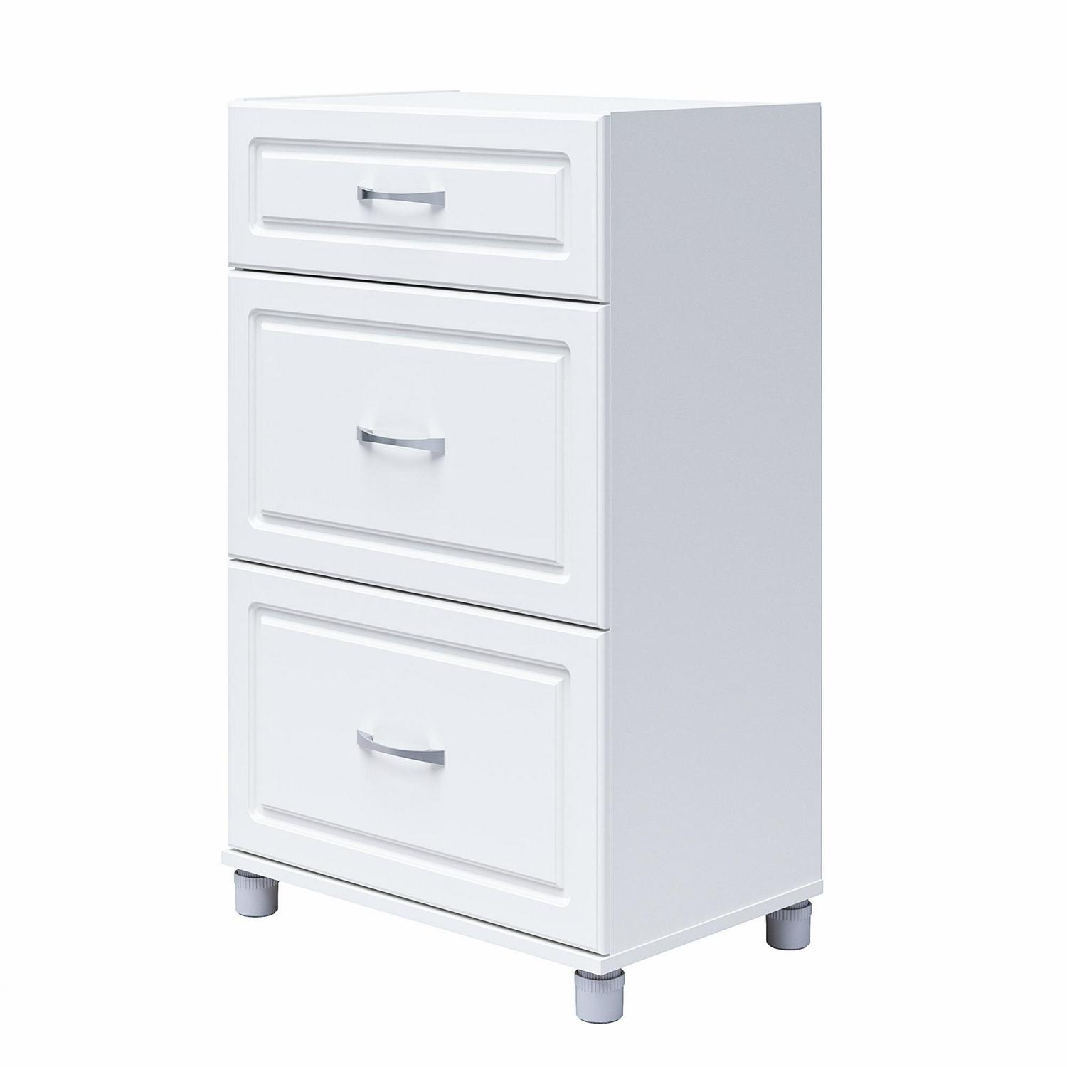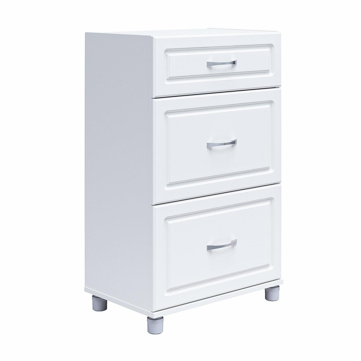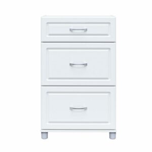 Add convenient storage to your home with the Systembuild Evolution Kendall 24″ 3 Drawer Base Storage Cabinet. This Base Cabinet features 3 roomy drawers that will hold a variety of household items. Its small size will fit perfectly into the corner of a room or alongside your current storage pieces. Three Drawer Base Cabinet includes 1 small and 2 large drawers. The 24″ 3 Drawer Base Cabinet features a crisp white finish that creates a refined, clean look in your home. Use this piece as a stand-alone item, or combine it with additional Systembuild Evolution Kendall storage items to create the perfect storage solution for your home. Systembuild Evolution 24″ 3 Drawer Base Storage Cabinet requires assembly upon delivery. Countertops not included.