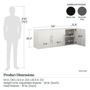 Convert unused wall space into storage with the Systembuild Evolution Camberly 54″ Wall Cabinet. Made of laminated MDF and particleboard, the Ivory Oak finish pairs with any decor so the Cabinet can be used anywhere. Use the concealed storage of the Wall Cabinet for laundry essentials and cleaning supplies. The interior of each of the 3 Cabinets features 1 adjustable and 1 fixed shelf. The EZ Hang system makes hanging the Wall Cabinet quick and easy. Simply attach and level the support bar on the wall and hook the Wall Cabinet on for a sturdy and level hang on the first try. Use this piece as a stand-alone item, or combine it with additional Systembuild Evolution Camberly storage items to create the perfect storage solution for your home. The Wall Cabinet ships flat to your door and requires assembly. Two adults are recommended to assemble. Once assembled, the Wall Cabinet measures to be 20.31H x 54W x 12.44D.