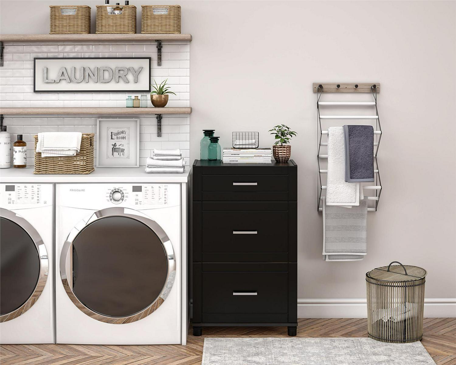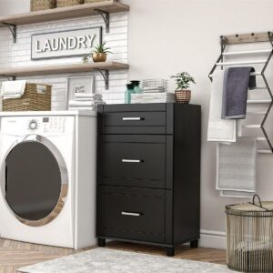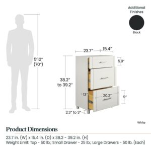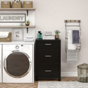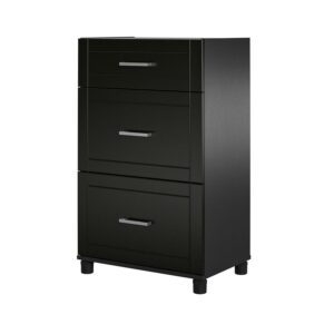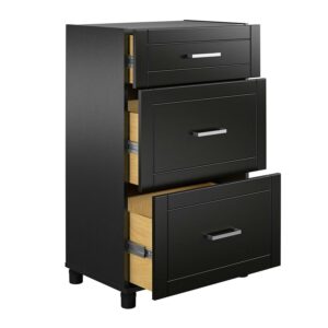 Add convenient storage to your home with the Systembuild Evolution Callahan 24″ 3 Drawer Base Storage Cabinet. This Base Cabinet features 3 roomy drawers that will hold a variety of household items. Its small size will fit perfectly into the corner of a room or alongside your current storage pieces. The Base Cabinet includes 1 small and 2 large drawers. The 24″ 3 Drawer Base Cabinet features a water-resistant black finish that creates a refined, clean look in your home. Use this piece as a stand-alone item, or combine it with additional Systembuild Evolution Callahan storage items to create the perfect storage solution for your home. The 24″ 3 Drawer Base Storage Cabinet ships flat to your door and requires assembly upon opening. Two adults are recommended to assemble. Once assemble, the Base Cabinet measures to be 38.25-39.25″H x 23.69″W x 15.38″D.
