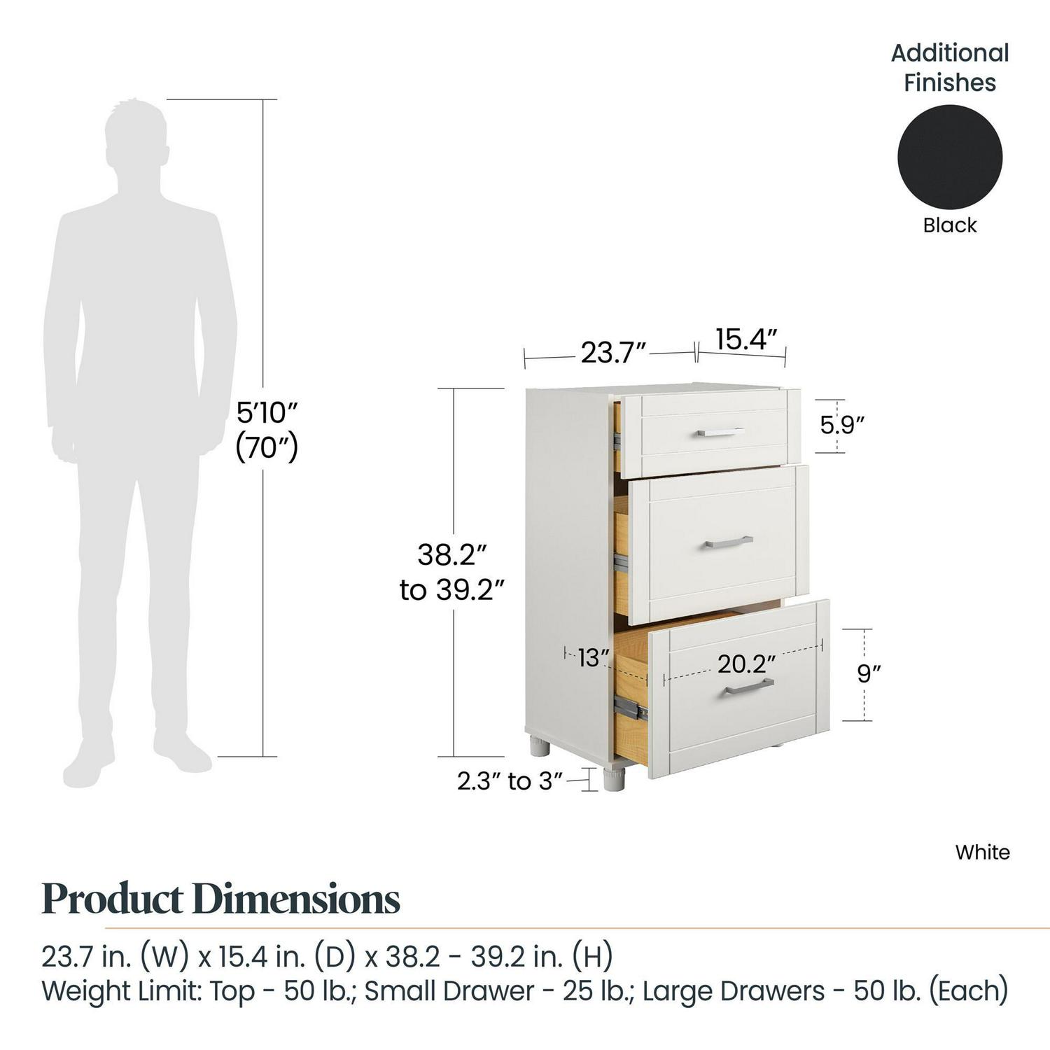 – The Base Cabinet ships flat to your door and 2 adults are recommended to assemble. The top surface can hold up to 50 lbs. The smaller drawer can hold 25 lbs. while each of the lower drawers can hold 50 lbs. Assembled dimensions: 38.25-39.25″H x 23.69″W x 15.38″D