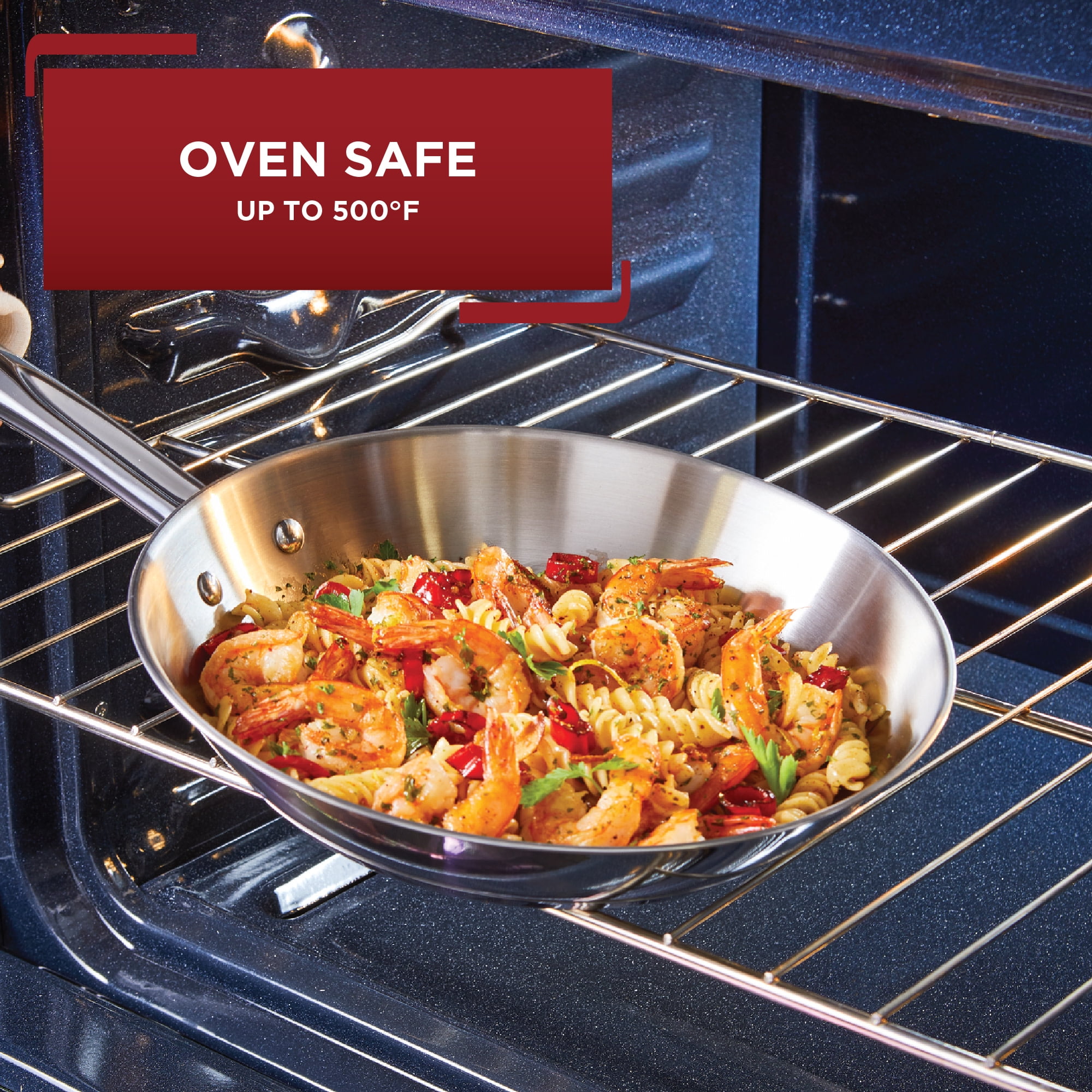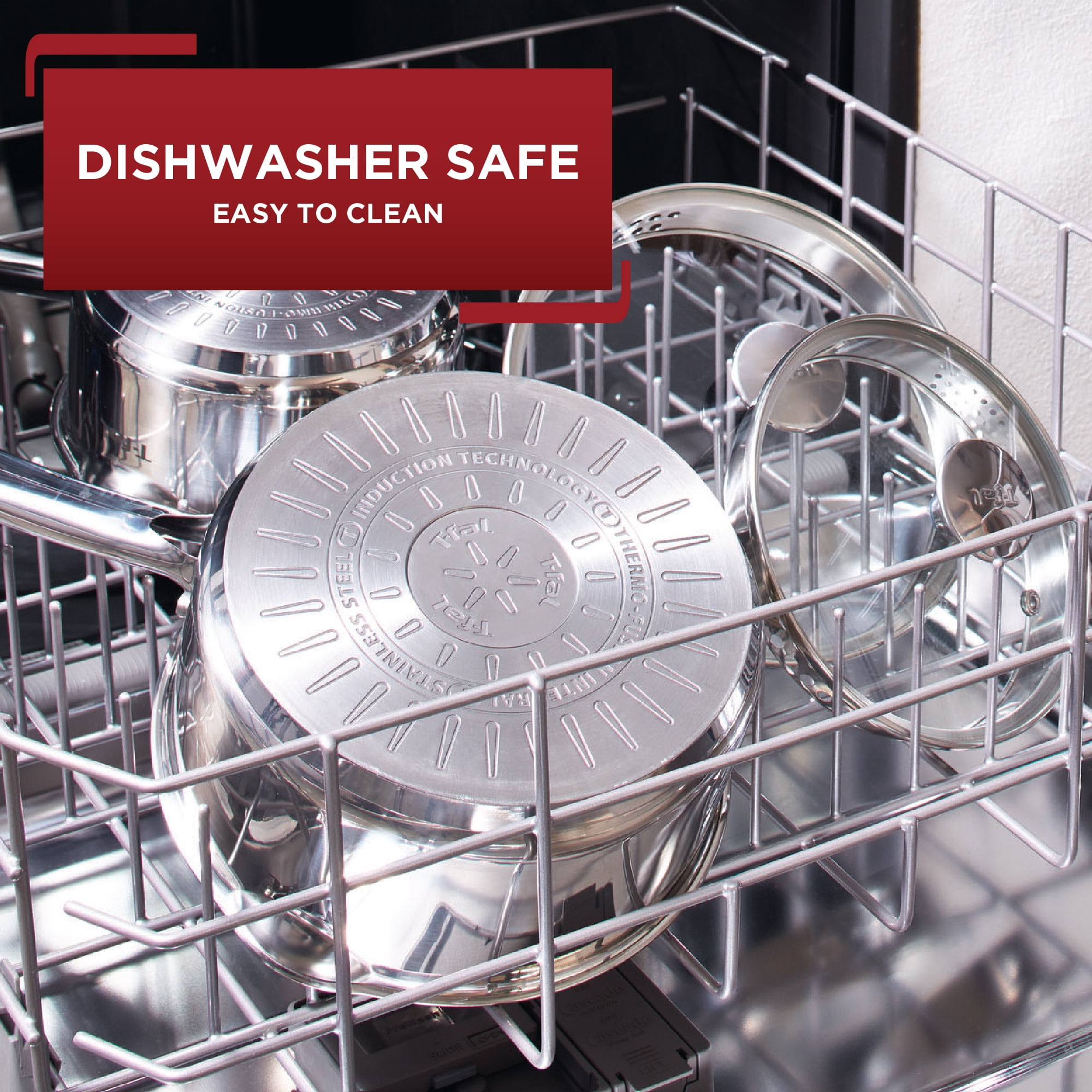 Extra convenience for everyday cooking with T-fal Cook & Strain Stainless Steel 14-Piece Set. Convenient features like straining lids, pour spouts, measuring marks and riveted Stainless Steel handles make cooking a breeze. Includes 8” frypan, 10.5” frypan, 1qt covered saucepan, 2.4qt covered saucepan, 5qt covered Dutch oven, 4 Nylon tools, measuring spoons, and 2qt steamer insert. Stainless steel construction ensures long lasting performance, and the Stainless Steel interior maintains the purity of flavor. Even heat Induction base ensures no hot spots. Dishwasher and oven safe up to 500°F; compatible with all cook tops, including Induction.