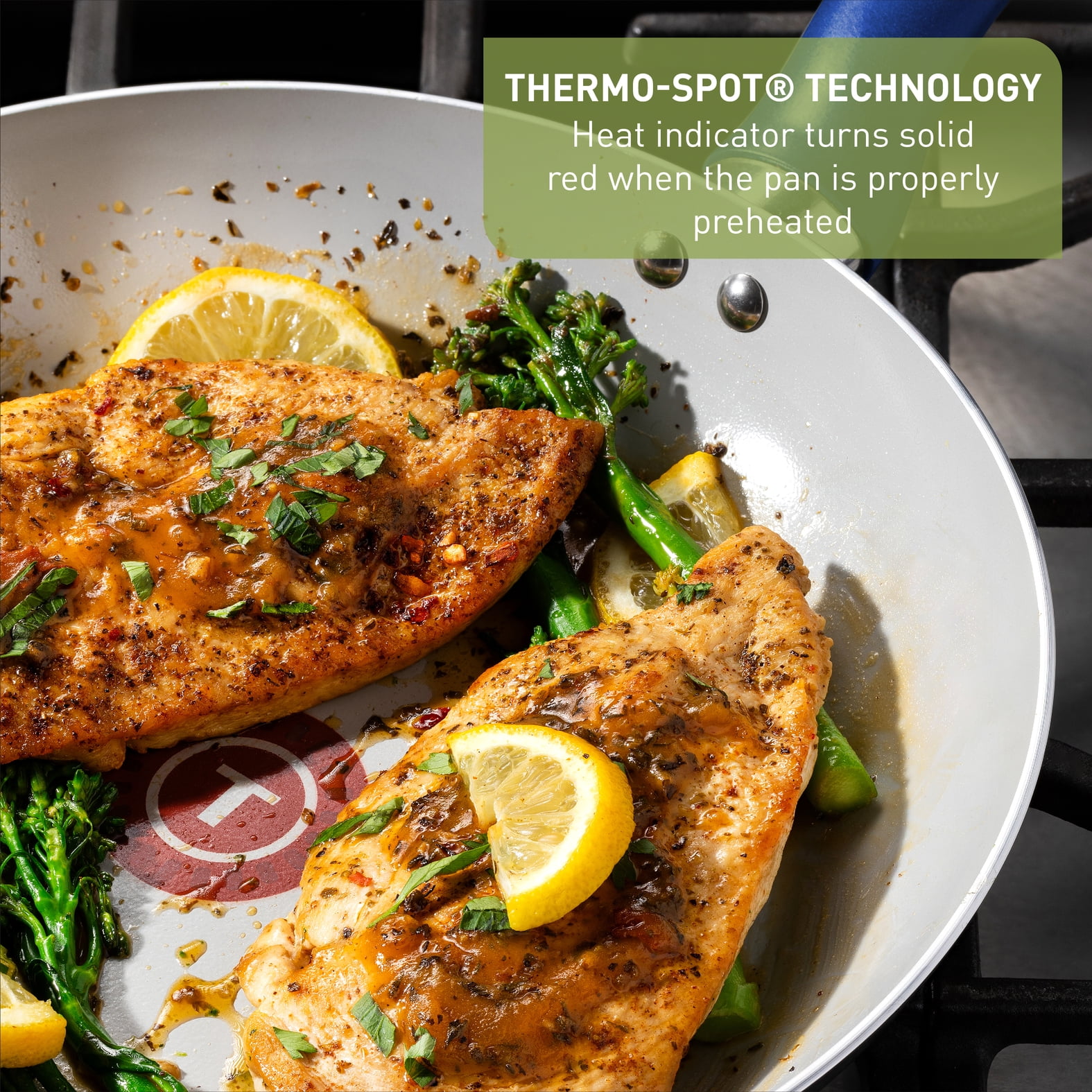 Healthy cooking with reduced eco impact: Crafted with 100% recycled aluminum body and a ceramic nonstick interior, you can reduce your eco-impact while enjoying nutritive and tasty meals prepared with little or no oil. All You Need: This set comes with 8 Inch & 10.5 Inch Frypans, 1 Quart & 2 Quart Covered Saucepans, 3 Quart Covered Sauté Pan, 5 Quart Covered Dutch Oven, Slotted Spatula, and Solid Spoon, making this set the perfect addition to your kitchen! Thermo-Spot Technology®: Our unique heat indicator turns solid red when the pans are properly pre-heated. Additionally, this cookware has an even heat base, preventing hot spots for optimal cooking results. Stylish and Practical Design: Add a touch of color and style to your kitchen with this ceramic cookware. Features comfortable handles for a sturdy and secure grip on pots and pans, and vented glass lids for visibility while trapping enough heat and moisture to ensure your dishes are infused with flavor and tenderness. Effortless Cooking and Easy Cleanup: This cookware is all cooktops compatible except for induction, and is oven safe up to 350°F, allowing you to prepare a wide variety of delicious meals. Hand wash is recommended. Limited lifetime warranty.