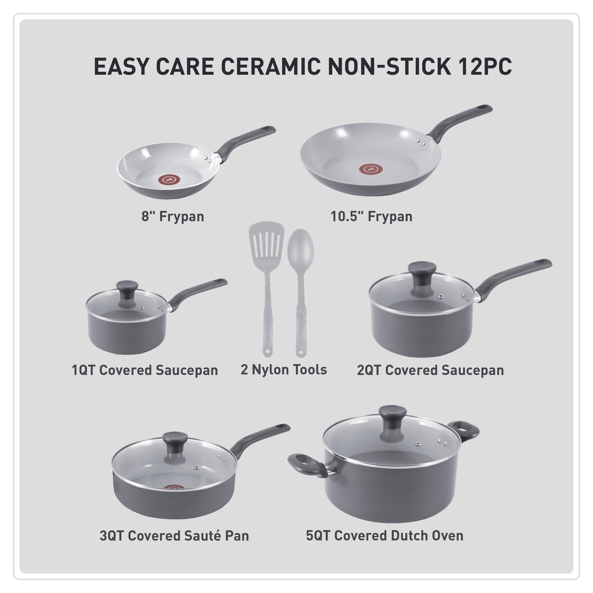 T-fal Easy Care Ceramic Non-Stick, 12 Piece Pots and Pans Cookware Set, Stone Grey