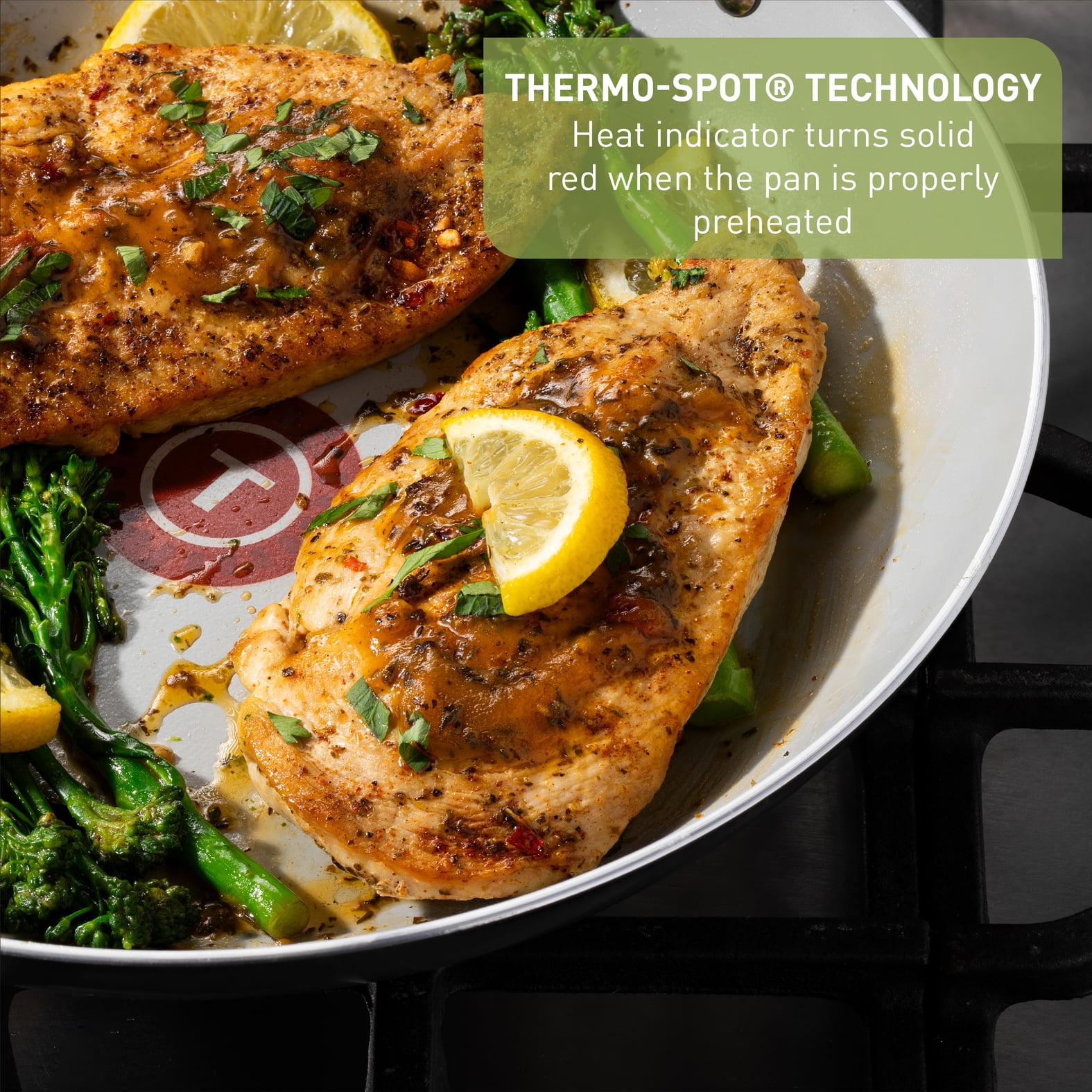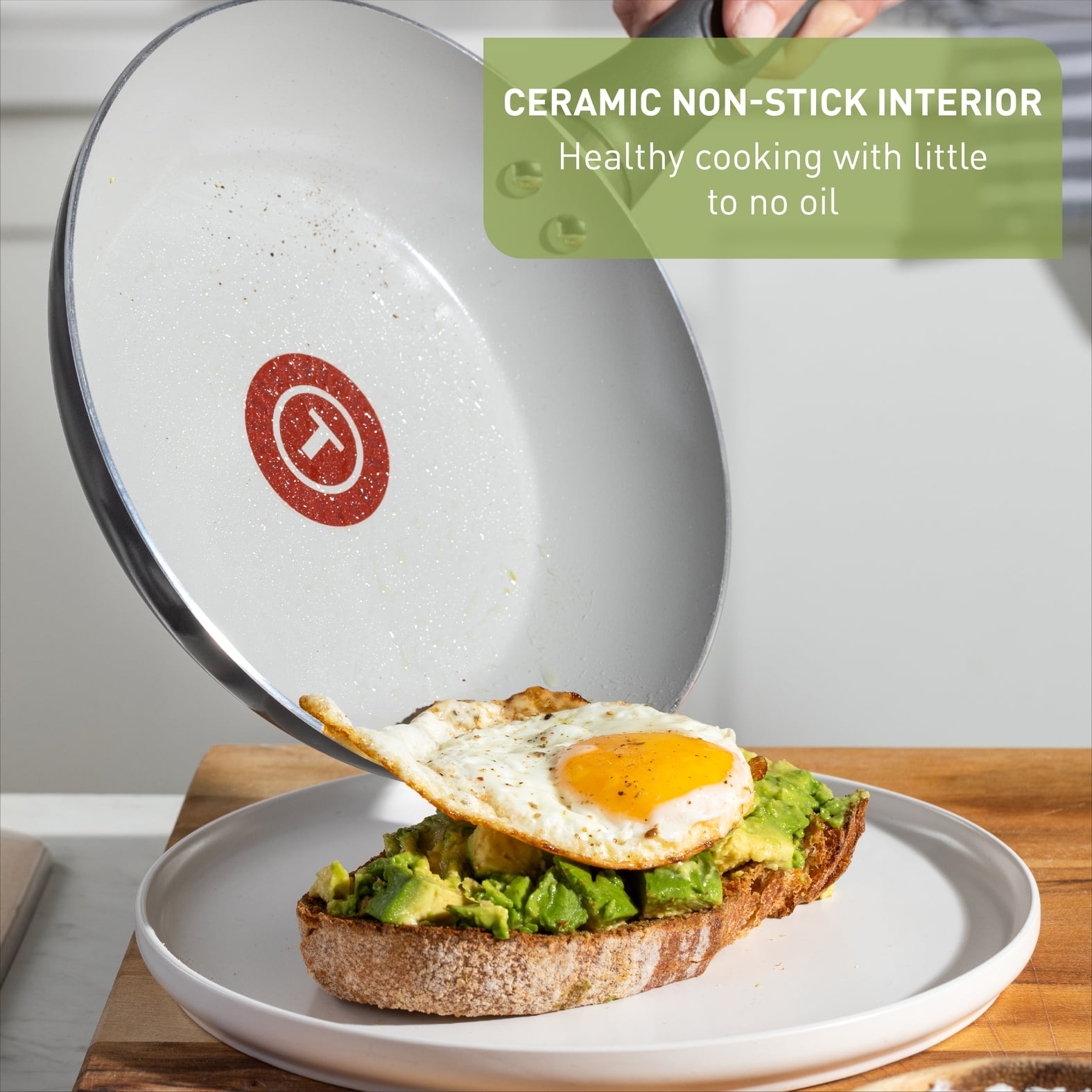 Healthy cooking with reduced eco impact: Crafted with 100% recycled aluminum body and a ceramic nonstick interior, you can reduce your eco-impact while enjoying nutritive and tasty meals prepared with little or no oil. All You Need: This set comes with 8 Inch & 10.5 Inch Frypans, 1 Quart & 2 Quart Covered Saucepans, 3 Quart Covered Sauté Pan, 5 Quart Covered Dutch Oven, Slotted Spatula, and Solid Spoon, making this set the perfect addition to your kitchen! Thermo-Spot Technology®: Our unique heat indicator turns solid red when the pans are properly pre-heated. Additionally, this cookware has an even heat base, preventing hot spots for optimal cooking results. Stylish and Practical Design: Add a touch of color and style to your kitchen with this ceramic cookware. Features comfortable handles for a sturdy and secure grip on pots and pans, and vented glass lids for visibility while trapping enough heat and moisture to ensure your dishes are infused with flavor and tenderness. Effortless Cooking and Easy Cleanup: This cookware is all cooktops compatible except for induction, and is oven safe up to 350°F, allowing you to prepare a wide variety of delicious meals. Hand wash is recommended. Limited lifetime warranty.