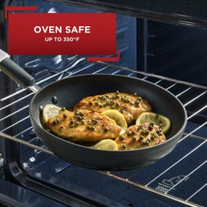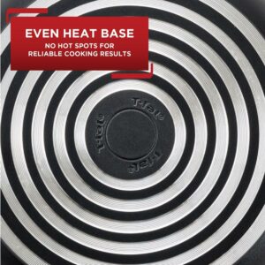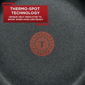 T-fal excellence cookware removes the fear of using metal utensils while cooking in non-stick pans. A special process creates a non-stick cooking surface reinforced with titanium for the ultimate durability and longest lasting performance. Proper preheating to seal in food’s flavor is a breeze with the patented T-fal thermo-spot, which clearly indicates when the pan has reached the optimal temperature to begin cooking. The even heat base provides even heating for reliable cooking results every time. The riveted, soft touch handles are ergonomically designed for comfort and safety. This cookware is dishwasher safe and oven safe to 350°F.