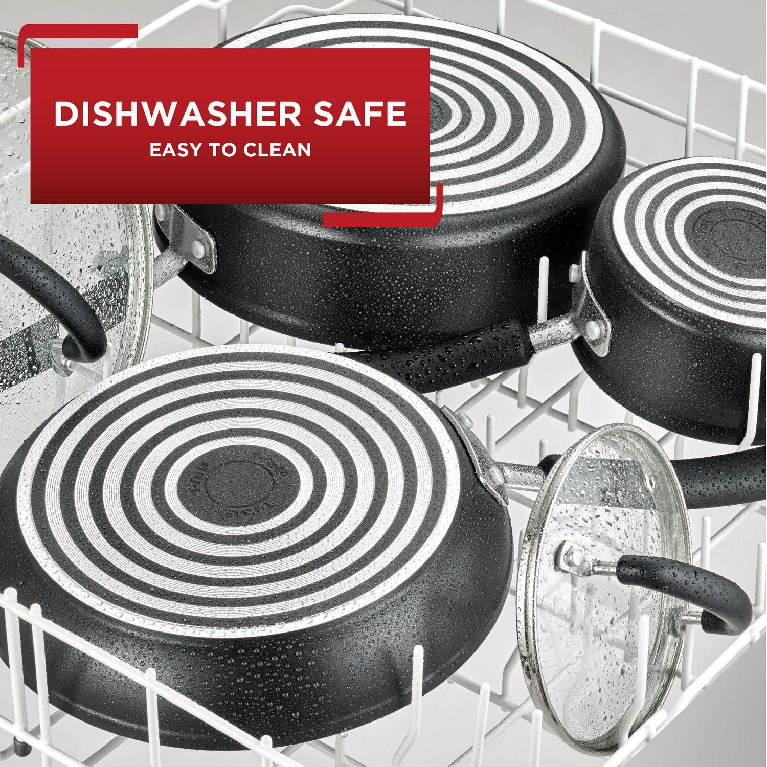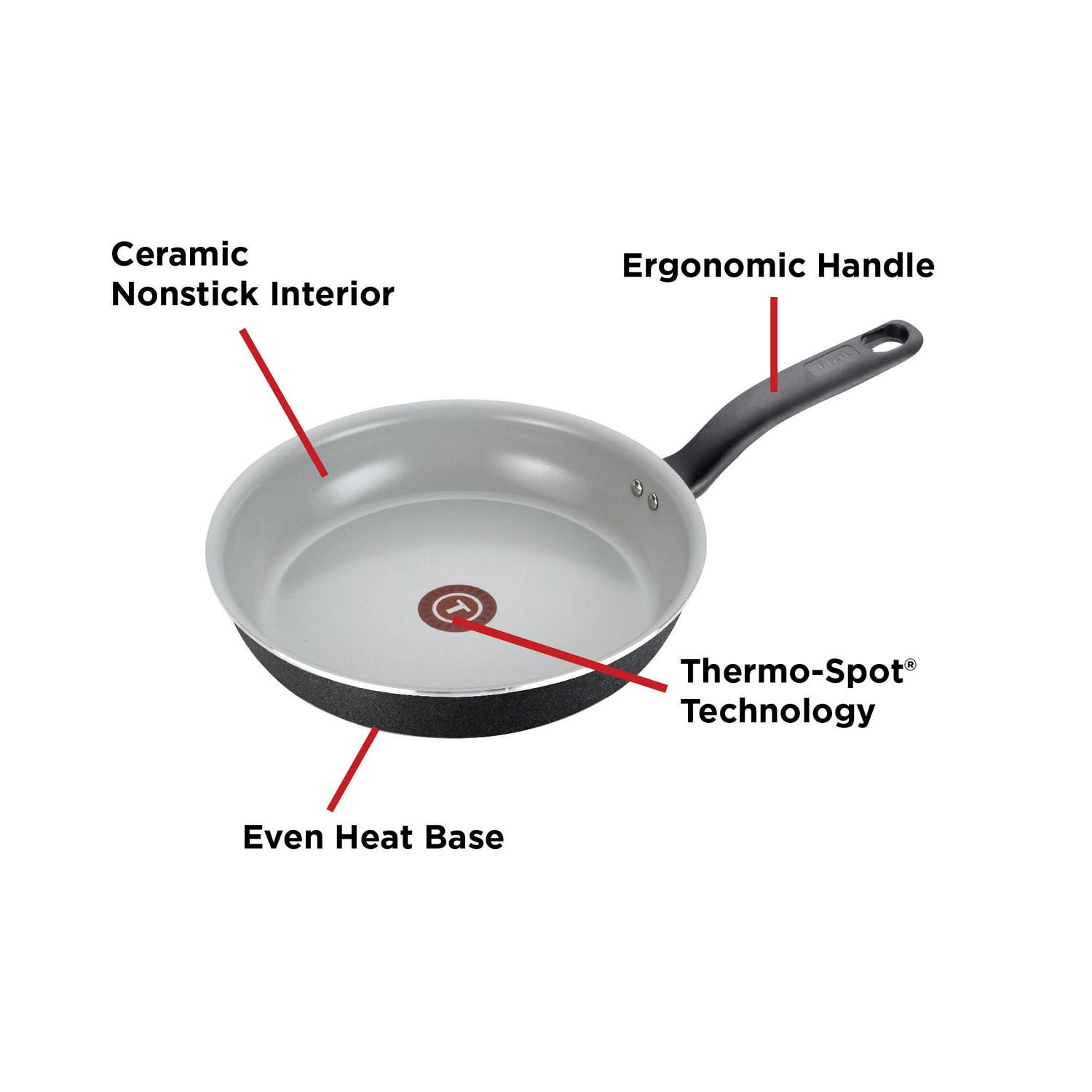 T-fal Initiatives Ceramic 14-Piece Cookware Set has a beautiful grey cooking surface and still makes it easier than ever to cook healthier, nutritious and delicious meals at home. The cookware s heavy-gauge aluminum construction and even heat base offer durable strength, efficient cooking and even heat distribution for reliably consistent results. The cookware s innovative grey ceramic nonstick interior provides easy food release and can handle high cooking-surface temperatures up to 570°F perfect for searing meat, fish, poultry, and more to delicious perfection. Ergonomically designed heat resistant handles provide a comfortable and secure grip and are oven safe to 350°F, while vented, tempered-glass lids offer at-a-glance monitoring. Dishwasher safe, the cookware cleans up in a flash.