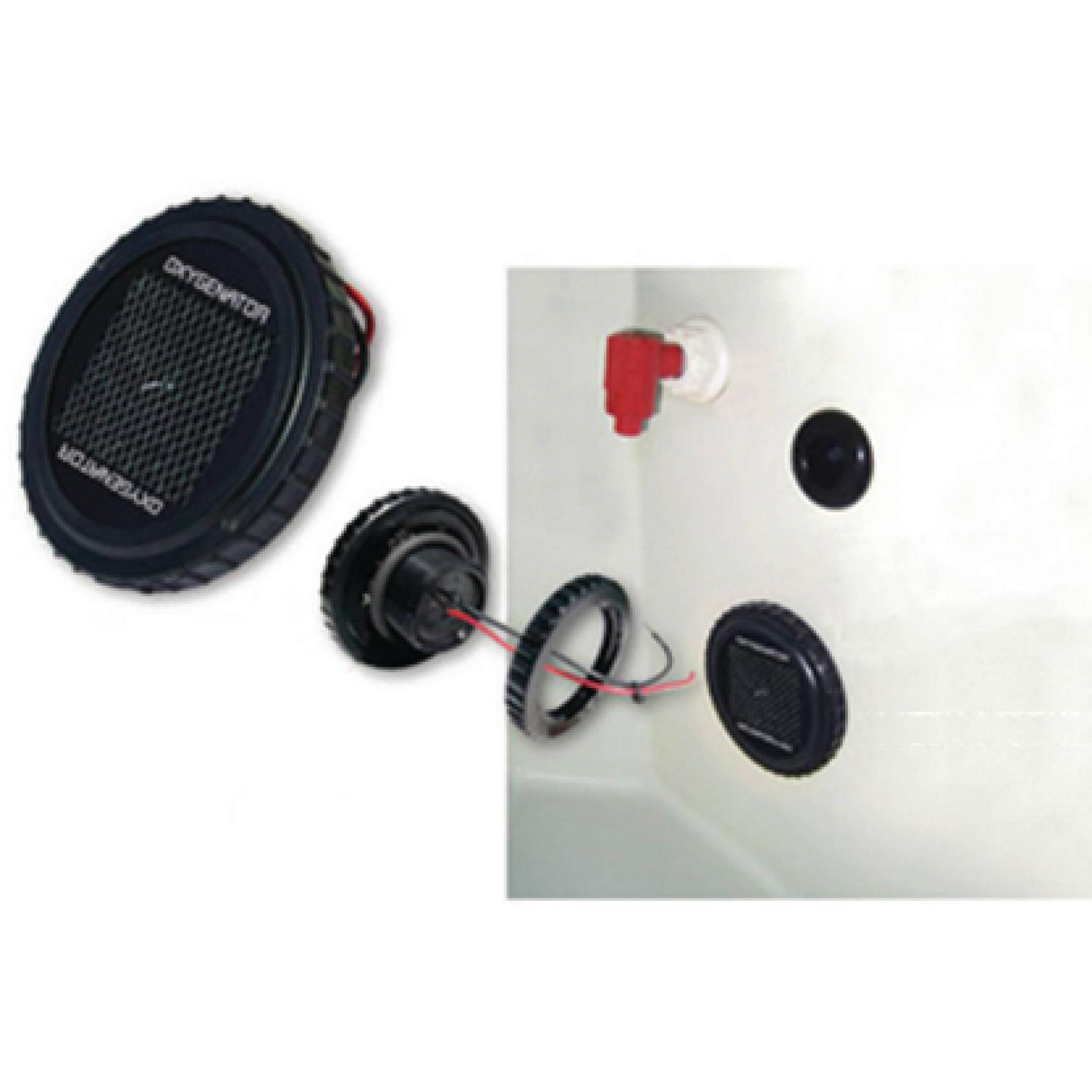 The Oxygenator Pro livewell Flush Mount will retrofit most boat livewells from 10 to 20 gallons and operates off the existing boat battery. The Oxygenator manufactures 100% pure oxygen by splitting the hydrogen molecule from the oxygen molecule in water. This creates a super-saturated oxygen environment, even in the warmest water. No switch required, automatically activated when livewell fills with water. Silent running. 12V DC drawing less than 1 Amp.