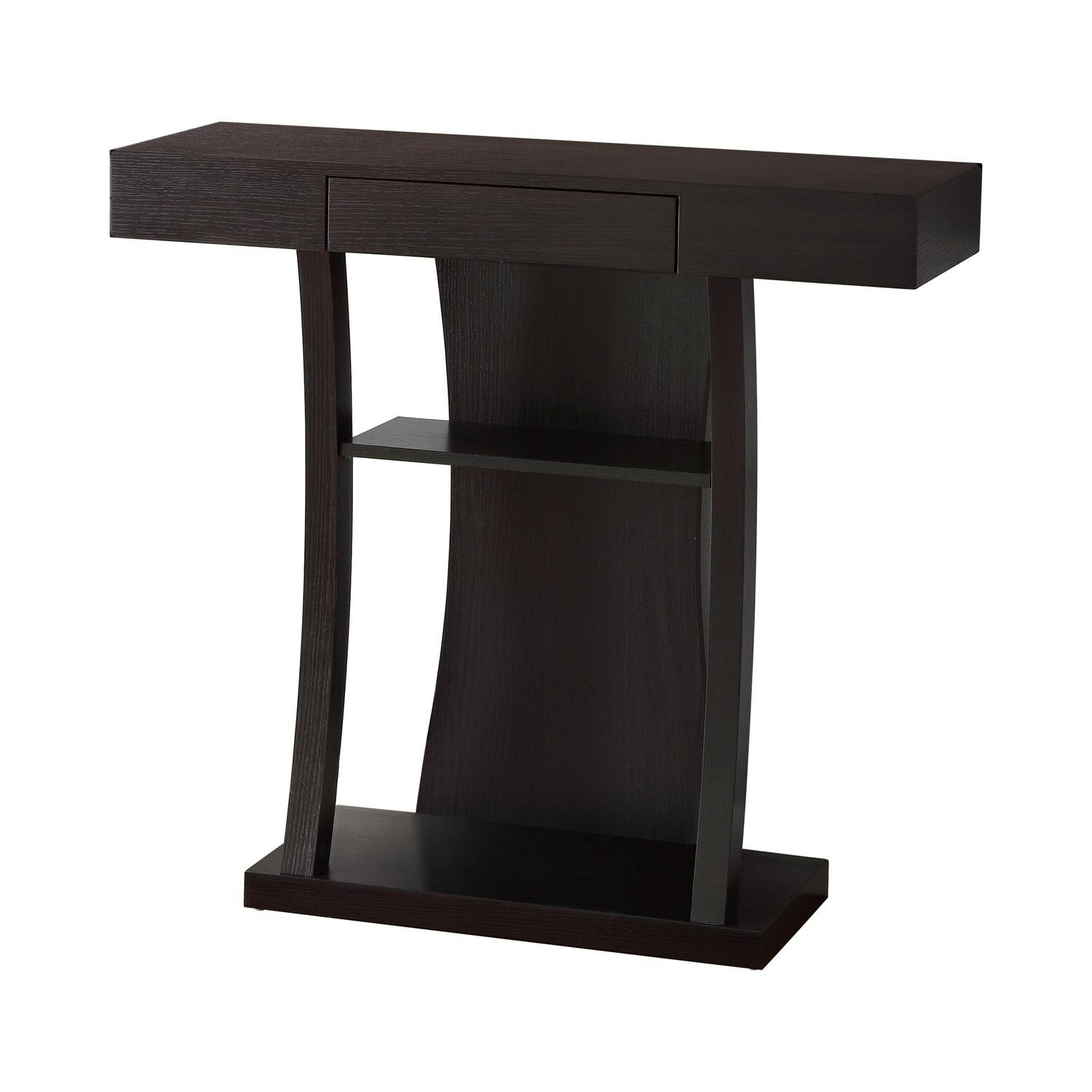 Accent your entryway or living space with this contemporary console table. Crafted with a unique “T” shape, it has a blocky design that is crafted with a deep cappuccino ( Brown)finish. There are two storage shelves for home accents and decor, and above, a small drawer offers room to tuck things away and out of sight. This is a lovely accent piece for any room in your home.