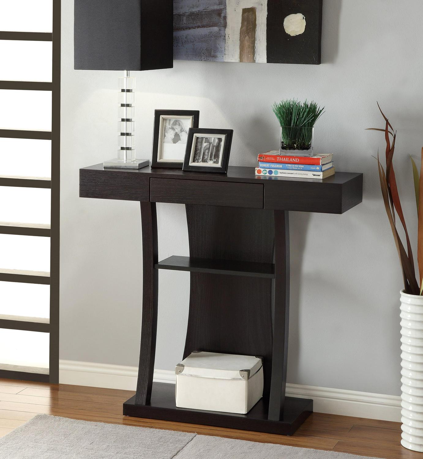 – Console table celebrates transitional style Hearty cappuccino finish displays strength One drawer and two storage shelves o er additional storage Made from engineered veneer Wood finish: Cappuccino Drawers: 1