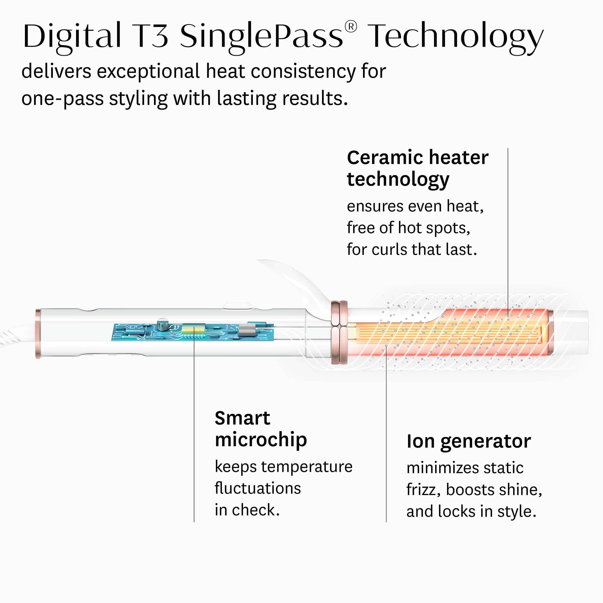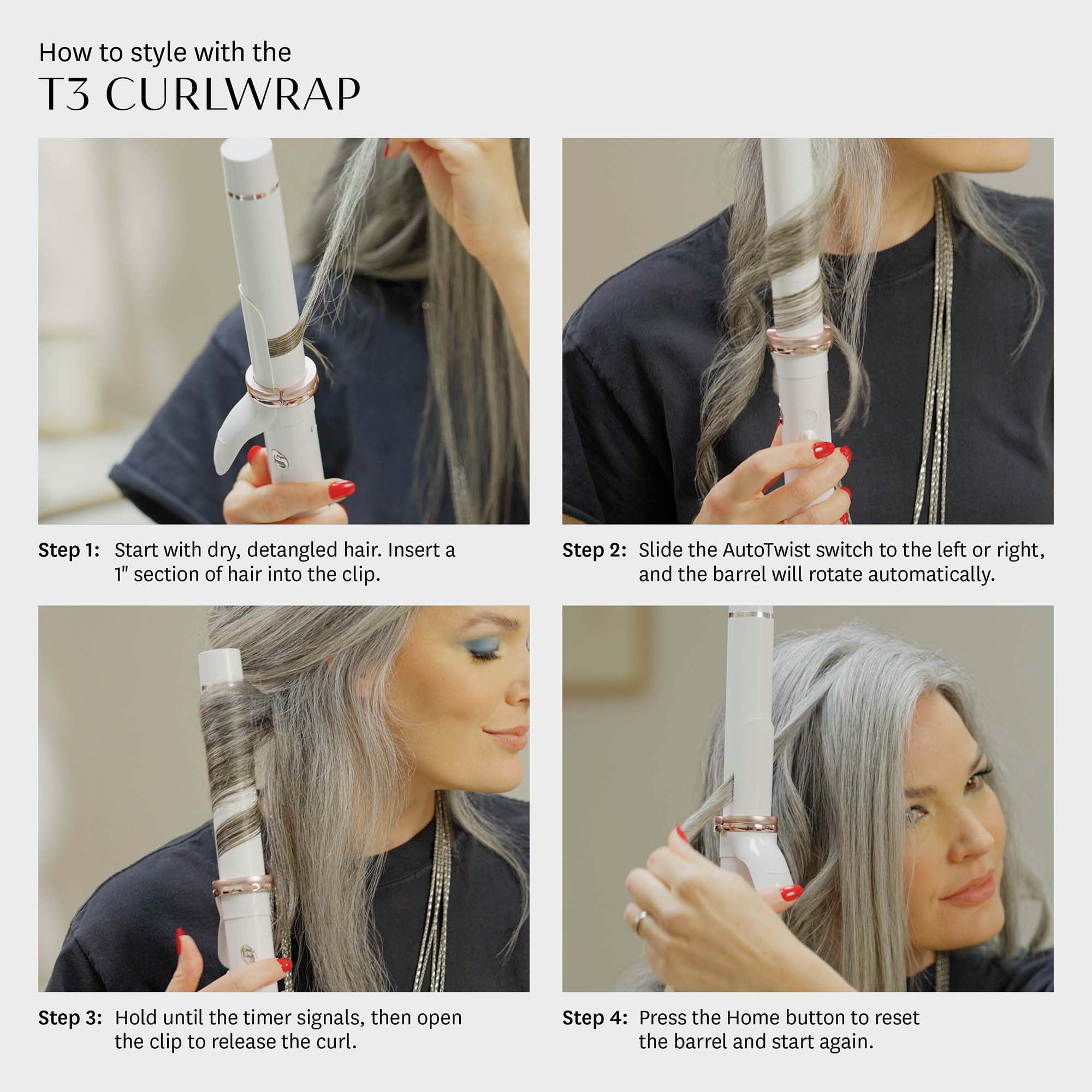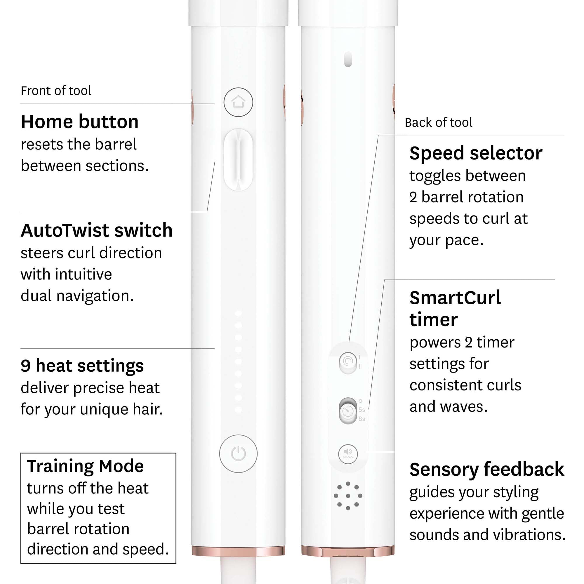 T3 AutoTwist Technology: Powers an automated, self-rotating barrel for effortless styling with flawless results. AutoTwist switch: Slides to steer barrel rotation with intuitive dual navigation. SmartCurl timer: Powers 2 timer settings for consistent curls and waves with minimized heat exposure. Sensory feedback: Guides your styling experience with gentle sounds and vibrations. Digital T3 SinglePass® Technology: Ensures exceptional heat consistency for one-pass styling with lasting results. 9 heat settings: Deliver precise heat for every hair type and texture. Ion generator: Minimizes static frizz, boosts shine, and locks in style. CeraGloss™ ceramic barrel: Glides effortlessly for smooth, shiny results. Speed selector: Features two barrel rotation speed options to curl at your pace. Training Mode: Turns off the heat while you test barrel rotation speed and direction. Home button: Resets the barrel between sections for instinctive styling. Long barrel: Delivers easy styling for all hair lengths. Hidden hinge: For a smooth, snag-free glide. Optimal clip length: Keeps hair secure without tangles or snags. Auto world voltage (100-240V): For use around the world (plug adapter needed). 1 hour auto-off: For safe styling and peace of mind. 8ft., 360° Professional swivel cord: For zero twisting, zero tangling, and easy maneuvering while you style. 2-year warranty: Comprehensive coverage and support options. T3 AutoTwist Technology: Powers an automated, self-rotating barrel for effortless styling with flawless results. AutoTwist switch: Slides to steer barrel rotation with intuitive dual navigation. SmartCurl timer: Powers 2 timer settings for consistent curls and waves with minimized heat exposure. Sensory feedback: Guides your styling experience with gentle sounds and vibrations. Digital T3 SinglePass® Technology: Ensures exceptional heat consistency for one-pass styling with lasting results. Smart microchip: Digitally controls heat settings to keep temperature fluctuations in check. Ceramic heater technology: Ensures even heat, free of hot spots, for lasting results. 9 heat settings: Deliver precise heat for every hair type and texture. Ion generator: Minimizes static frizz, boosts shine, and locks in style.
