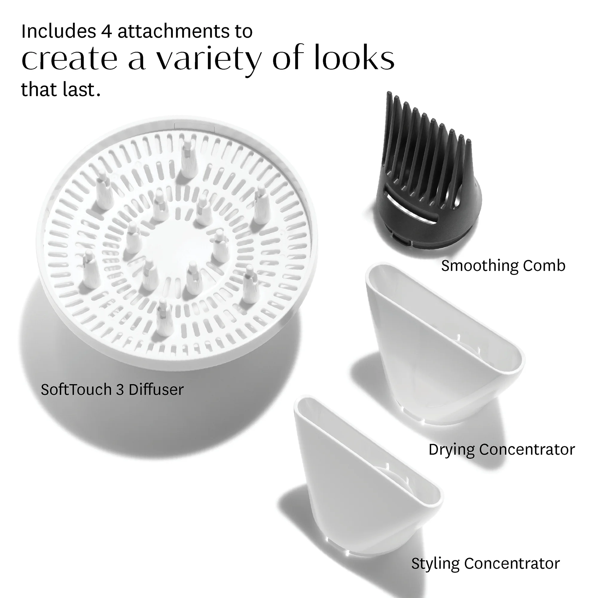 Meet your perfect heat match. The T3 Featherweight StyleMax professional hair dryer automatically customizes heat and airflow to your hair texture and styling goals for better results with less damage.* Optimized for every hair type, four attachments pair with four unique Style Modes to rough dry, smooth, diffuse, or volumize. Just input your hair texture, secure your attachment, and match up your Style Mode. Advanced T3 StyleMax™ technology will automatically adjust 5 heat and 3 speed settings to maximize your results and minimize heat damage. After your custom settings are locked in, Digital T3 IonAir™ technology powers a smart microchip to minimize temperature fluctuations and prevent over-drying. A custom-designed fan propels an organized airstream that’s 2x wider** for faster styling. And a powerful ion generator saturates hair with 10 million negative ions per second for a smooth, shiny, frizz-free finish. Up the style. Drop the damage. Other features include: Manual Mode; Volume Boost switch; Cool Shot; 9 ft. Cord with Cord Wrap; 2-Year Warranty. *Based on a third-party panel study of 101 participants, 96% experienced hair that looks and feels less damaged. **2x wider airflow refers to the 119% more total square millimeter area of open air output outlet of the T3 Featherweight StyleMax dryer using the T3 wide concentrator compared to the average square millimeter area of open air output outlet of five other leading premium hair dryers using their wide drying concentrators.
