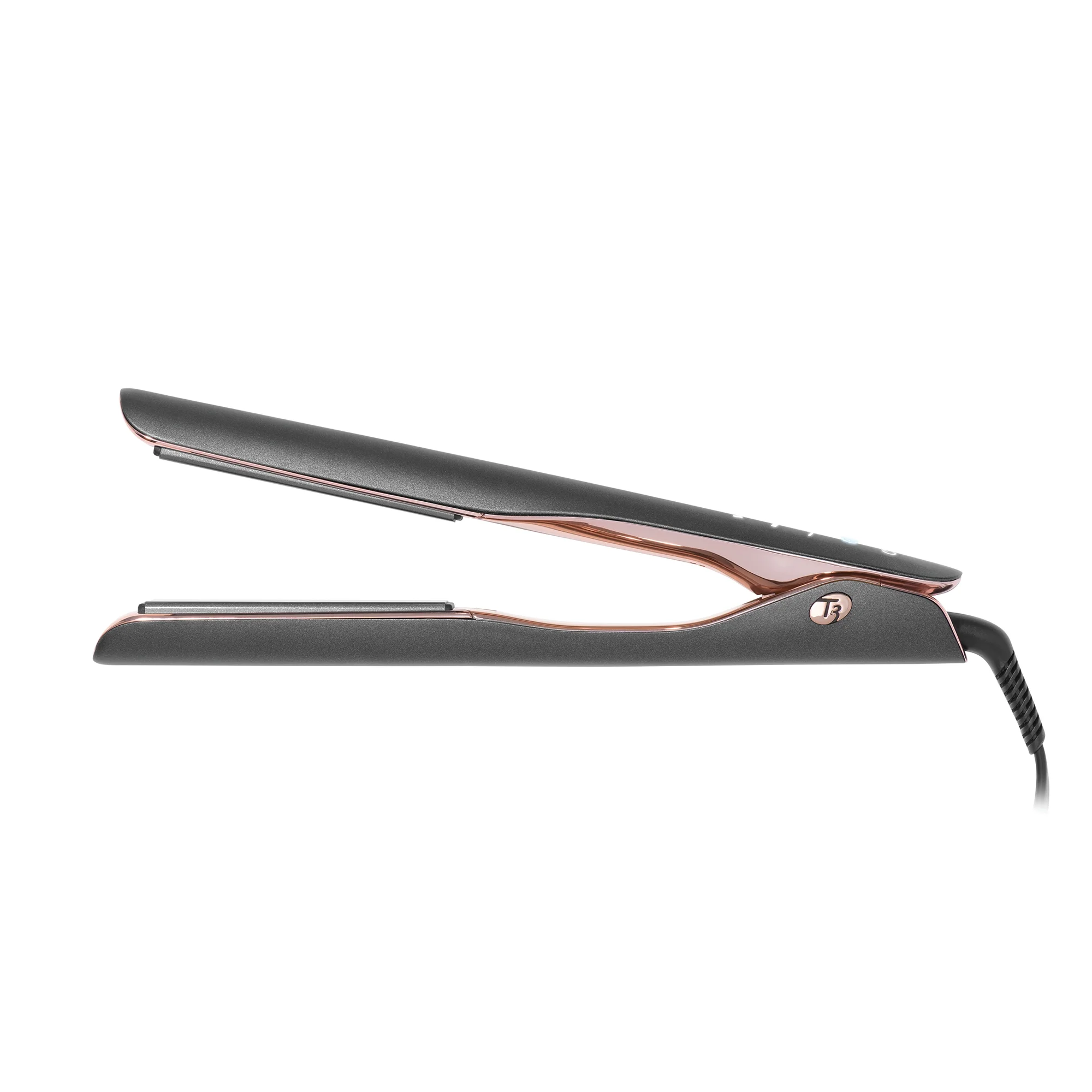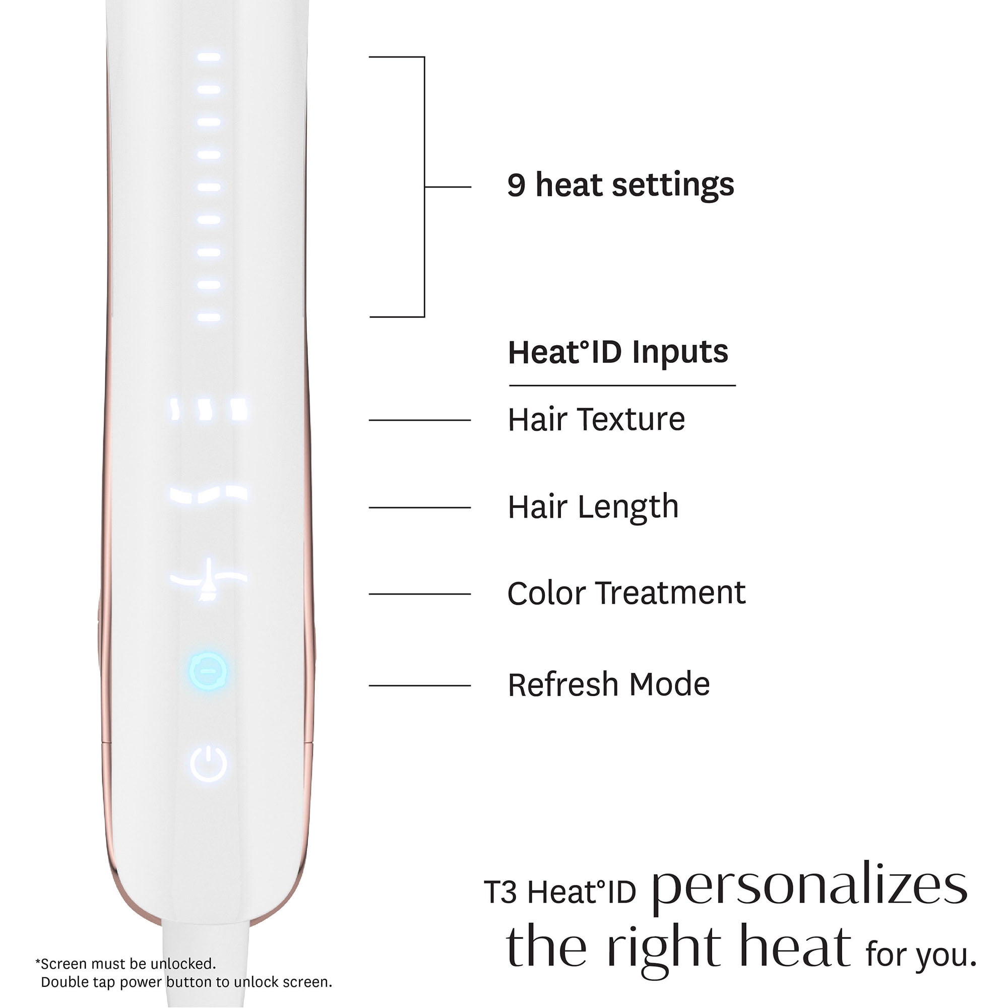 T3 HeatID Technology: Automatically adjusts heat to your specific hair needs, for protection against damage T3 Rapid HeatIQ® Technology: Ensures advanced heat precision for beautiful results in just one pass 9 Heat Settings: Deliver precise heat for every hair type and texture CeraGloss™ Ceramic Plates: For shiny, frizz-free and long-lasting styles Touch Screen/Auditory Feedback: For easy and intuitive setting selection Ion Generator: Minimizes static frizz, boosts shine, and locks in style Refresh Mode: Reduces heat levels to retouch and smooth previously styled hair with less heat exposure ThermaTouch® Technology: Superior insulation offers greater comfort and control during styling StyleEdge Design: Straightens, waves or curls in a smooth, snag-free glide Longer Plates*: Cover a wider surface of hair for fast styling PrecisionControl Hinge: Delivers optimal arm tension and plate pressure for increased styling control Auto World Voltage (100-240V): For use around the world (plug adapter needed) 1 Hour Auto Off: For worry-free styling 8ft., 360° Professional Swivel Cord: Prevents cord from getting tangled or twisted 2-Year Warranty: Comprehensive coverage and support options * Comparing to other standard T3 1” straightening and styling irons. T3 HeatID First-of-its-kind heat personalization designed to protect your one-of-a-kind hair. A smart-touch interface and 9 heat settings intelligently adjust to your unique profile based on hair texture, length and color treatments for smooth, shiny results with less damage.1 T3 Rapid HeatIQ® Engineered with a smart microchip, 9 heat settings, and CeraSync™ Heaters, T3 Rapid HeatIQ® delivers advanced heat precision for fast styling and beautiful results. Smart Microchip: Actively monitors heat fluctuations to ensure temperature consistency during styling. 9 heat settings: Deliver customized heat for every hair type and texture. T3 CeraSync™ Heaters: Evenly distribute and synchronize heat across both plates for fast, one-pass styling. Refresh Mode Automatically reduces your temperature to retouch previously styled hair with less heat exposure and a boost of negative ions for frizz-free, shiny results. ThermaTouch® Advanced insulation technology makes the arms of the flat iron more comfortable to hold. Grip the flat iron with confidence for more precise styling.