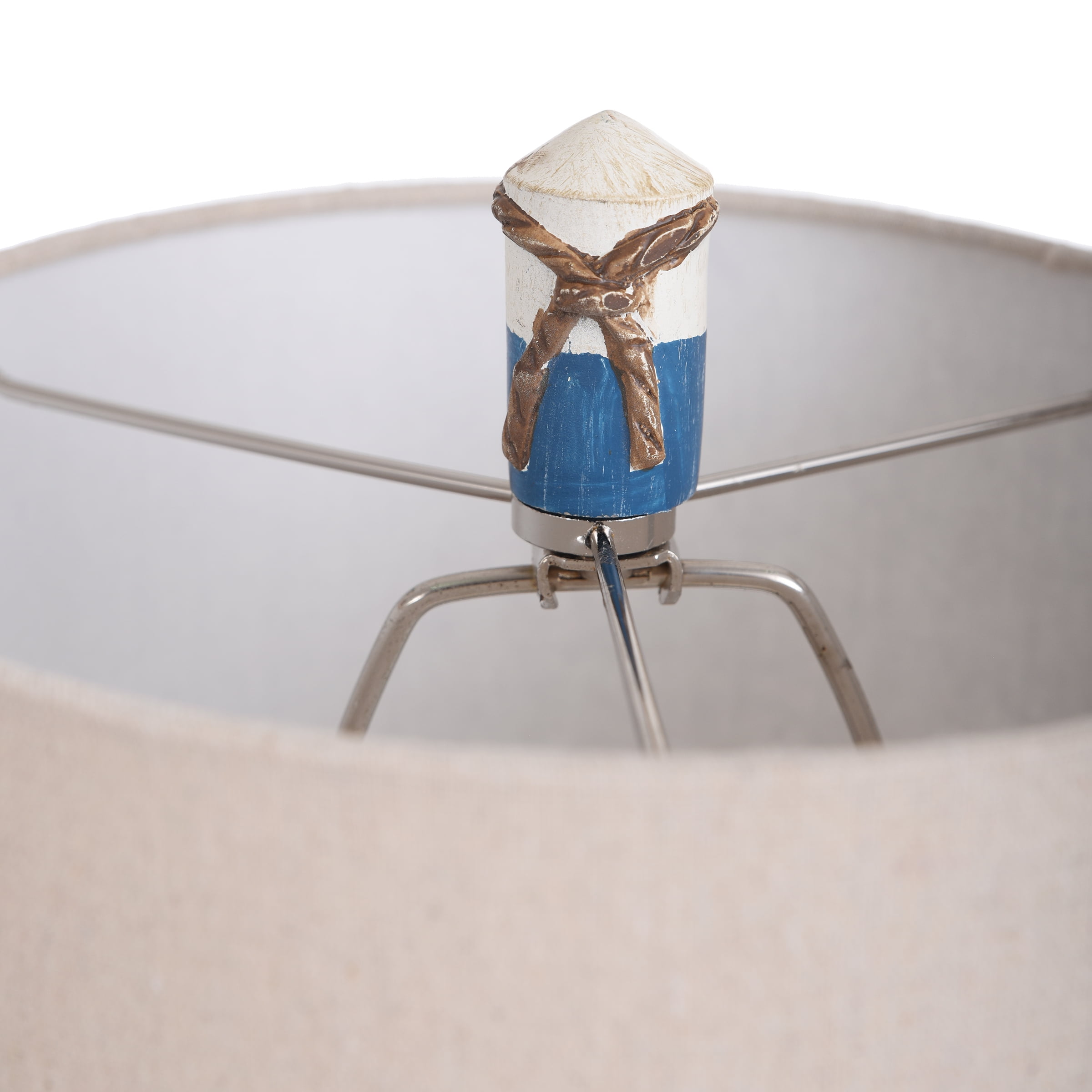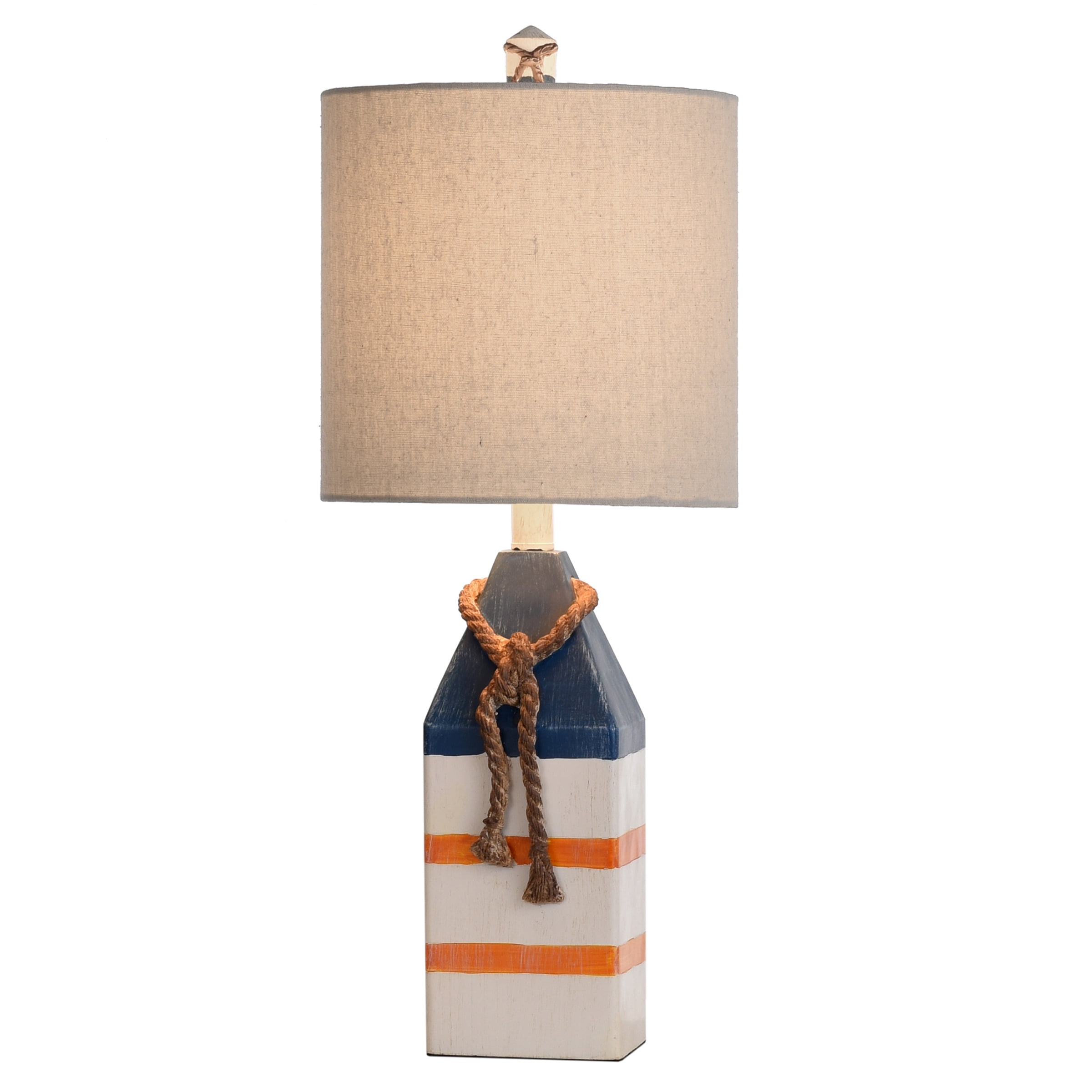 A nautical-inspired fixture for a bedroom, office, or hallway, this lamp features an off-white base with blue and orange stripes. Rope-like accents and a white hardback shade complete the look. Add this charming table lamp with its three-way functionality to coastal décor in a living room or dining room.