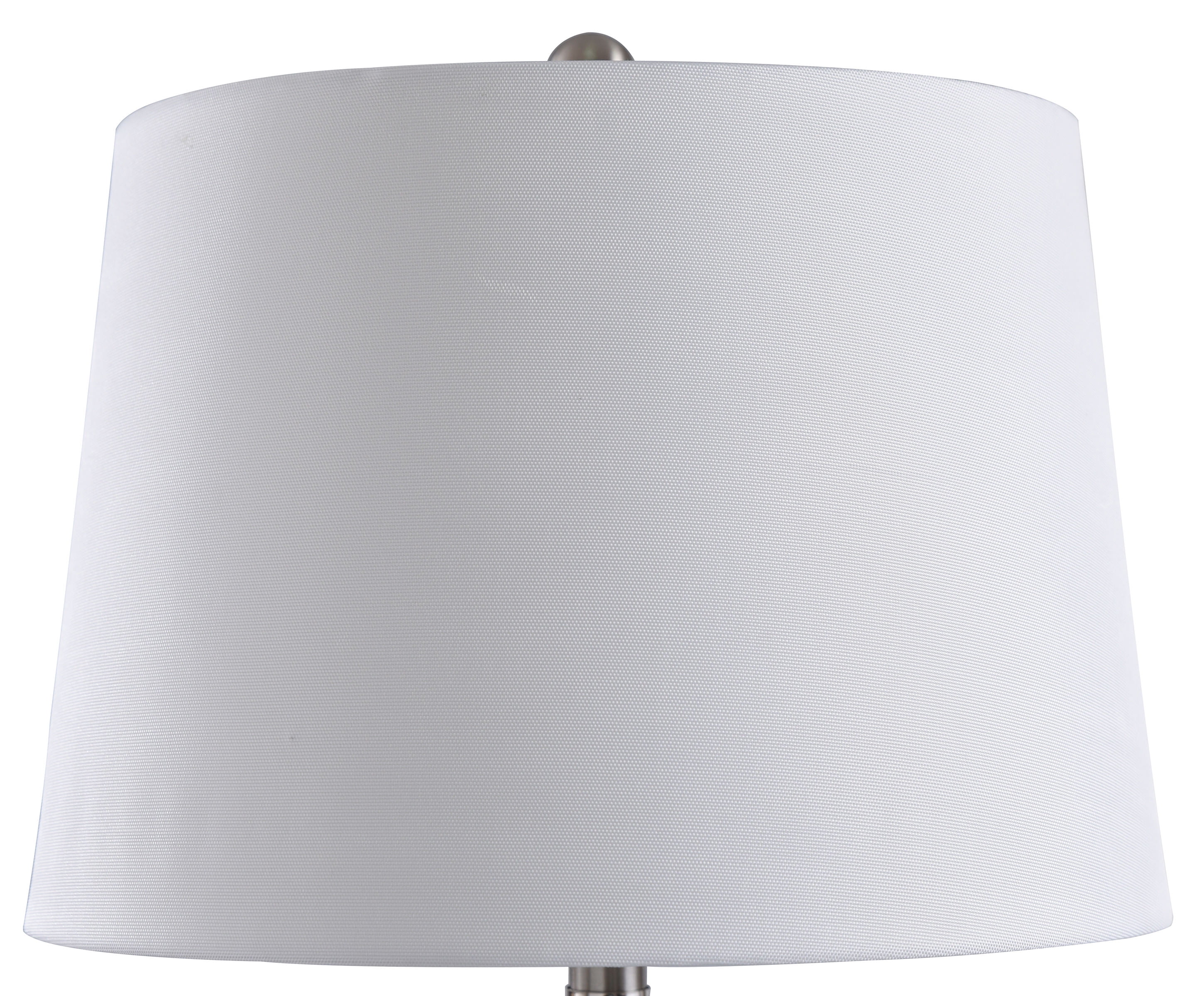 This metal and glass table lamp features a colorful finish. The shade is made from Prada white fabric and comes in a round, hardback design. All this rests on top of a round metal base, making it the perfect piece to flank a chair or sofa.