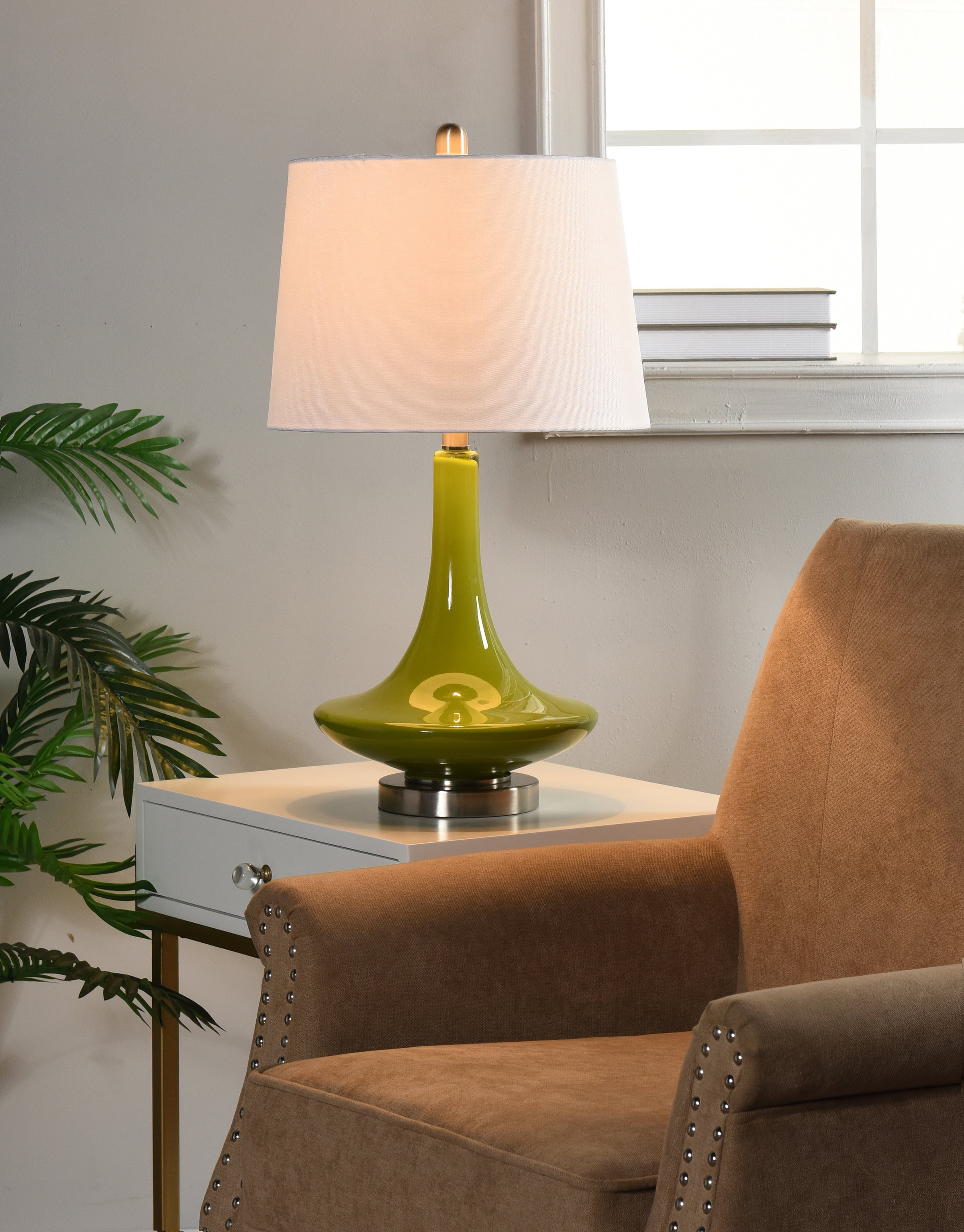 Table Lamp – White Hardback Fabric Shade – Green Finish