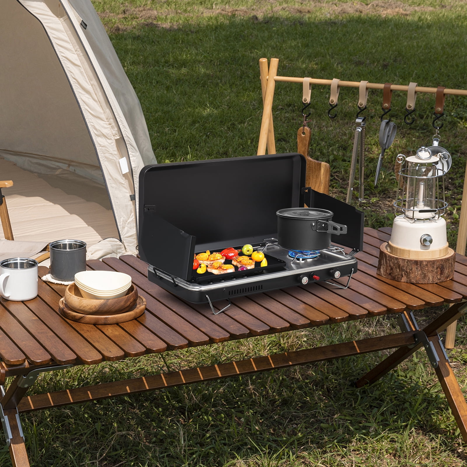 Zimtown 2-in-1 Gas Burner & Griddle Propane Stove Camping Portable Griddle Burner w/ Windpanel Package Includes:1 x 2-Burner Stove & Griddle Quality materials offer superior cooking performance, durability, and ease of maintenance, making them an excellent choice for both amateur cooks and professional chefs alike. Versatility at Its Finest: This innovative 2-in-1 product offers the flexibility to stand upright for backyard parties, gatherings on the patio, or entertaining in the garden.Lightweight and portable, it’s your ultimate companion wherever you go, whether grilling in your backyard or enjoying outdoor escapades. With its multifunctional design, it’s not just a stove – it’s your trusted ally for culinary adventures and outdoor fun.