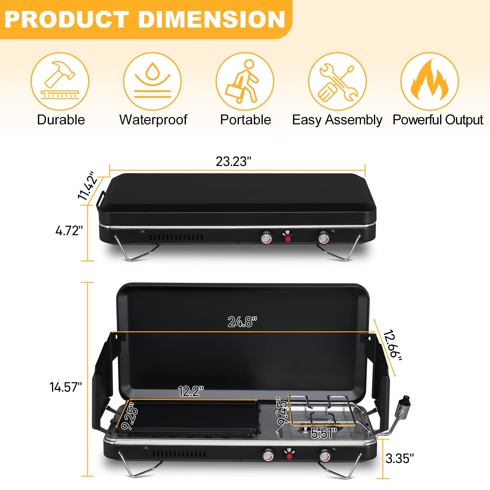 Restaurant-Quality Cooking: Elevate your outdoor cooking experience with our spacious flat top stove surface. Perfect for versatile cooking and gourmet food preparation, this grill lets you unleash your culinary creativity. Convenient Storage: Stay organized and efficient with our stove’s thoughtful design. Streamline your meal prep process and focus on creating culinary masterpieces. Precision Heat Control: Take command of your cooking temperature with two independent burners. Whether you’re searing, sautéing, or simmering, enjoy precise and varied heat zones across the griddle surface for perfect results every time. Specifications: Material: Iron, Stainless Steel Overall Dimensions: (24.8 x 9.25 x 14.57) in Folded Dimensions: (23.23 x 11.42 x 4.72) in If you have any questions, feel free to contact our customer service at any time.