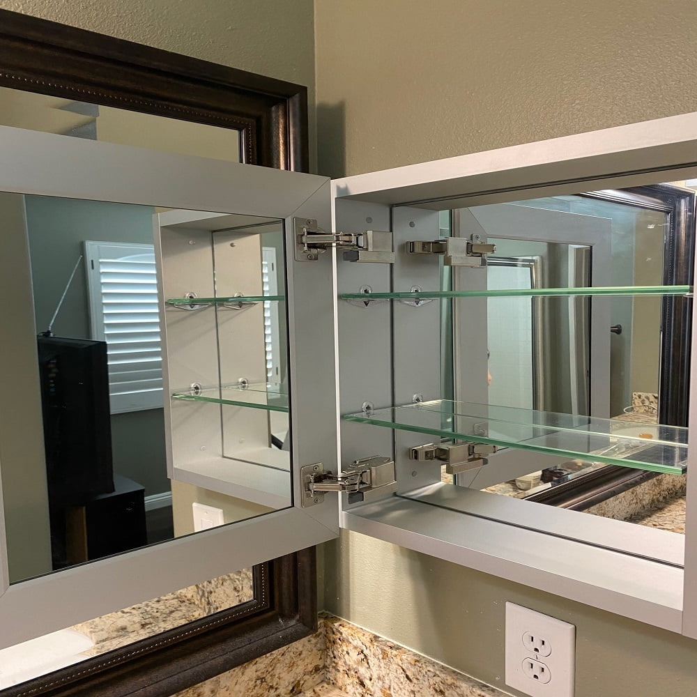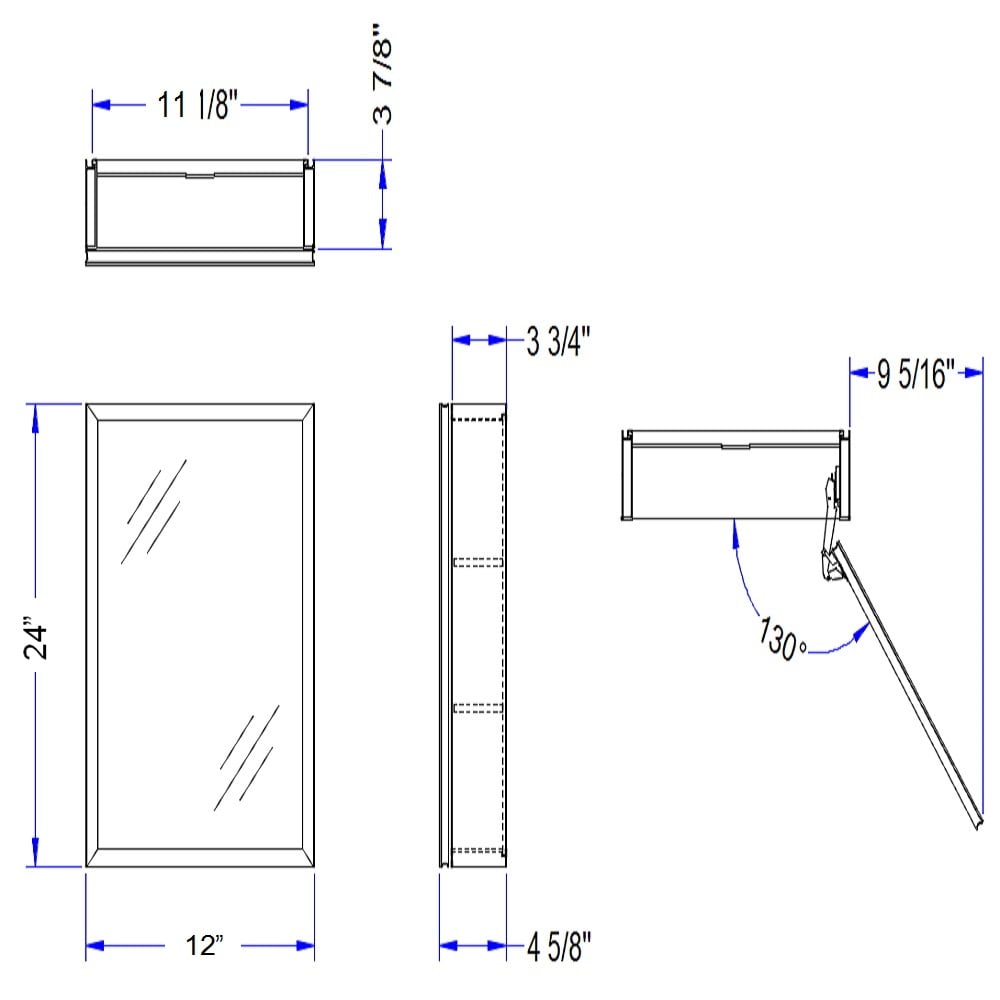 1. Constructed of premium aluminum and mirrored glasses, which is durable and promises a long service life 2. Size: 12” W x 24” H x 4.5/8” D 3. Interior mirrors 4. 2 Adjustable Glass Shelves 5. Polished beveled edge frameless mirrored door is reversible for left or right hand opening, fully mirrored inside the cabinet provides superior visibility 6. Our wall mount medicine cabinet design with soft close stainless steel hinge, which can prevent cabinet doors from slamming. 7. All of the cabinet organizers come with mounting hardware and screws, you can assemble it recessed or surface optional 8. Rust free, durable injected molded high impact polystyrene body/hinges and chrome frame, providing long lasting use 9. Sealed case design protects contents from wall cavity debris, and simple and quick recessed mount installation attaches securely10. 2 Years Warranty