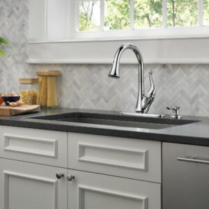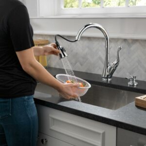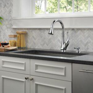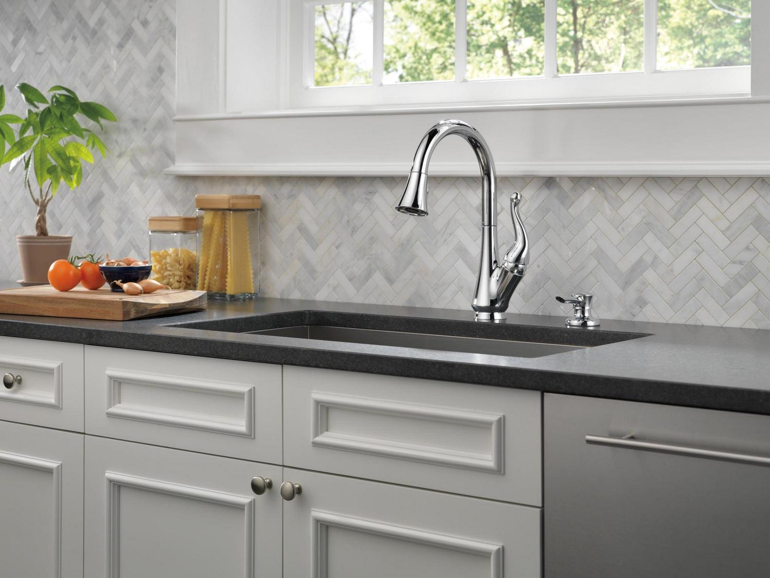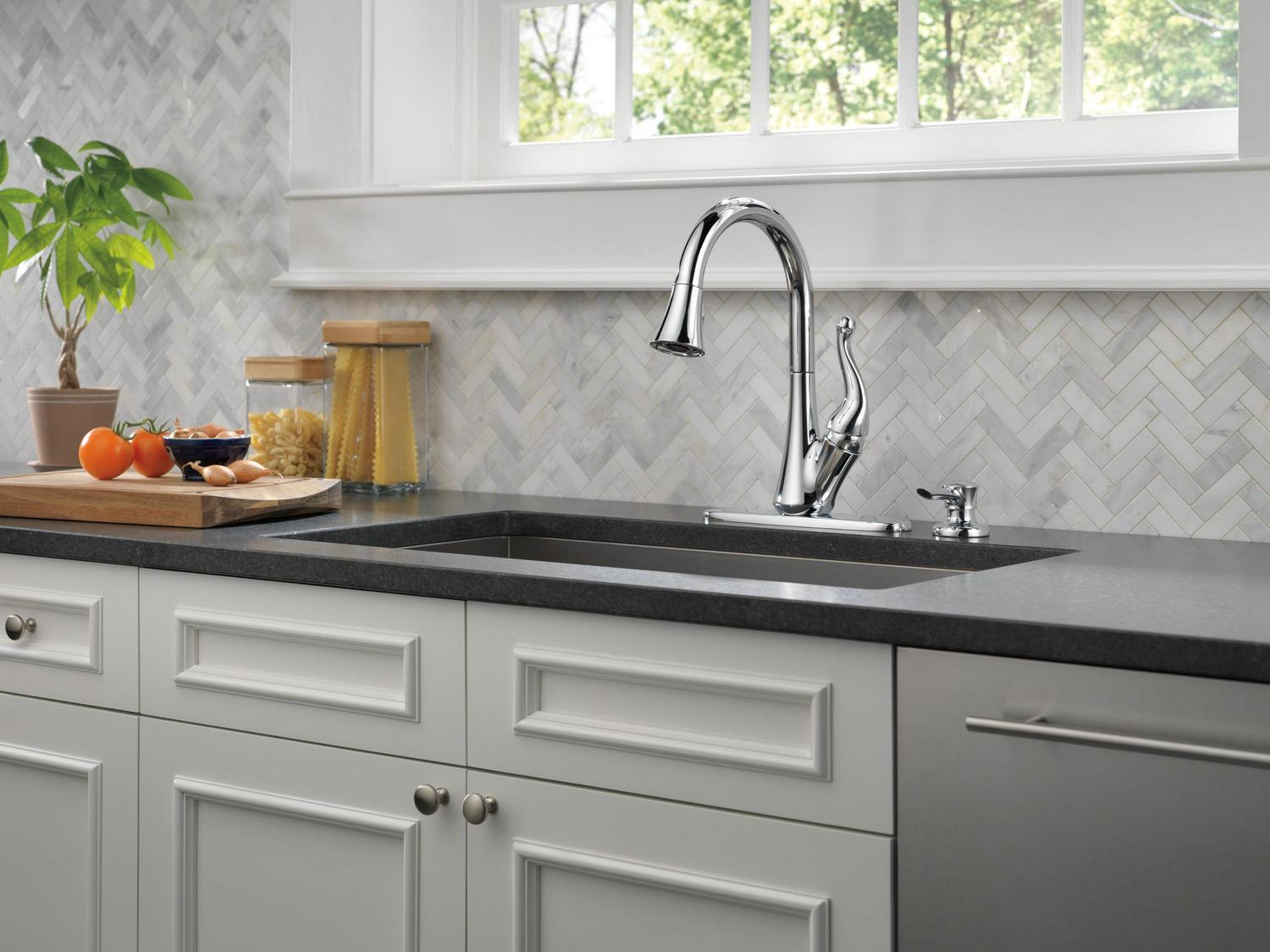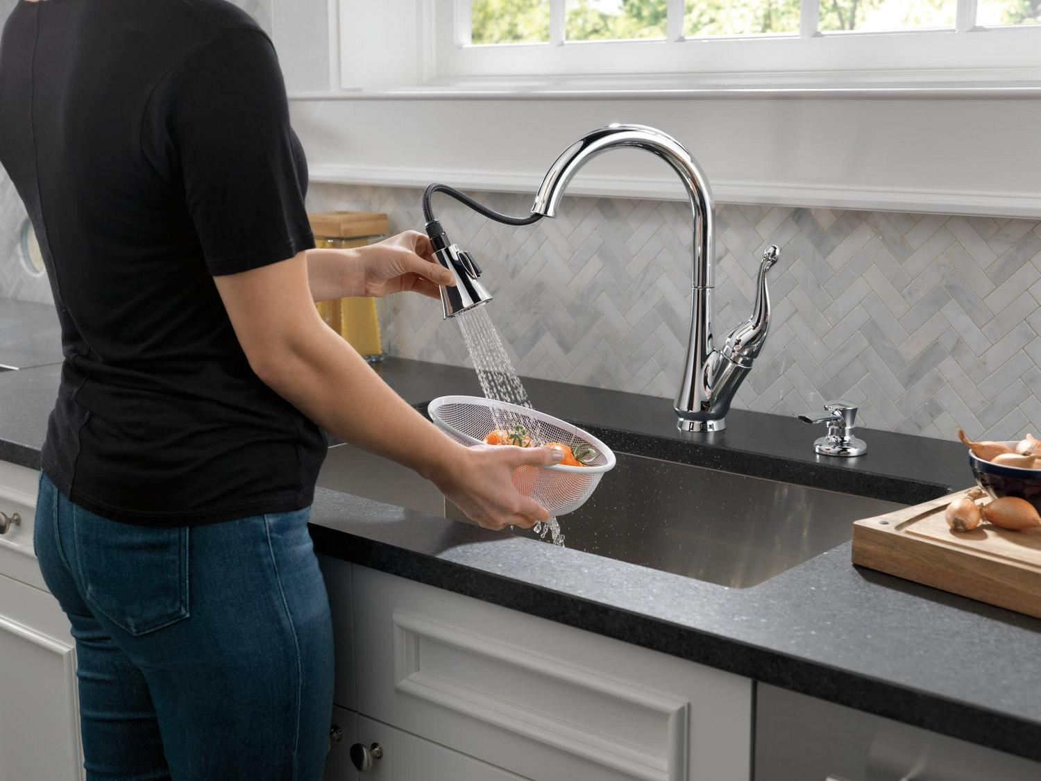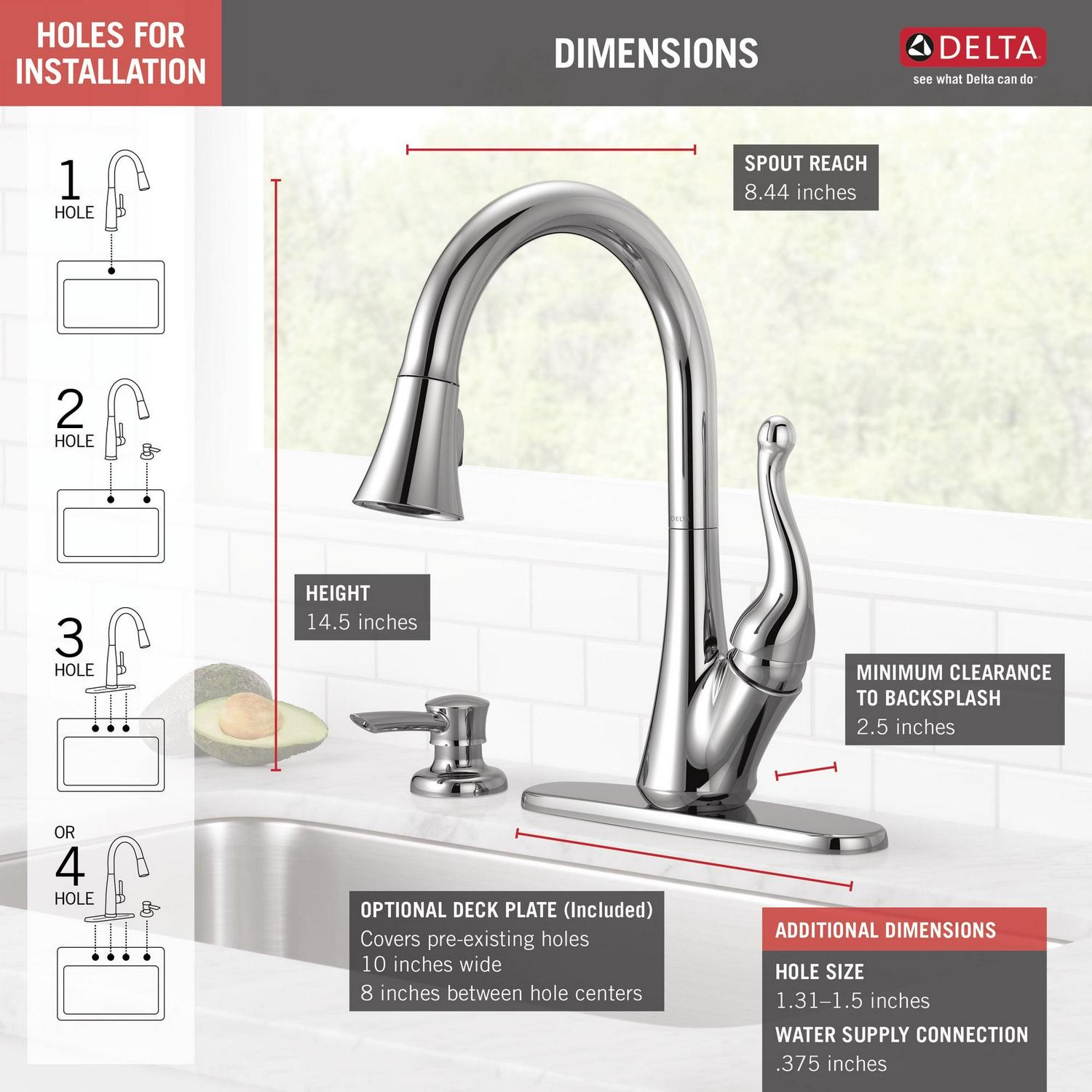 Delta MagnaTite Docking uses a powerful integrated magnet to pull your faucet spray wand precisely into place and hold it there so it stays docked when not in use. Delta ShieldSpray Technology cleans with laser-like precision while containing mess and splatter. A concentrated jet powers away stubborn messes while an innovative shield of water contains splatter and clears off the mess, so you can spend less time soaking, scrubbing and shirt swapping. Delta faucets with DIAMOND Seal Technology perform like new for life with a patented design which reduces leak points, is less hassle to install and lasts twice as long as the industry standard*. Kitchen faucets with Touch-Clean Spray Holes allow you to easily wipe away calcium and lime build-up with the touch of a finger. You can install with confidence, knowing that Delta faucets are backed by our Lifetime Limited Warranty. *Industry standard is based on ASME A112.18.1 of 500,000 cycles.