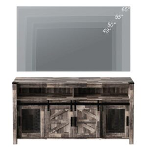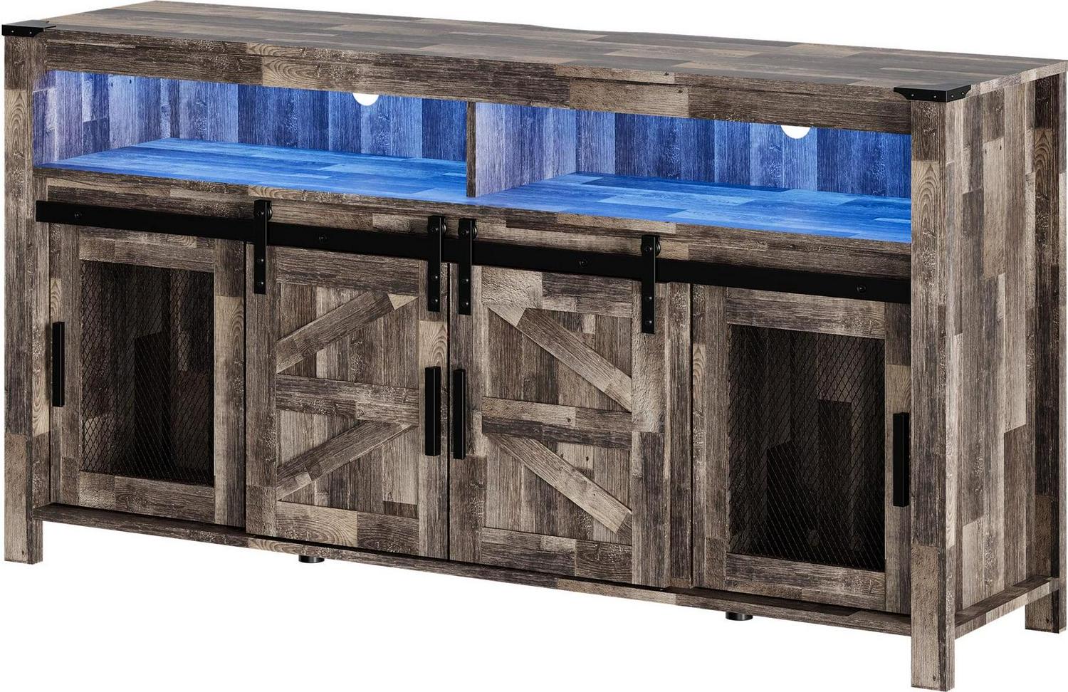 Tall TV Stand with Blue LED Lights Strips for 65 inch TVs, Farmhouse Media Console Table with Mesh and Barn Doors for Bedroom, Living Room, Dark Rustic Oak, 59×15.4×31