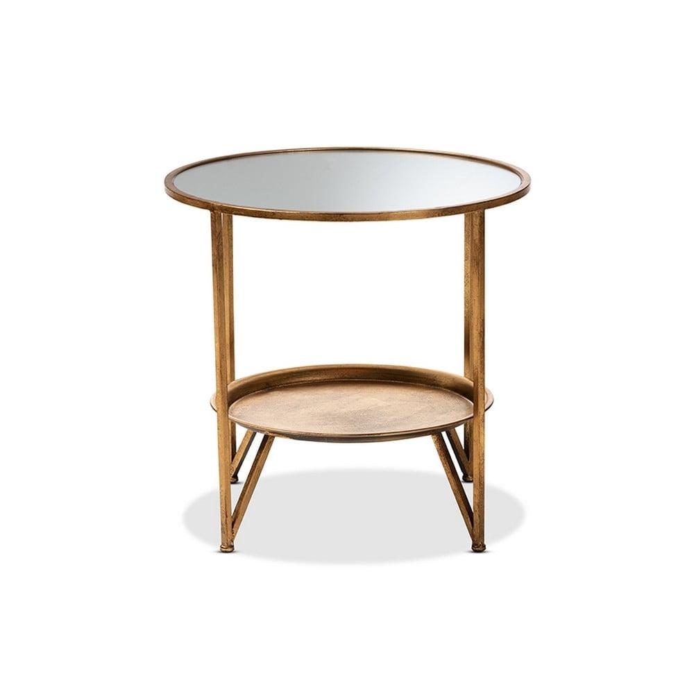 Tamsin Modern and Contemporary and Mirrored Glass Accent Table with Tray Shelf A fusion of both modern and traditional elements, the Tamsin accent table is a striking addition to any space. This durable metal table features a large mirrored glass tabletop with ample space to place a lamp and potted plant. Inspired by the round tray tables of Morocco, the Tamsin is fitted with a tray-style shelf for additional space to display books and decor. Antique gold-tone finish on the frame adds a charming vintage look. The Tamsin accent table is made in China and will arrive fully assembled.
