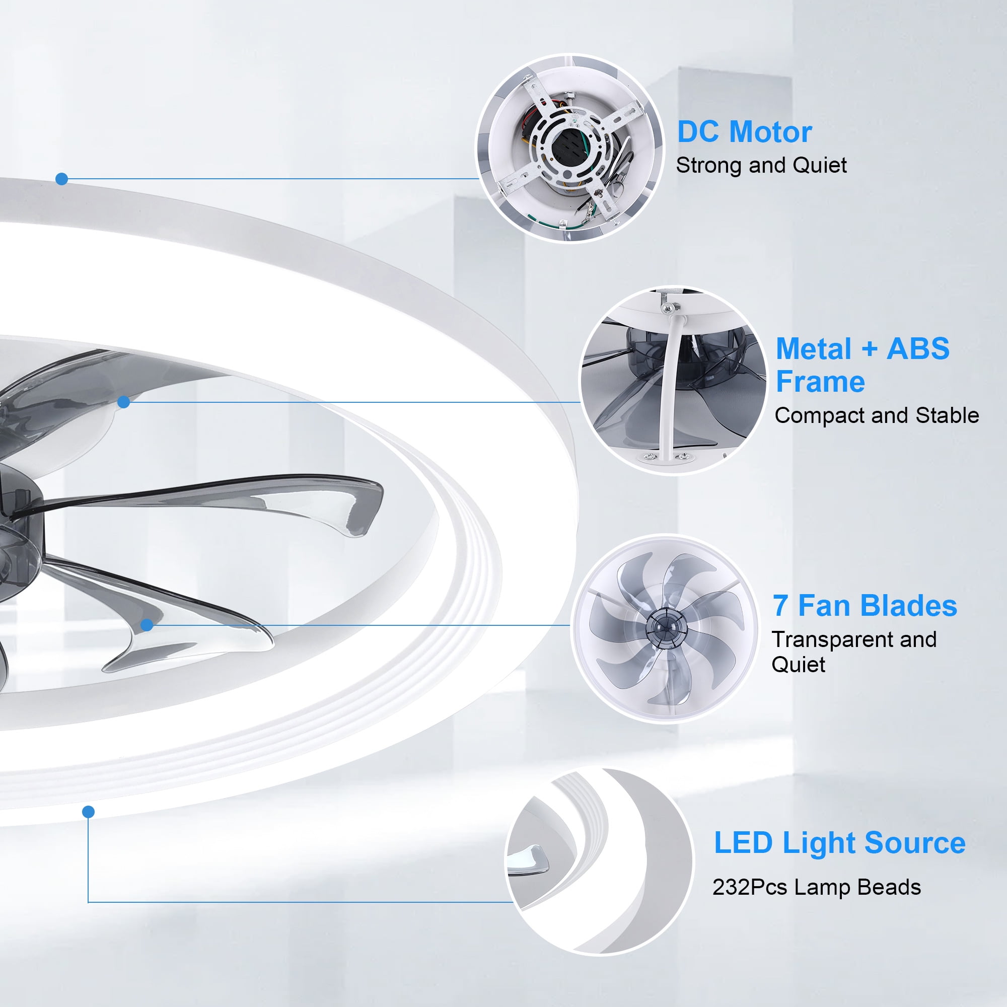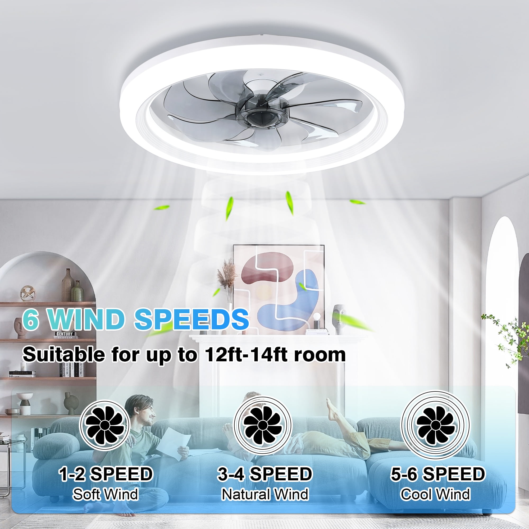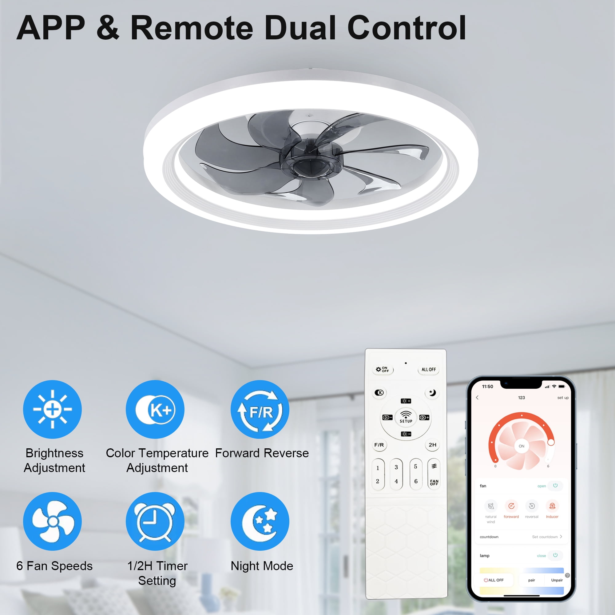 【2-in-1 Smart Ceiling Fan Design】 This flush mount ceiling fan combines adjustable LED light ring with a modern ceiling fan, adding a stylish and creative touch to your indoor space while providing low noise cooling. It’s an ideal dining room, kitchen, kid’s room, living room, bedroom ceiling fan selection. 【Remote and App Control】 Control your fan light with ease using the included remote control or through your smartphone app. The remote features a digital display for clear and immediate feedback on your settings. 【6 Wind Speeds & 7-Blade Design】 Enjoy optimal air circulation with our ceiling fan featuring 7 robust blades and 6 different wind speeds, ensuring a comfortable breeze for every season. 【Adjustable Color Temperature and Brightness】 Fine-tune your lighting to perfection with our ceiling fan light’s ability to adjust from warm light to cool white light across a range of 2900K to 6500K, along with brightness levels from 10% to 100%. 【Night Mode and Timer Function】 Designed for comfort and energy efficiency, this ceiling fan light includes a night mode and timer function, ensuring a restful sleep and saving energy. 【Noiseless DC And Reversible Motor】 Equipped with a premium copper reversible motor that operates at a low noise level of 35dB, providing a cool breeze in the summer and circulating fresh air in the winter. 【Easy Installation and Cleaning】 Designed with user-friendliness in mind, this ceiling fan light is simple to install and easy to clean, making maintenance a breeze.