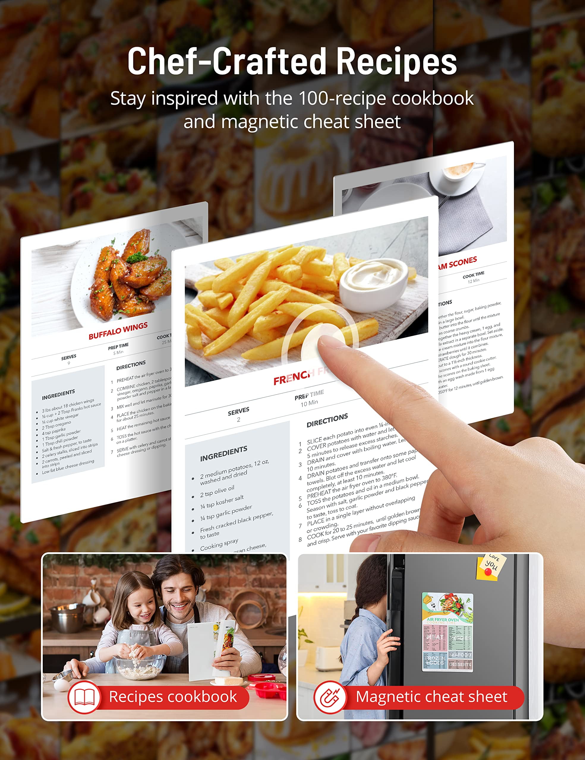 24-in-1 Combo: Unlike typical single-function air fryers or ovens, we elevate our product by offering 24 preset digital functions. These functions include Fry, Chicken, Steak, Bake, Roast, Broil, Dehydrate, Ferment, Defrost, Keep Warm, Slow Cook, Toast, Pizza, Cake, and more. This versatile 24-in-1 combination allows you to effortlessly prepare a variety of dishes, making your cooking experience more enjoyable than ever before. 26QT Family and Gathering-Size Capacity: TaoTronics Air Fryer Oven Combo stands out in the market with a 70% larger capacity. You can effortlessly roast a 5-6 pound chicken, toast 6 slices of bread, cook a large batch of French fries, grill 20 chicken wings, or bake a 12-inch pizza in one go. The increased capacity is ideal for family use, entertaining guests, or preparing meals, making it an indispensable multifunctional device in the kitchen. 360° Rapid Hot Air Circulation: The air fryer oven features a 1750W power and six heating elements, cooking food 40% faster than traditional ovens. With even heat distribution, it reduces preheating time by up to 30%, saving you precious time in the kitchen. It ensures food remains tender and juicy on the inside, retaining up to 35% more moisture for perfect texture and taste balance. Healthier Cooking with Less Oil: Our air fryer function serves as a healthy alternative to traditional deep frying, reducing fat by up to 75%. Enjoy all your favorite foods guilt-free, including french fries and other fried delicacies. With intense and efficient convection heating, our air fryer oven delivers perfect crispy and golden results every time. This ensures a perfect fusion of texture and flavor, guaranteeing a top-notch cooking experience. Intuitive Digital Controls: Easily set cooking temperature from 100°F to 450°F and time range from 1 to 120 minutes. With upgraded touch panel and knob design, our air fryer is easy to operate and quick to master. Comes with a cooking manual and magnetic recipe book containing 100 recipes, fulfilling all your cooking desires.