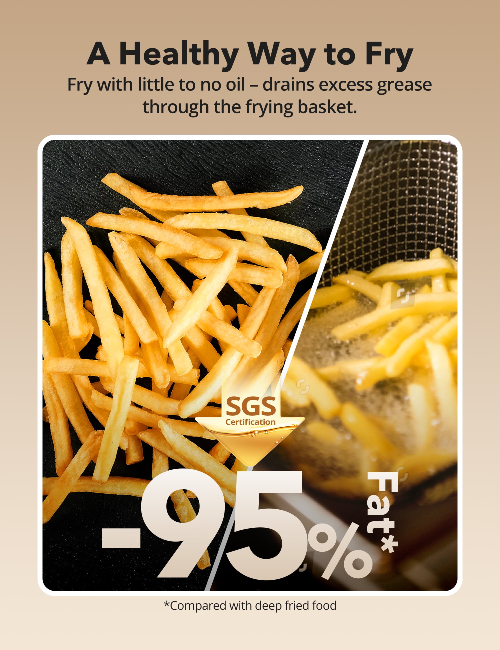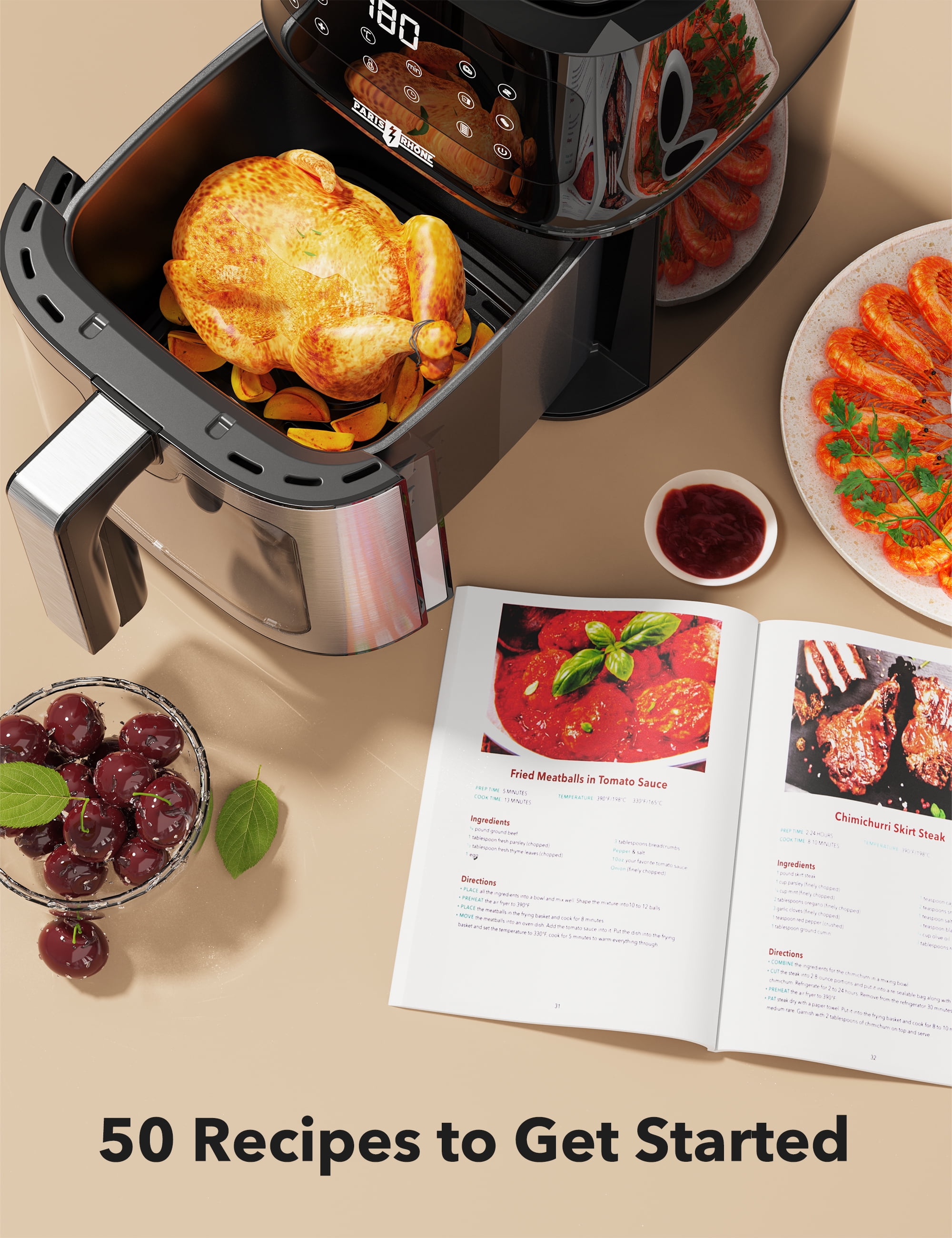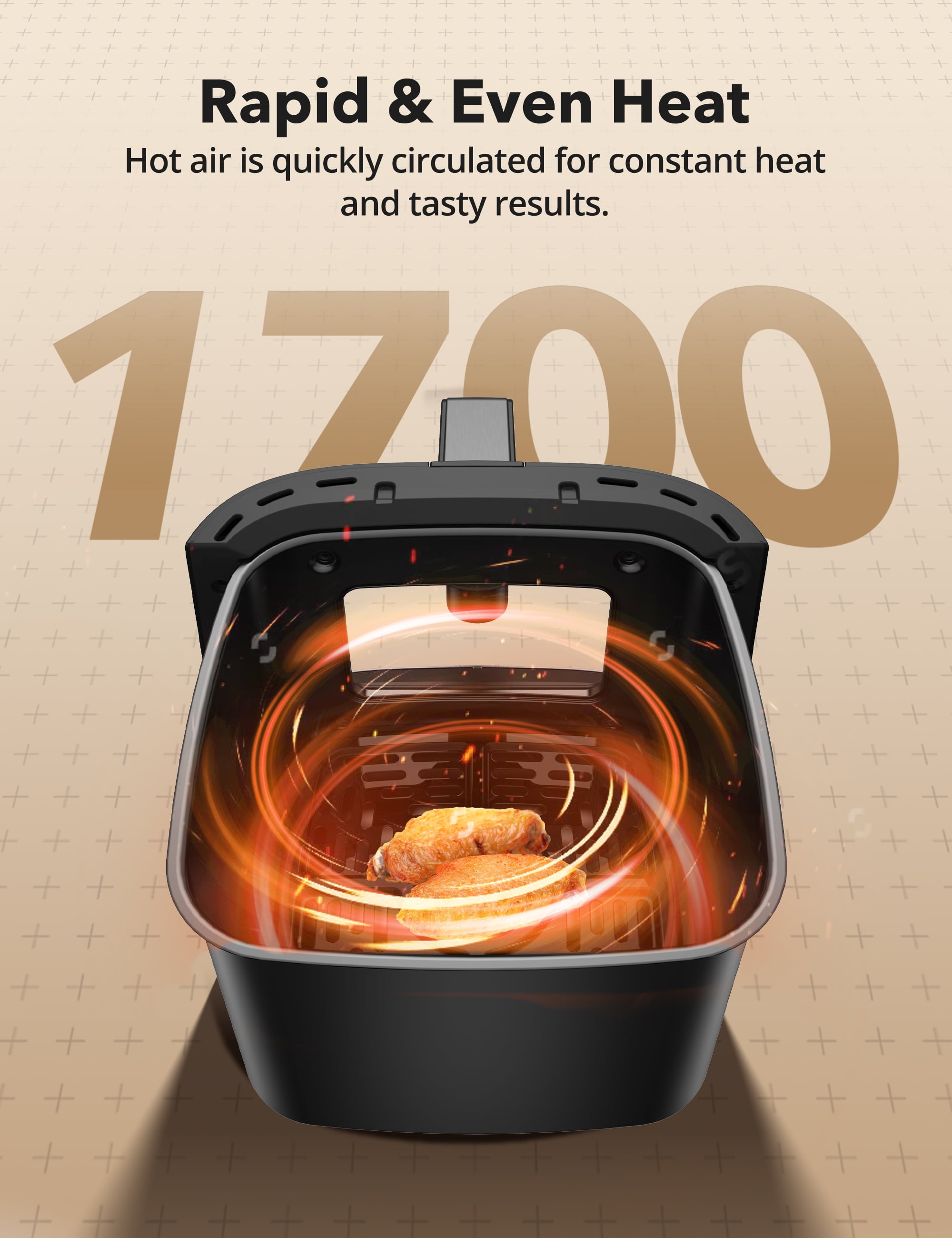Eight-in-One Versatility: The spacious 7.4-quart non-stick air fryer features an eight-in-one function menu, including options for French fries, fish, steak, cake, pizza, baked shrimp, chicken wings, and ham, catering to all your cooking needs 360° Hot Air Circulation for Even Heating: Our air fryer oven features top heating tubes with a 360° hot air circulation system, minimizing temperature differences between the top and bottom of your food for superior and uniform cooking results. With a wide temperature range of 180° to 400°F, it meets a variety of baking needs Healthier and Less Oil Option: Just a minimal amount of oil or even none at all is needed for frying, preserving the crispy texture of deep-fried food without enduring the high heat and oil smoke of traditional cooking. Reduce fat in your food by up to 90%, enjoying delicious meals without worrying about health issues Wide Temperature Range: With 1700 watts of power and adjustable temperature control up to a maximum of 400°F, it allows you to precisely control the cooking process to achieve the desired crispiness and browning level. Equipped with a visible window, you can monitor the status of your food at any time Dishwasher Safe: The non-stick cooking basket and detachable components make cleaning a breeze. Spend less time scrubbing and more time enjoying delicious meals