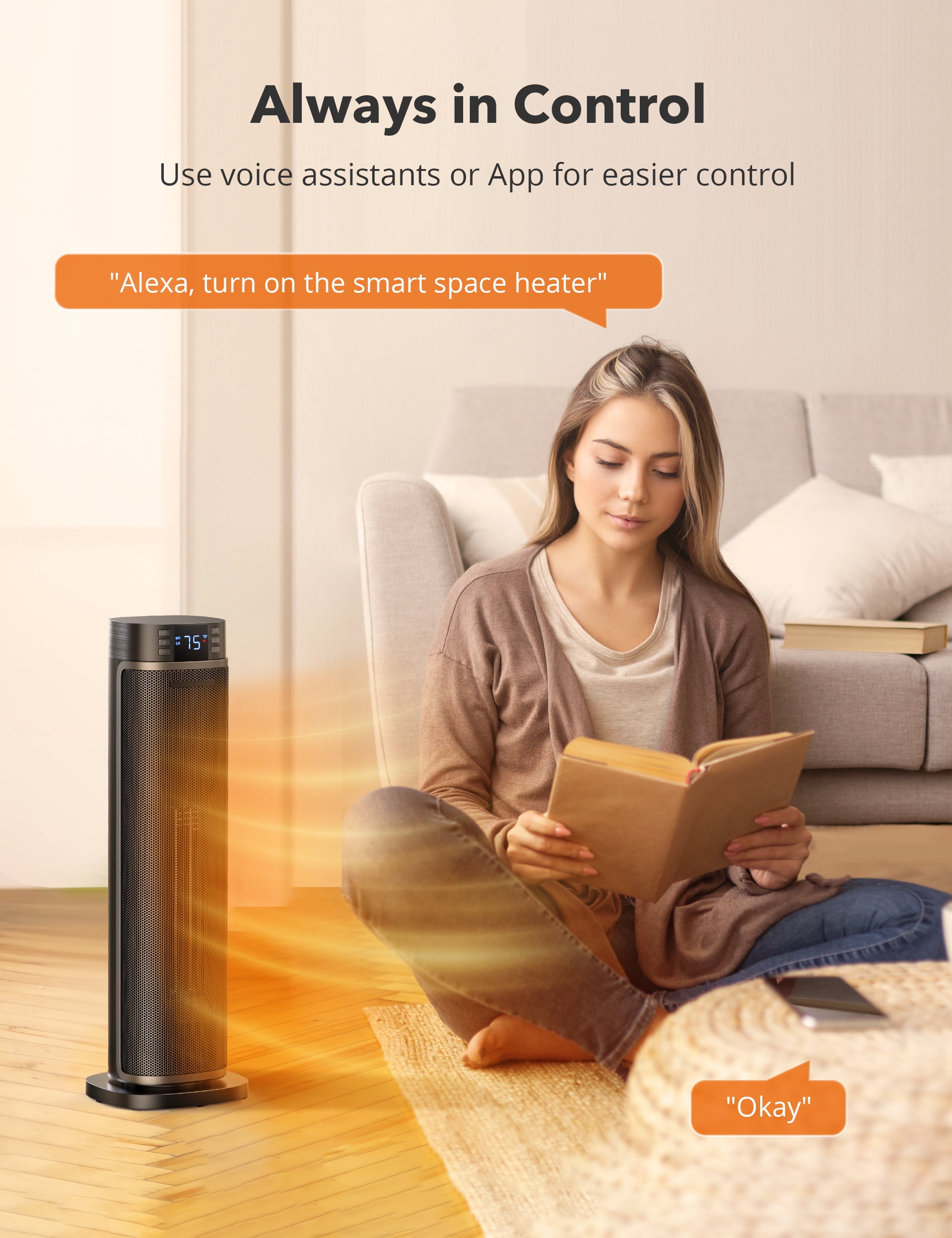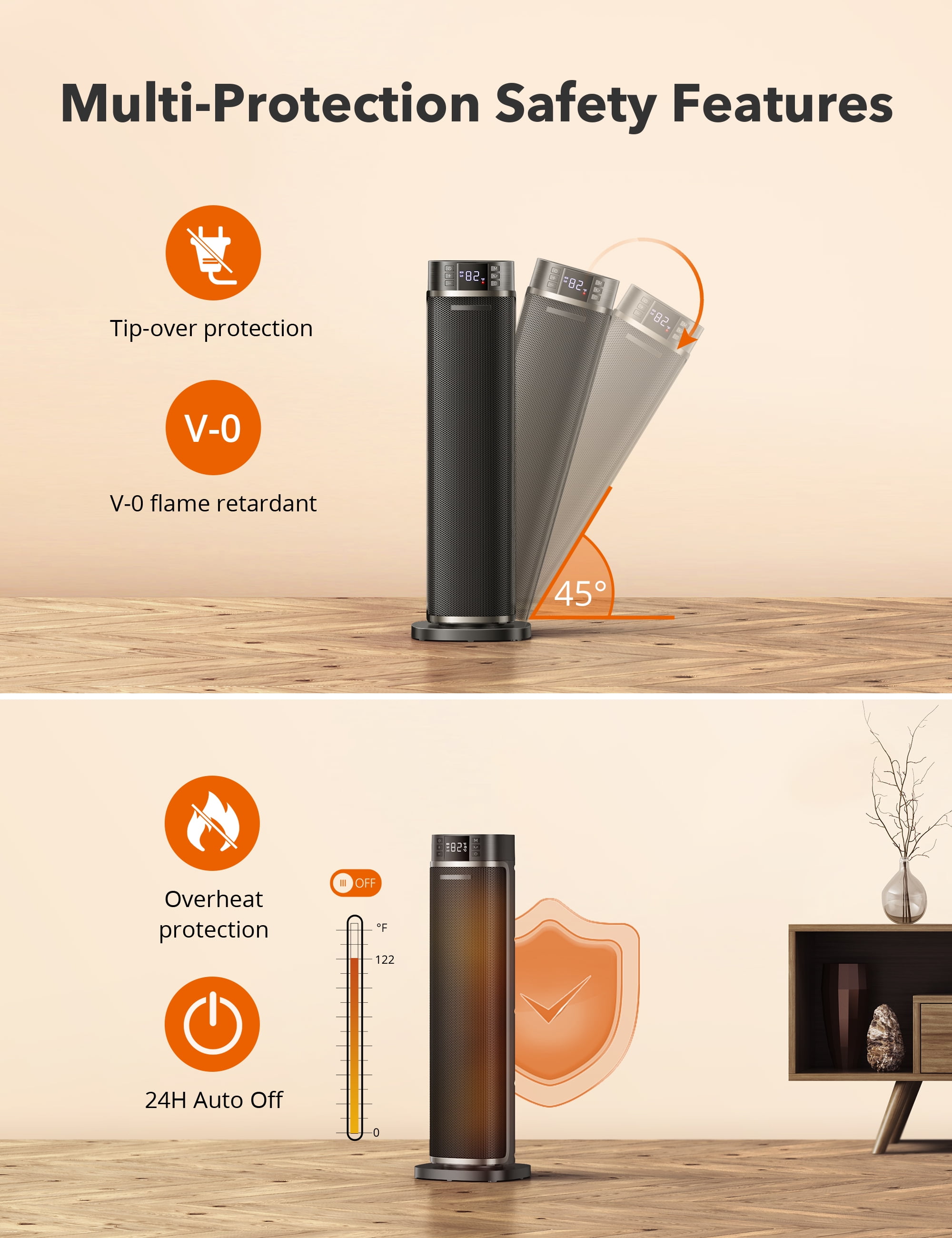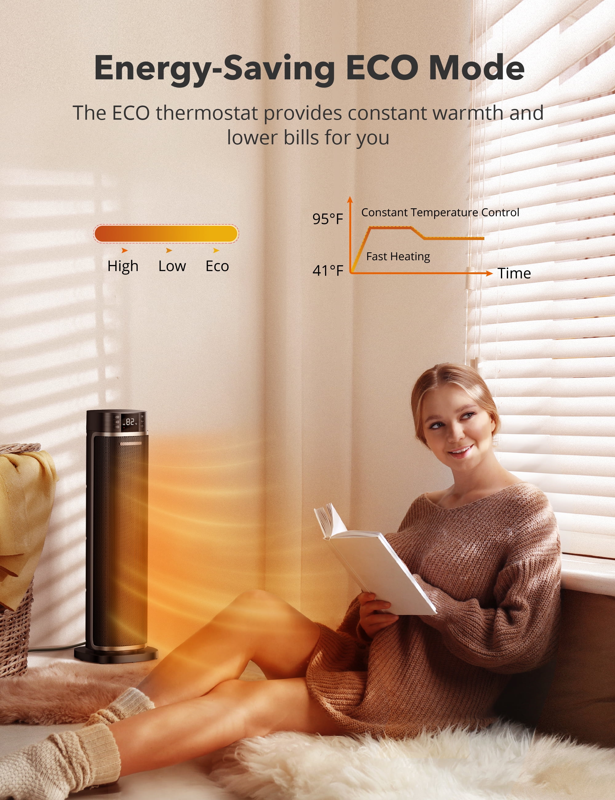 ☀️Space Heaters for Home Large Room Energy Efficient: Large curved heater with advanced ceramic heating technology generates more effective, consistent and immediate warmth for your surroundings. ☀️Personalized Comfort: Use the floor heater freely customize the heating mode (High/Low/Eco) and temperature (41-95°F) to maintain a pleasant warmth in your room. ☀️Widespread Oscillation: 65° oscillating tower heater rotates from side to side to evenly distribute warm air to different parts of your room for optimal comfort, it’s a perfect space heaters for home large room. ☀️Space Heater with Remote Control: Easily control all settings (heating modes, timer, oscillation, temperature) at your fingertips with a multi-function remote control as you lie on your bed or couch. Preheat via APP control for instant comfort upon arriving. ☀️Safe & Reliable: PTC large room heater for home features V-0 flame retardant material, overheating protection and a tip-over protection safety switch so you can enjoy comforting warmth securely.