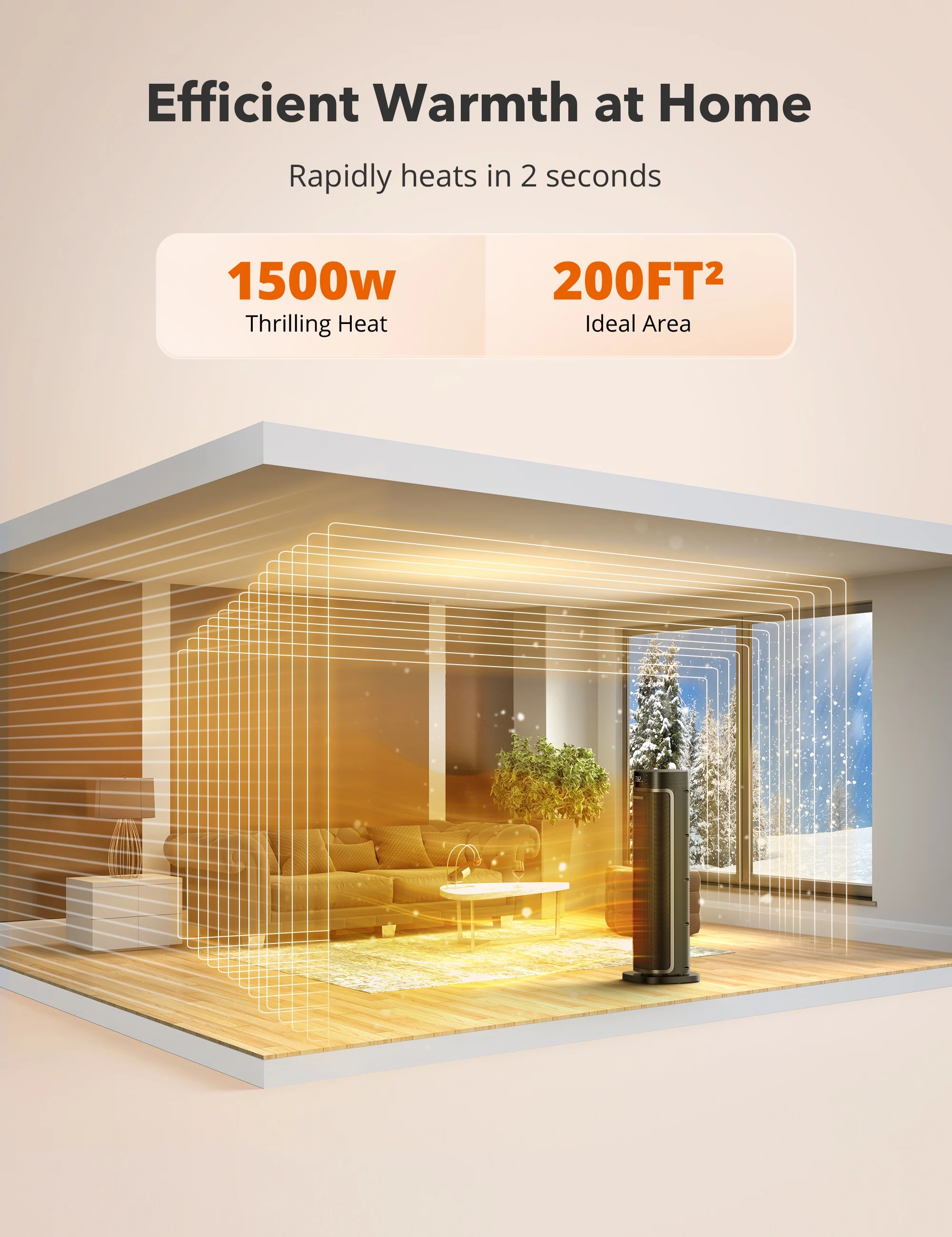 • Fast Heating: 1500W PTC for quick warmth • Safety protection with overheat & tip‑over switch • Save on energy bills with ECO Mode • Noise‑free experience with <50dB • Simple operation with remote control