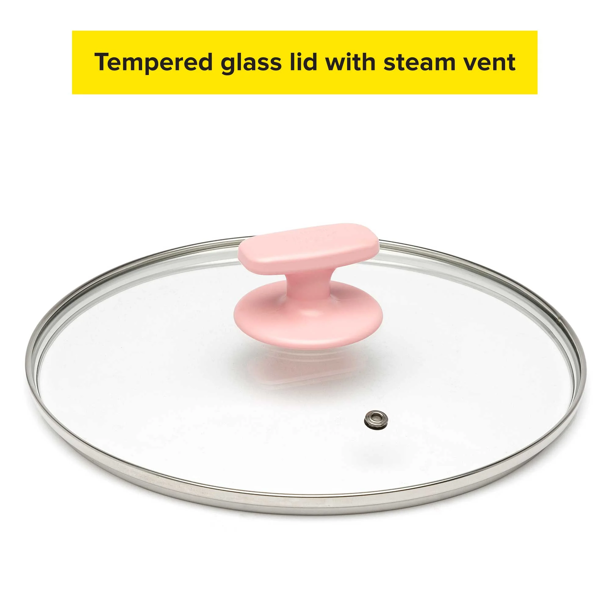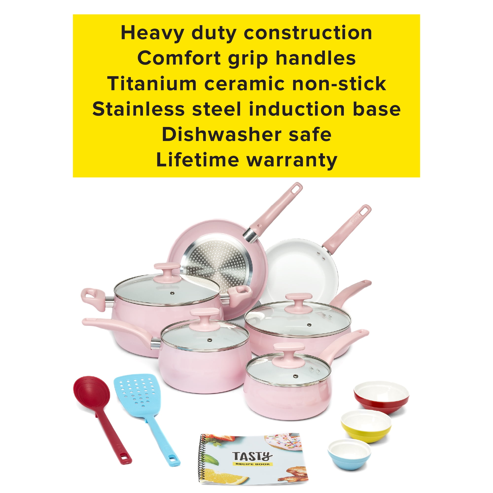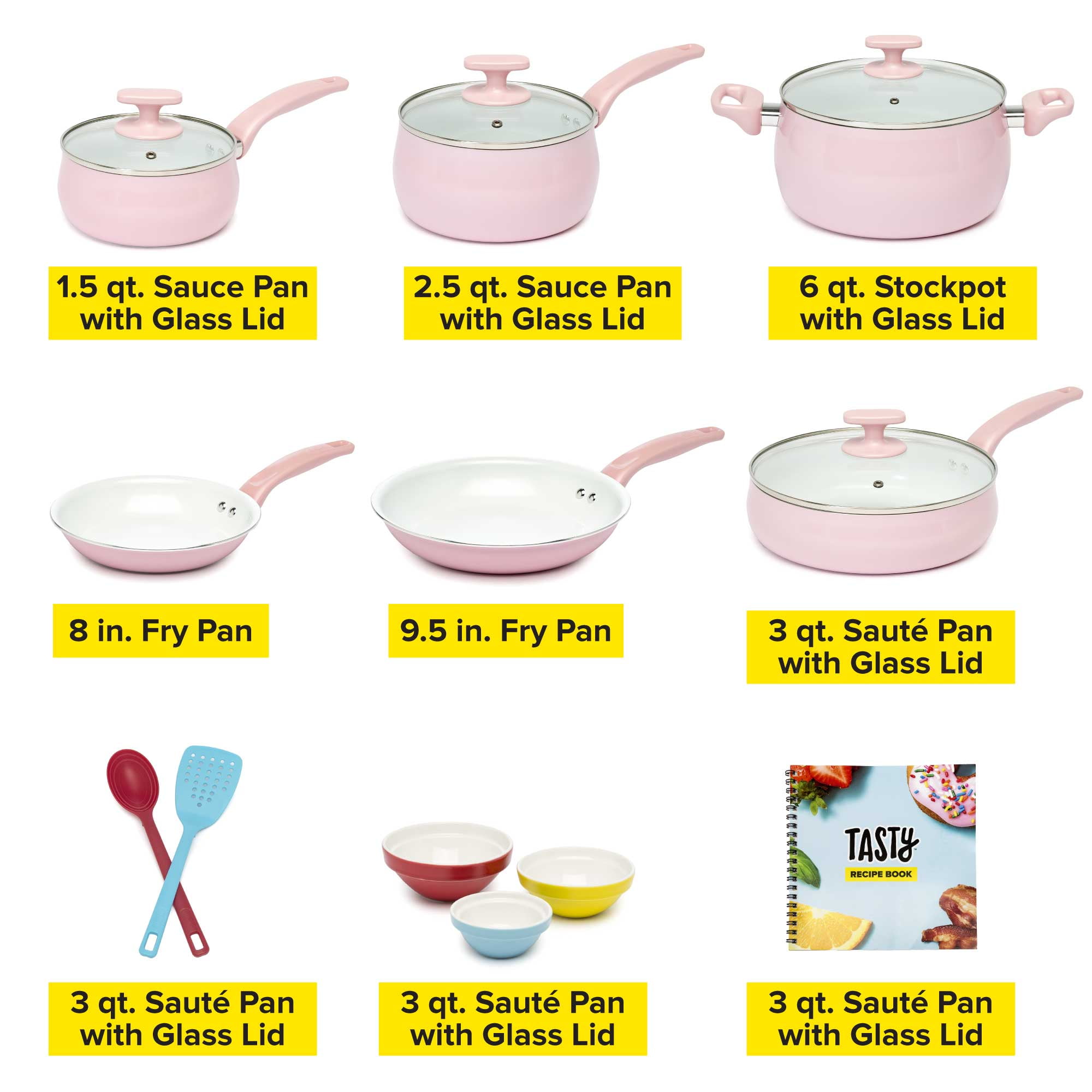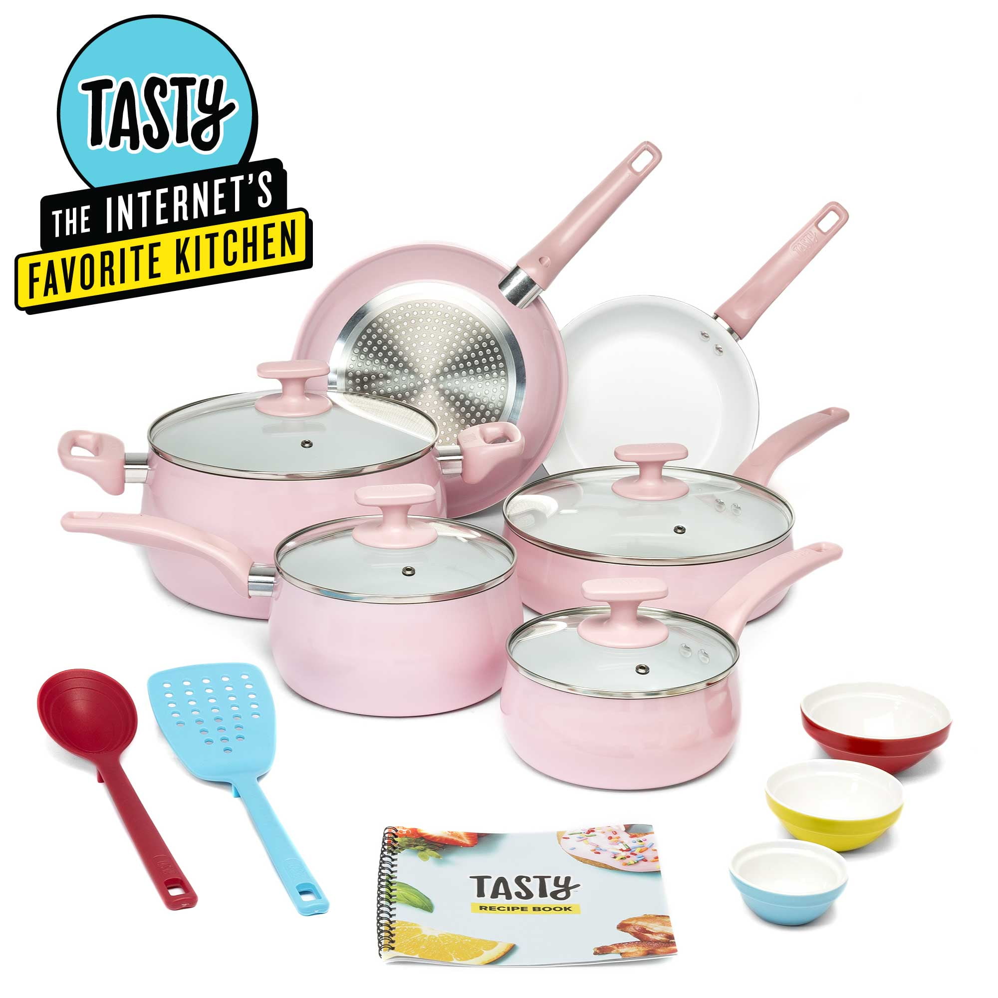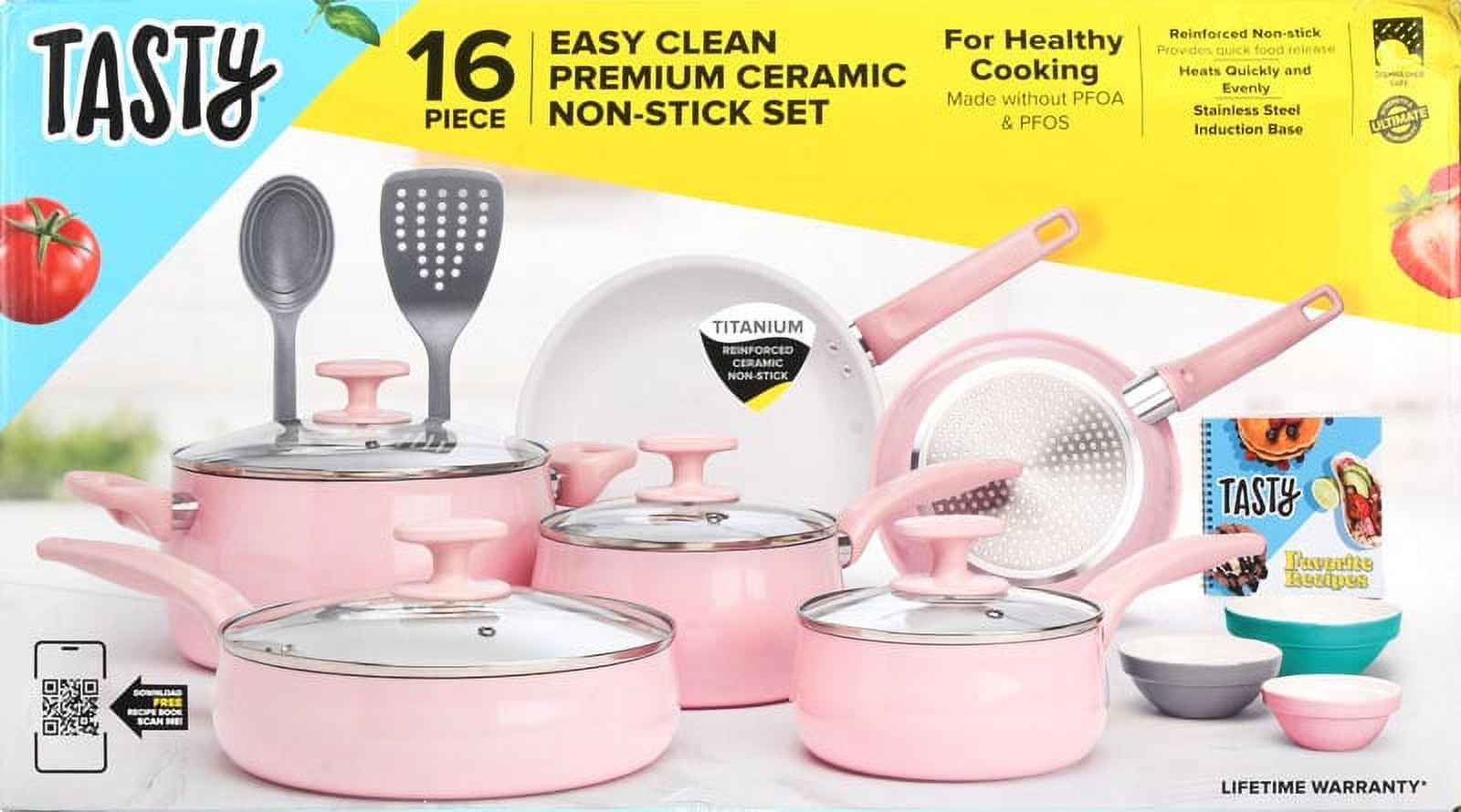 Tasty Ceramic Titanium-Reinforced Cookware Set, Pink, 16 Piece Set Includes: 8 inch fry pan, 9.5 inch fry pan, 1.5 quart saucepan with glass lid, 2.5 quart saucepan with glass lid, 3 quart sauté pan with glass lid, 6 quart stockpot with glass lid, slotted turner, serving spoon with measuring marks, 3 ceramic bowls (2 ounce, 4 ounce and 6 ounce), recipe booklet Premium non-stick coating: The cookware features a durable ceramic non-stick titanium reinforced coating that allows food to easily slide out of the pan Healthy cooking: The non-stick coating on this cookware set is manufactured without PFOA or PTFE. Flippin’ awesome quality: The aluminum cookware guarantees optimum heat distribution for fast and even cooking. Dishwasher safe for easy cleaning: These pans are as easy to clean as they are to use! All of the pans and tools are dishwasher safe for fast clean-up. Get a handle on things: Comfort grip handles make these pots and pans easy to maneuver. Let off some steam: The steam vented glass lids allow steam to escape while cooking your culinary creation. The right tools for the job: The spatula and spoon are heat resistant and safe to use on non-stick surfaces- and dishwasher safe, too! A pinch of this: Use the included ceramic bowls to pre-measure ingredients and make up sauces in advance to make cooking a breeze. Everything but the kitchen sink: Use this multipurpose set to make all of your favorite Tasty recipes! The Internet’s Favorite Kitchen: With viral recipe videos beloved by millions, Tasty has become the largest social food network making cooking fun, teaching new skills, and celebrating all things food!