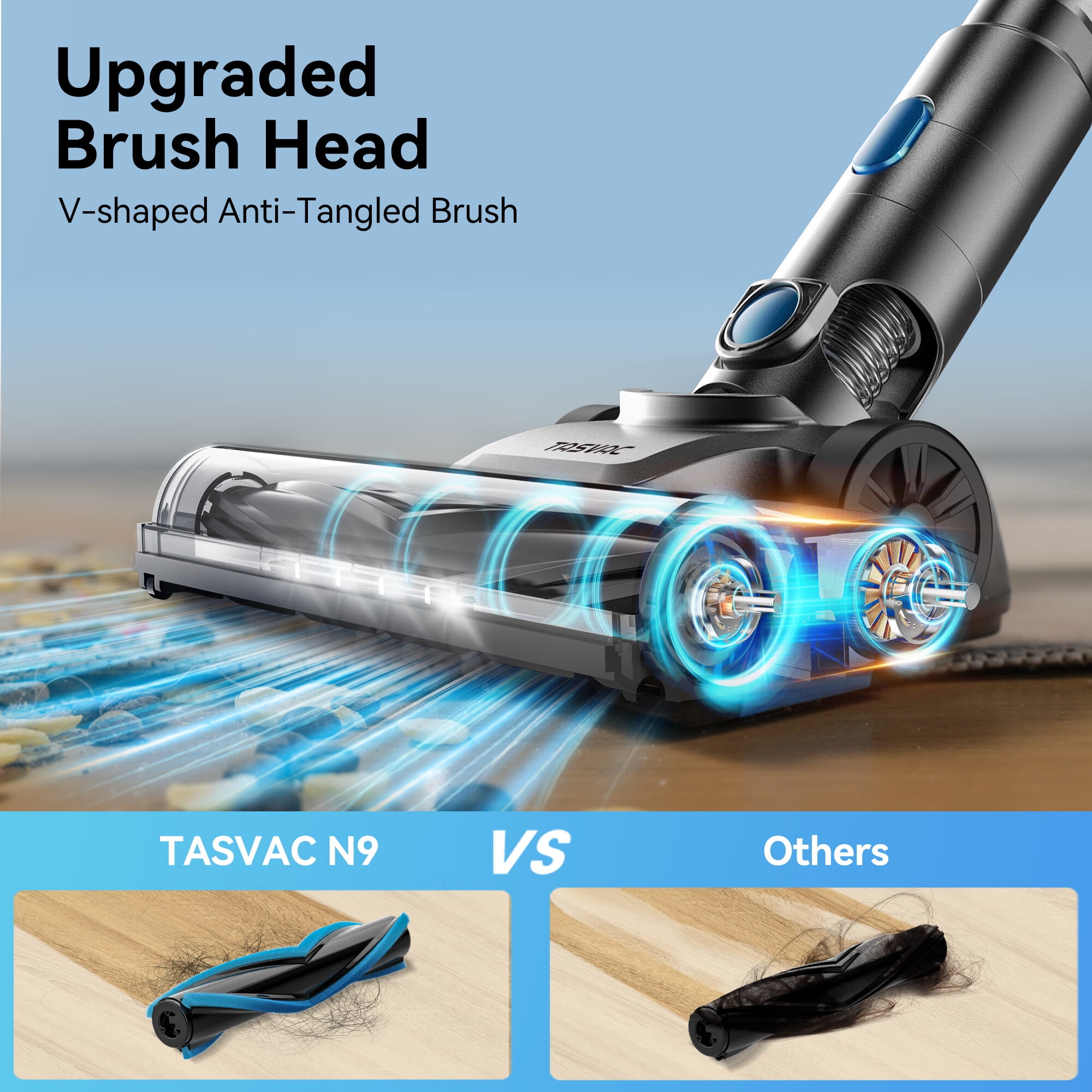 TASVAC N9 cordless vacuum cleaner provides 25Kpa max powerful suction, lower noise, and longer service life with 250W upgraded brushless digital motor, suitable for cat litter, dog food crumbs, pet hair and so on on your carpet, tile and hardwood floor. Vacuum cleaner for carpet comes with a detachable 2200mAh long-lasting battery, which provides up to 40 mins runtime on standard mode(12Kpa), and 20 mins on Max mode. 5 stage advanced filtration system, capture 99.99% of fine dust as small as 0.1 microns, and expels purified clean air is friendly to families with pets, children, or the elderly ➤ Specificities 25 Kpa Powerful Suction 250W Upgrade Brushless Digital Motor 40 Mins Long Runtime 1.2L Capacity And One-Touch-Empty Led Display Showing Remaining Power And Suction Mode 2.1lb Lightweight Main Machine for Easy Handholding 99.99% High-efficient Filtration System 6-in-1 Cordless Stick Vacuum Upgraded Brush Head V-shaped Anti-Tangled Brush Self-Standing Design, Easy to Stand And Wall Bracket Included Perfect for hardwood floors, carpet , pet hair