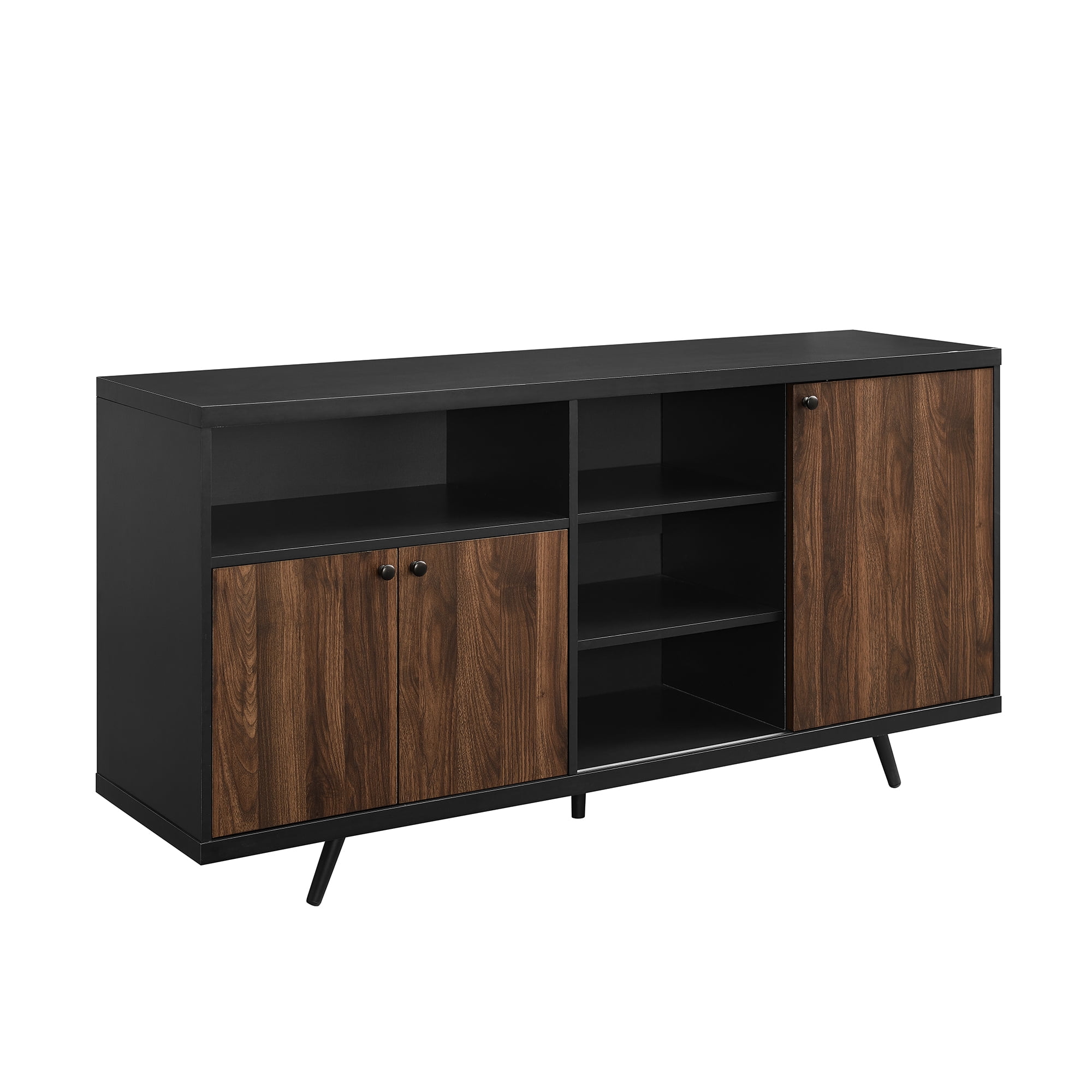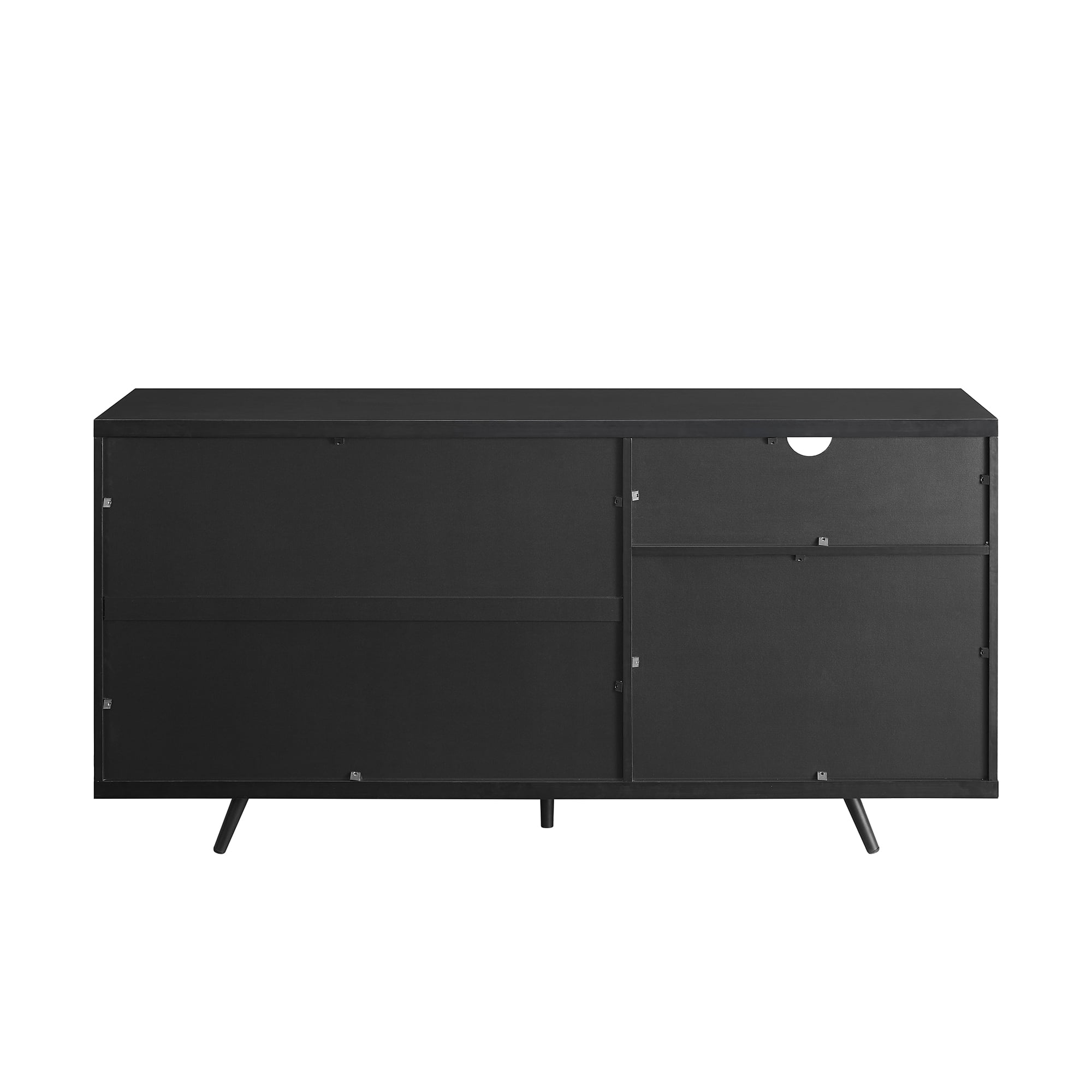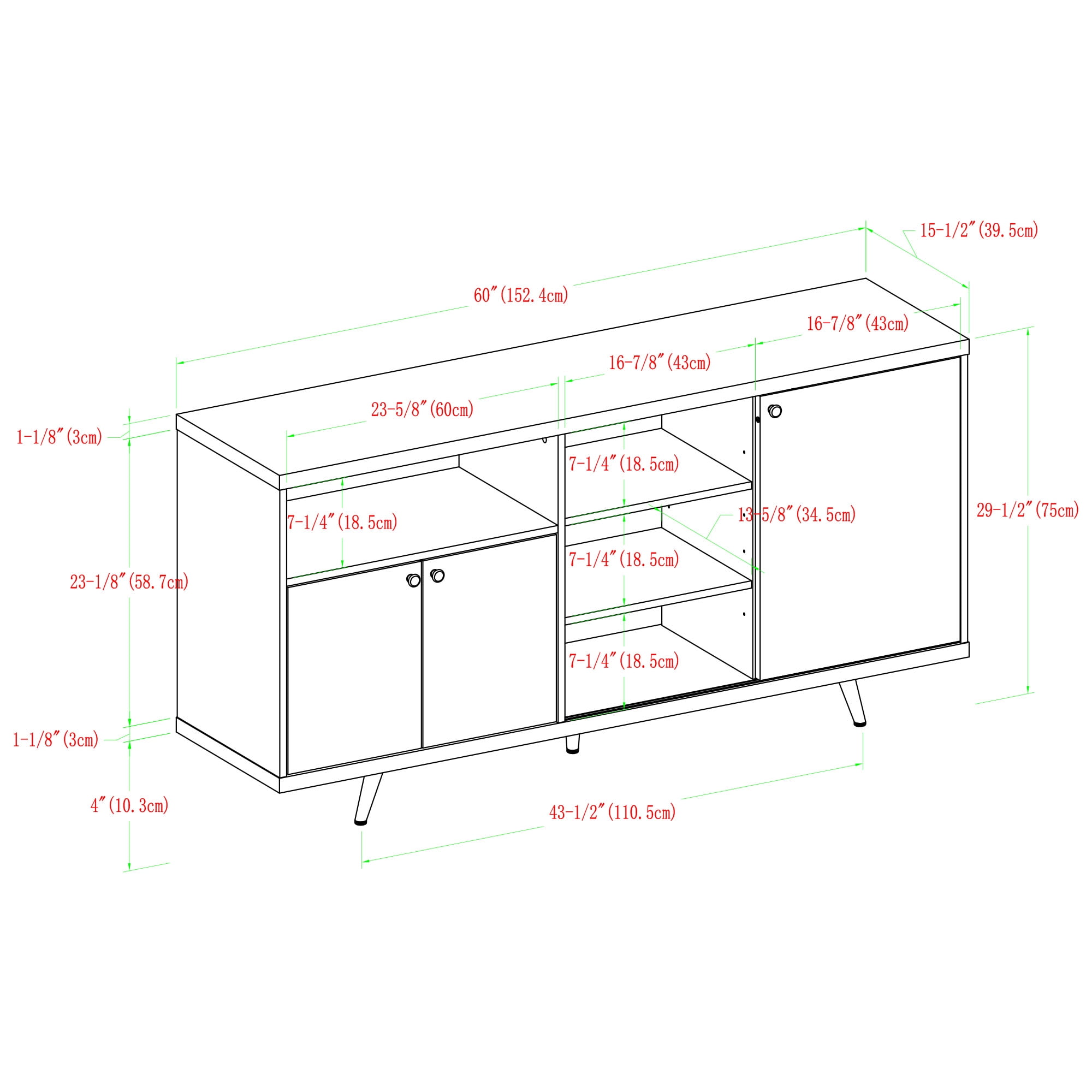 Packaged Dimensions: 8.25” H x 65” L x 21” W Assembled Dimensions: 30” H x 60” L x 15.75” W Materials: Warp-resistant MDF, durable laminate, and powder-coated steel Assembly: Step-by-step assembly required Dark walnut finish Modern sideboard 5 adjustable metal feet Cord management options 2 fixed shelves 3 adjustable shelves 1 angled removable shelf Sliding door 1 open storage cubby Accommodates TVs up to 65”