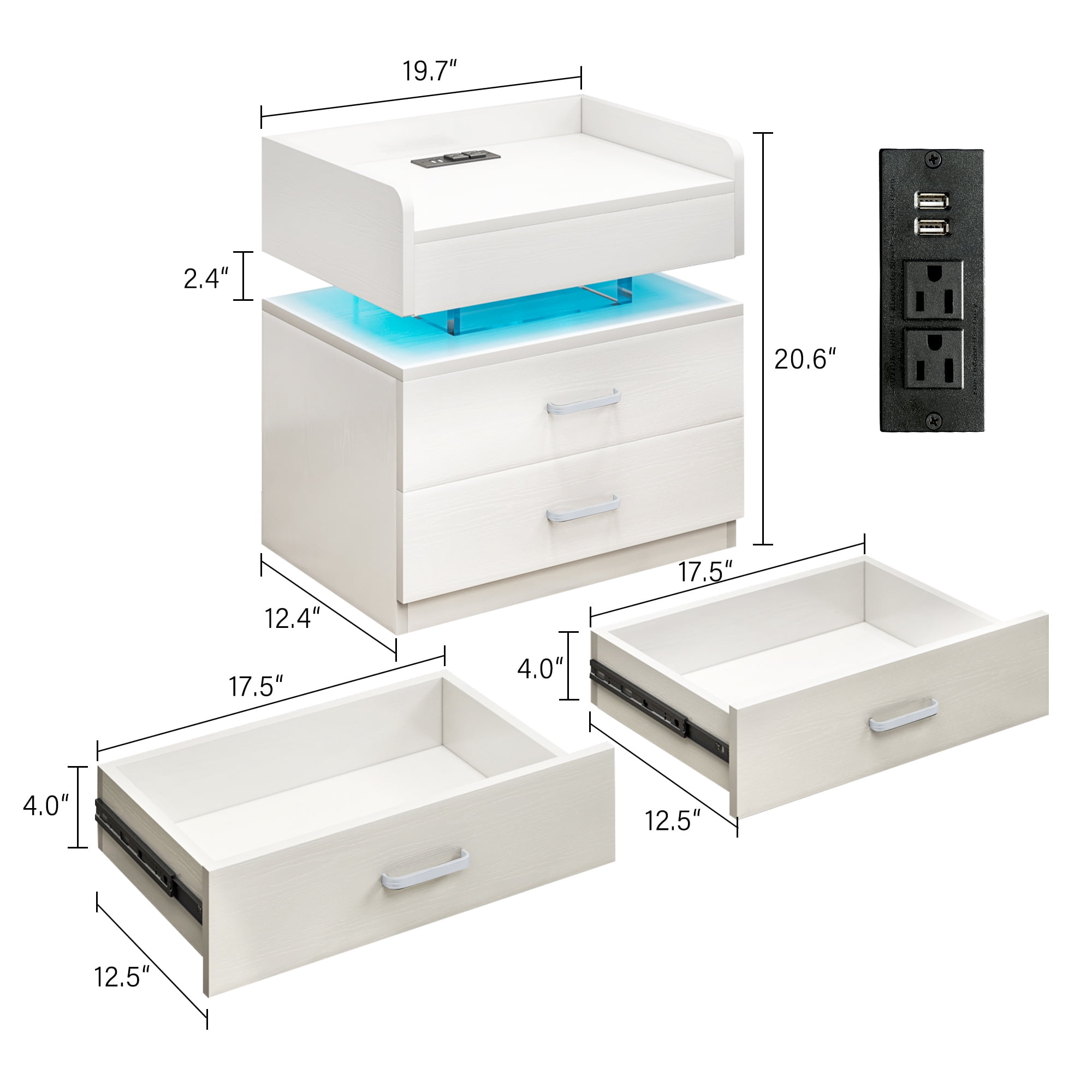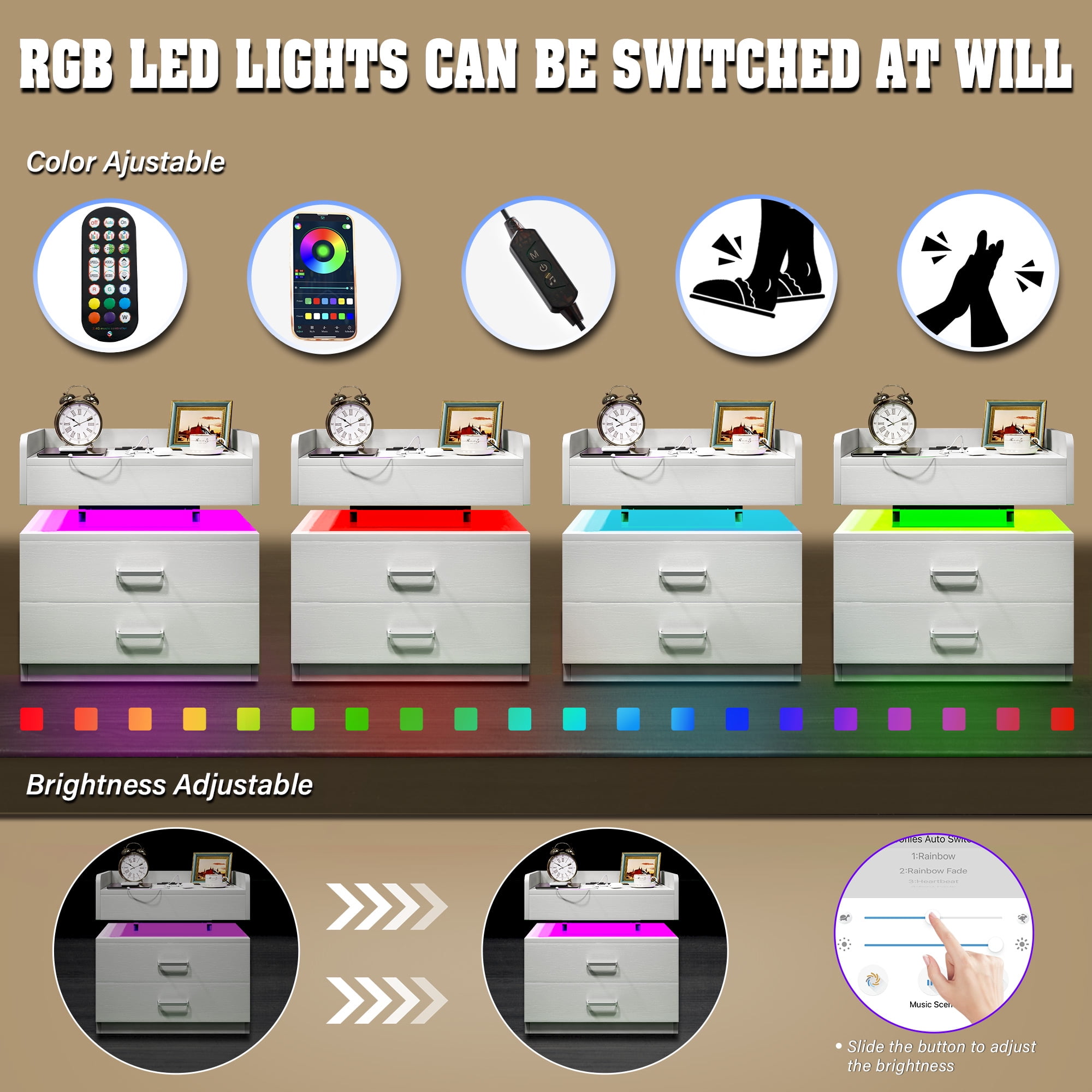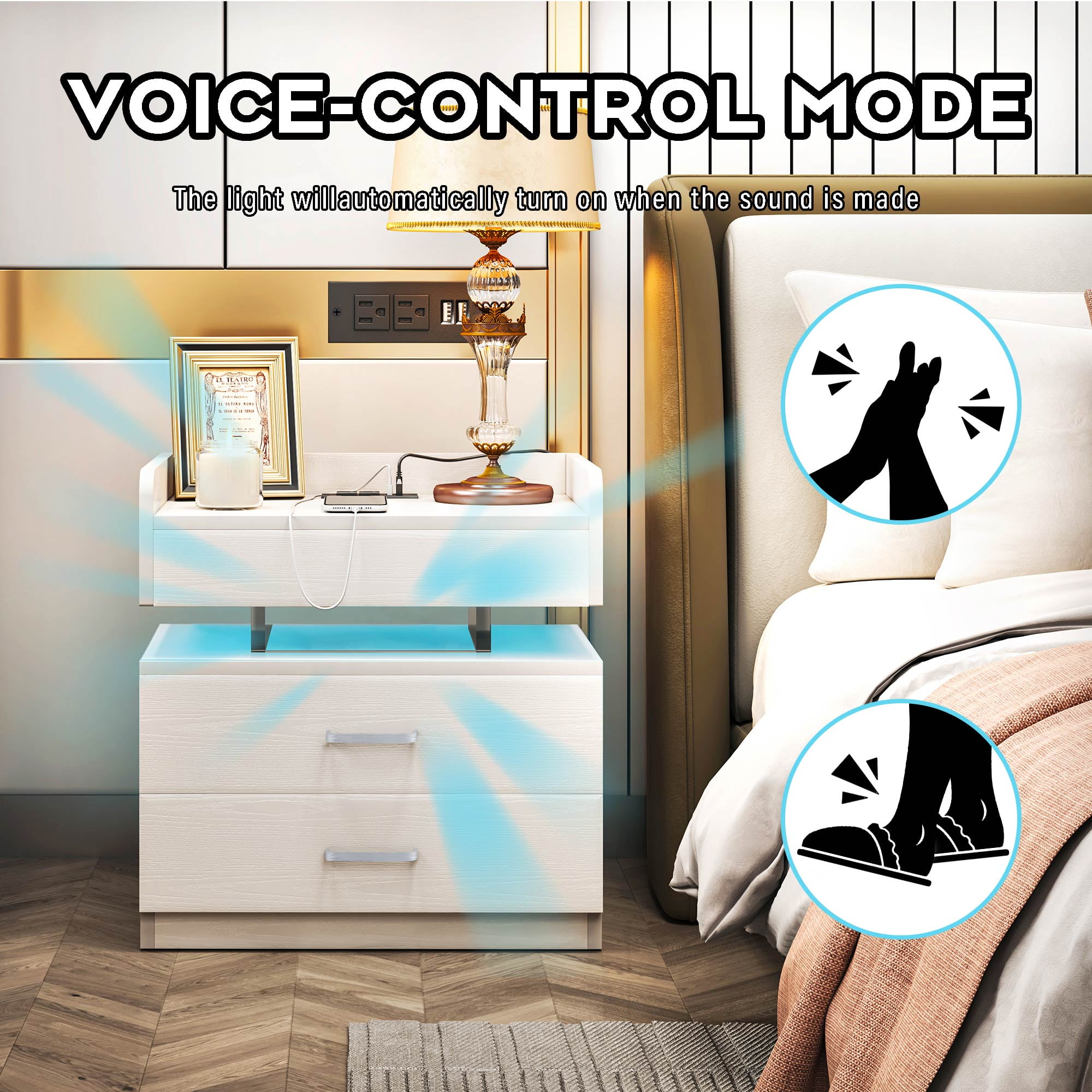 【LED Light with multi-variable RGB colors】– The color of the light strip is variable according to needs and scenes. The bedside nightstand comes with beautiful Multi-colour RGB LED backlight. LED lights have three different multicolor modes to choose from, along with controlled brightness adjustment. And equipped with infrared remote control device to control the LED lights. The beautiful LED light will make your home looks more modern and fashionable. 【Nightstand with Charging】– 2 USB ports + 2 AC outlets! No need to look around for power, this side table with charging station is within your arm’s reach. This LED night stand comes with 2 Standard Plug Outlets & 2 USB Ports that is convenient for charging your mobile devices. 【Large Capacity to Save Space】– Product size 19.7″L x 12.5″W x 20.5″H. The large capacity of the drawer can offer plenty of space for organizing small items. And the open space is convenient for the daily use. Suitable for any room, such as bedroom dining room, office play room. The LED Nightstand has Voice Control Mode. Show that The light will automatically turn on when the sound is made. When you turn on the music, the LED lights will beat and flash in time with the music. 【Durable and Sturdy Material】– The bedside table uses Particle board material that is safe and environmentally friendly. High quality waterproof surface treatment, easy to clean and maintain, durable. The bedside table can hold up to 44 pounds, and the drawer 11 pounds. 【Easy to Assemble】– All labeled pieces, tools and step-by-step installation manual are included in the package, which you can easily assemble this nightstand for living room bedroom individually.