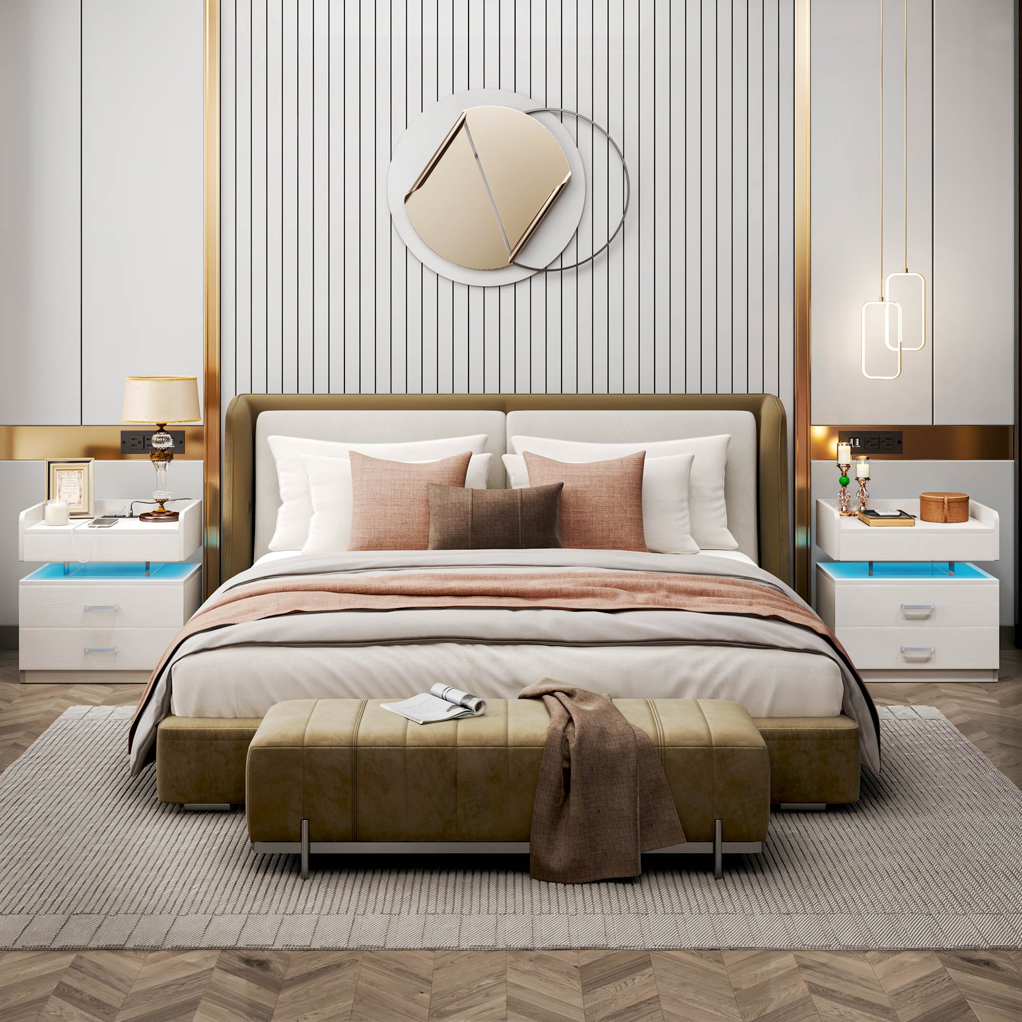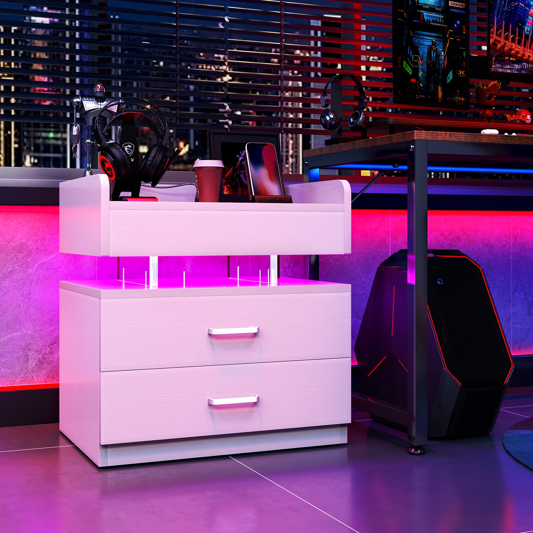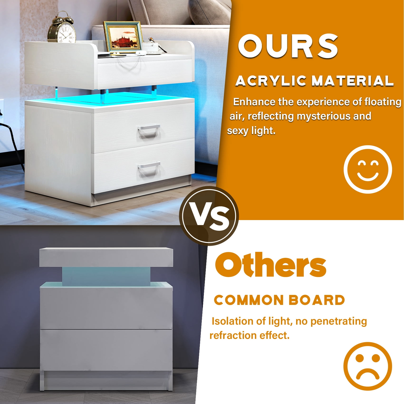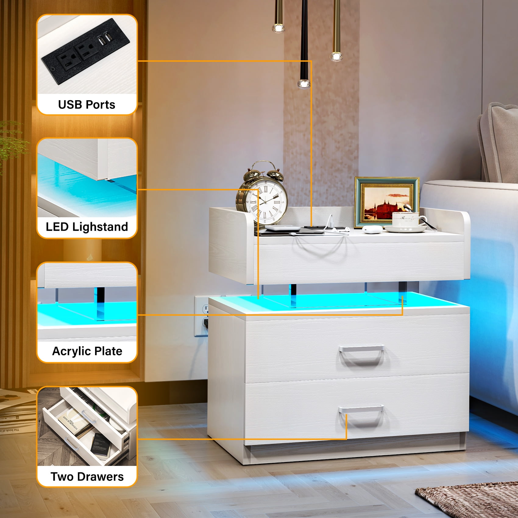 【LED Light with multi-variable RGB colors】– The color of the light strip is variable according to needs and scenes. The bedside nightstand comes with beautiful Multi-colour RGB LED backlight. LED lights have three different multicolor modes to choose from, along with controlled brightness adjustment. And equipped with infrared remote control device to control the LED lights. The beautiful LED light will make your home looks more modern and fashionable. 【Nightstand with Charging】– 2 USB ports + 2 AC outlets! No need to look around for power, this side table with charging station is within your arm’s reach. This LED night stand comes with 2 Standard Plug Outlets & 2 USB Ports that is convenient for charging your mobile devices. 【Large Capacity to Save Space】– Product size 19.7″L x 12.5″W x 20.5″H. The large capacity of the drawer can offer plenty of space for organizing small items. And the open space is convenient for the daily use. Suitable for any room, such as bedroom dining room, office play room. The LED Nightstand has Voice Control Mode. Show that The light will automatically turn on when the sound is made. When you turn on the music, the LED lights will beat and flash in time with the music. 【Durable and Sturdy Material】– The bedside table uses Particle board material that is safe and environmentally friendly. High quality waterproof surface treatment, easy to clean and maintain, durable. The bedside table can hold up to 44 pounds, and the drawer 11 pounds. 【Easy to Assemble】– All labeled pieces, tools and step-by-step installation manual are included in the package, which you can easily assemble this nightstand for living room bedroom individually.