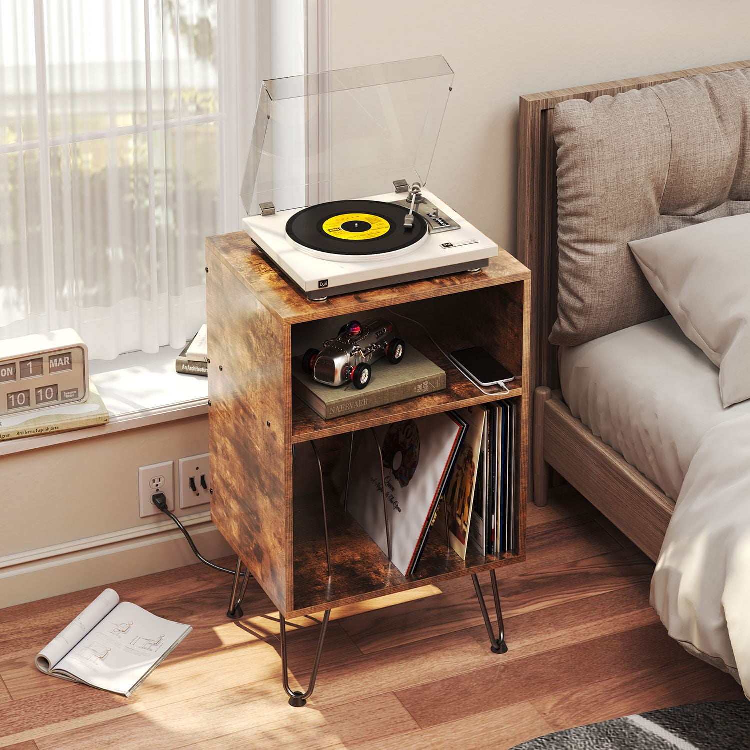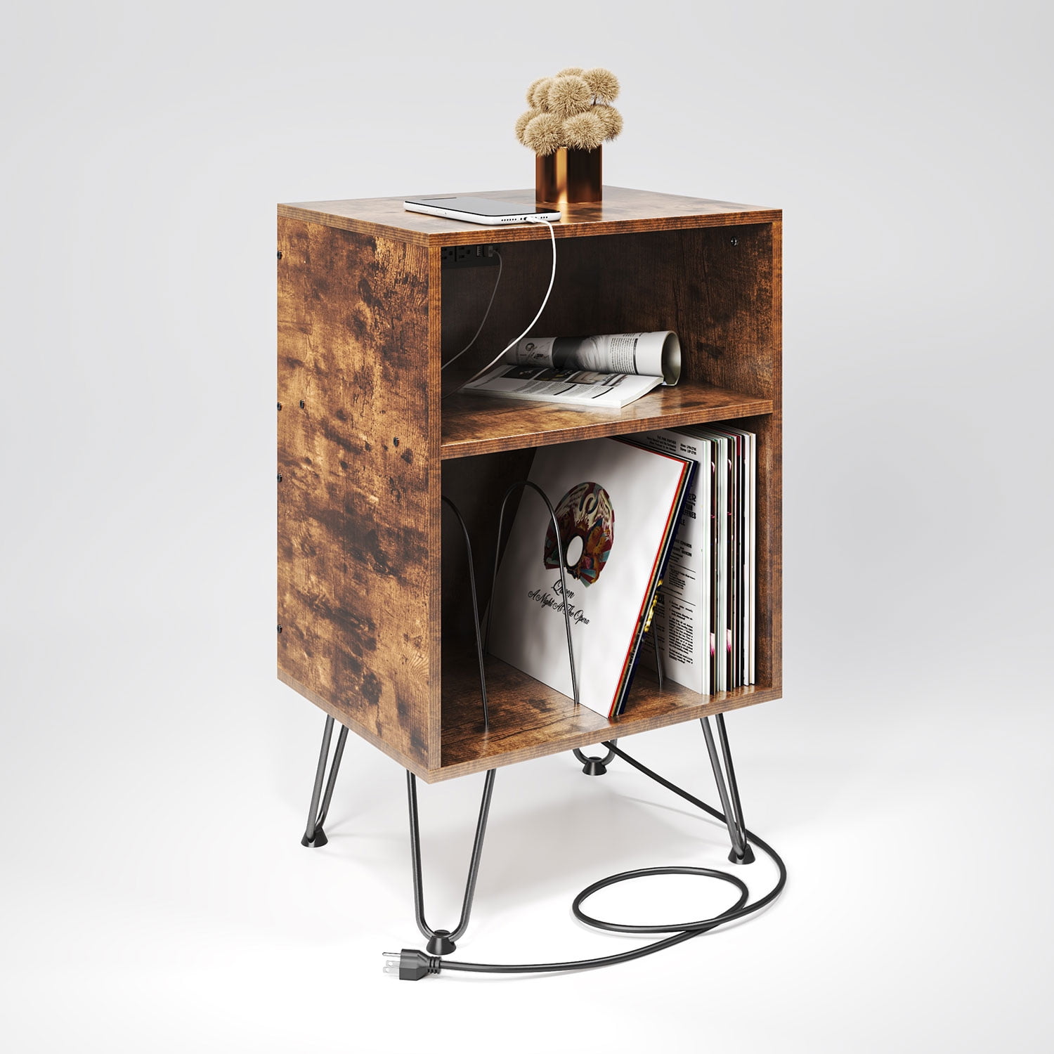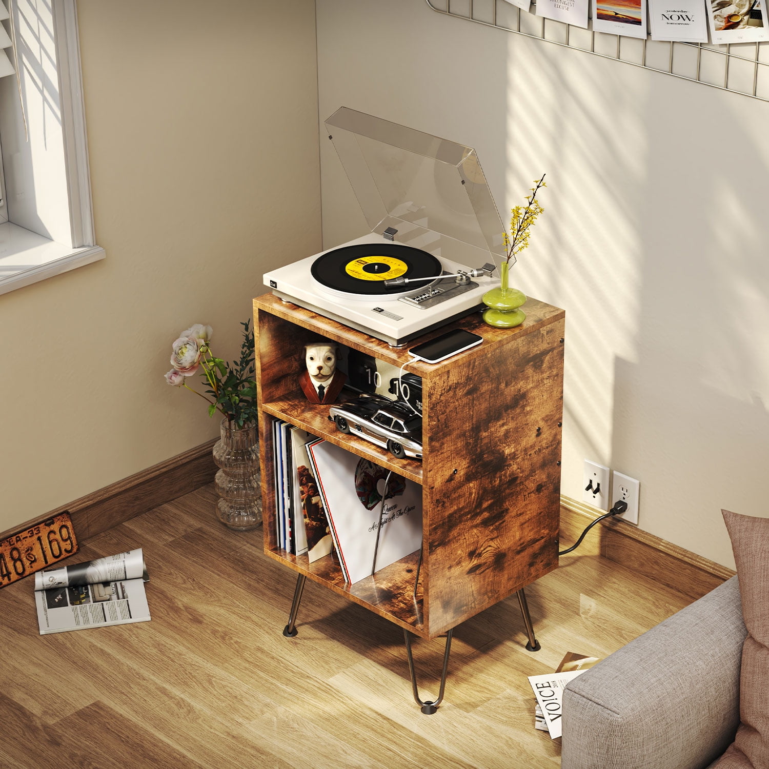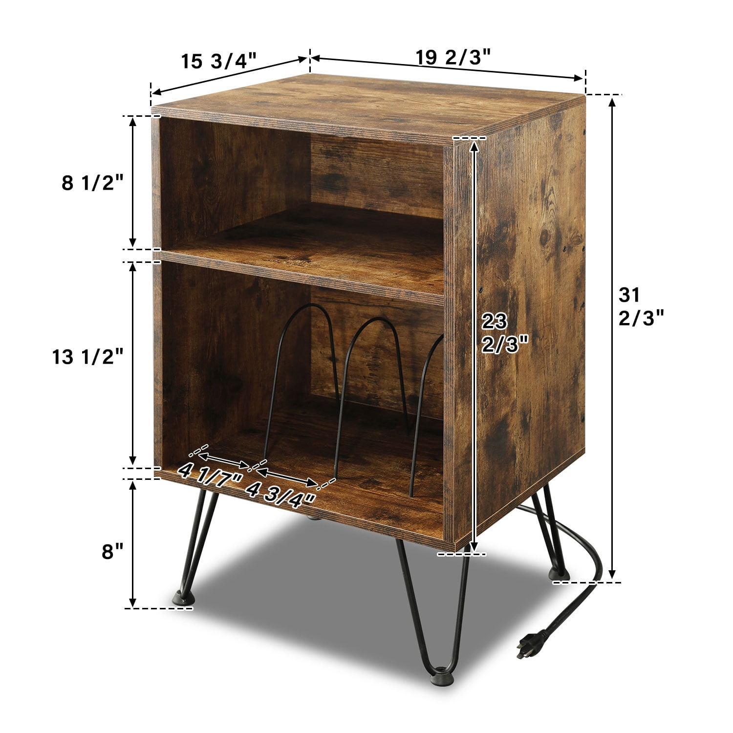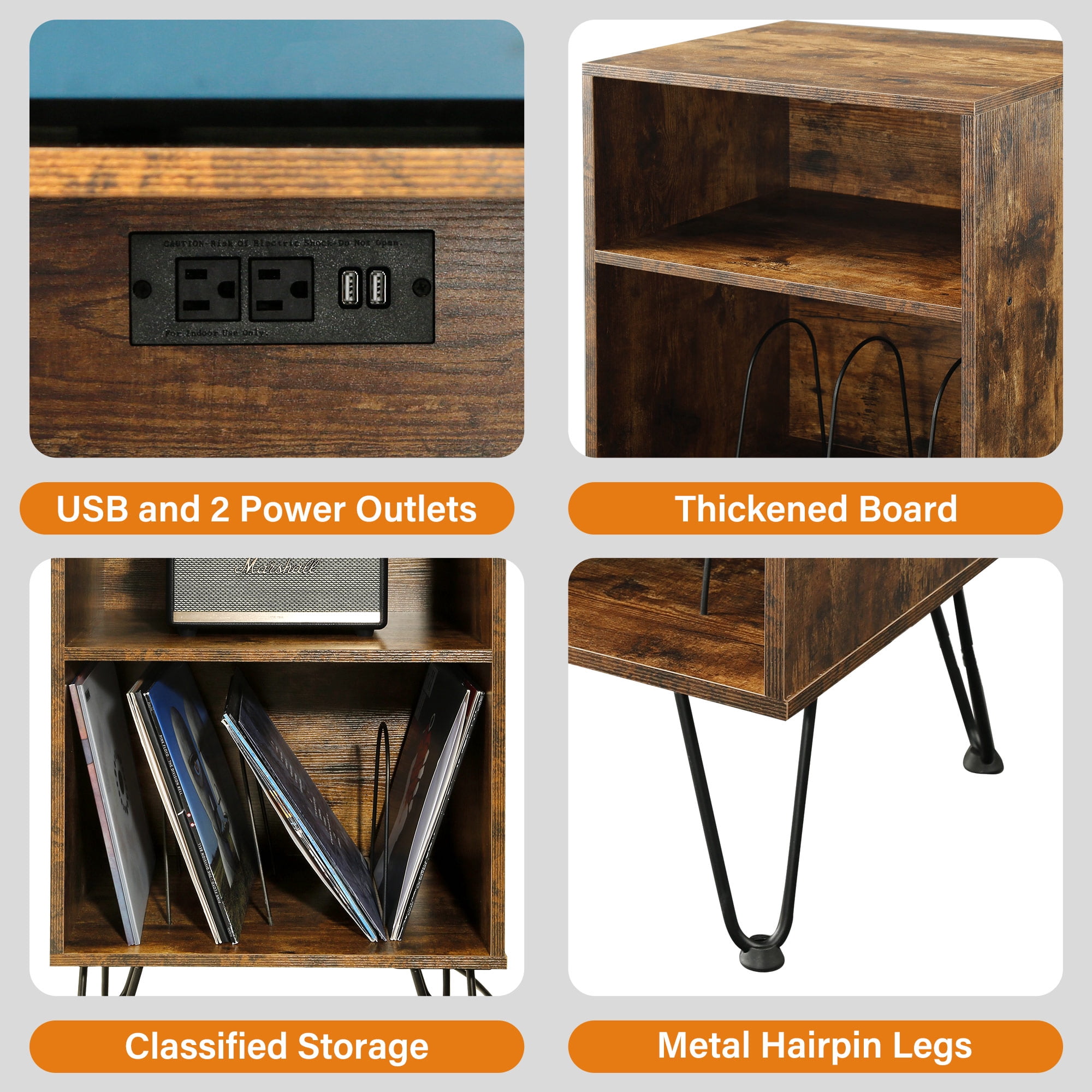 【Reliable Material & Great Durability】: This product is the combination of Revival series and PIVOT series, hoping to meet all your personalized needs for Turntable Stand. If you like mid-century modern design, then this product is your best choice. A fusion of classic hairpin legs and brown wooden board, the upper space is compatible with most record players, and it also comes with built-in hidden sockets. 【3 Tiers Storage Place】: The lower space can accommodate at least 70 albums. With 3 quick-release dividers, the middle space can freely choose to place stereo, speakers or other small objects. 【Designed with charging socket】: We have designed a socket with 2 USB ports and 2 standard plug sockets on the back of the second floor space, through the depth of 18 1/2, it can be well hidden from any angle, although there will be some sequelae (can’t tightly against the wall). 【Outstanding Workmanship】: With dimensions of 31.5″H x 19.5″L x 15.75″D. an easy assembly process, and furniture that’s both chic and multifunctional for different spaces. Frosted Coating, Panel:Particleboard (CARB PHASE 2 COMPLIANT) Socket: 2USB+2 Standard Plug (ETL Certification). 【Easy to Assemble】: Lightweight and simple design, all parts are attached with numbers and installation instructions. It is very easy to install, and the lightweight design is also very easy to move.