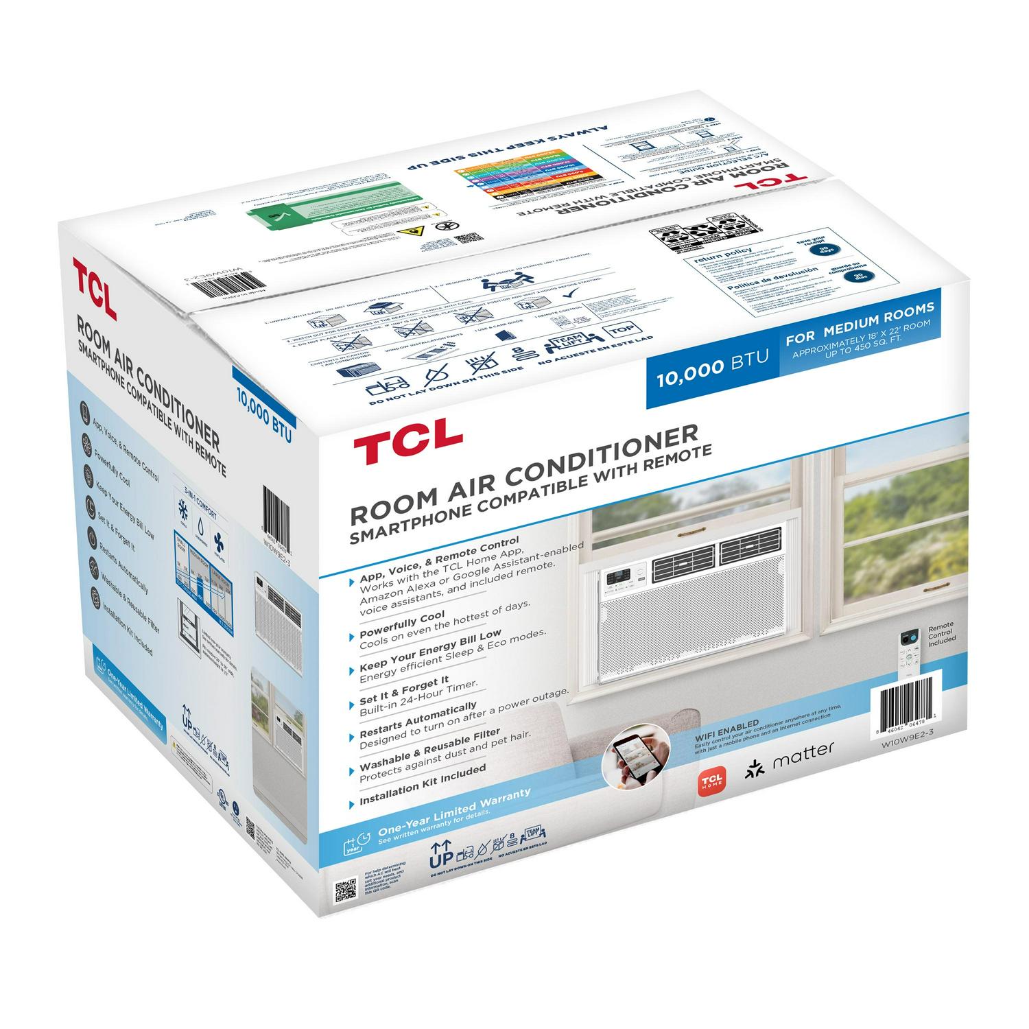 Stay cool and in control with the powerful cooling capacity of the TCL 10,000 BTU Window Air Conditioner. The smart and intuitive TCL Home App helps you control and cool rooms up to 450 sq. ft. When paired with Alexa or Google Assistant, you can use simple voice commands to control your AC without lifting a finger. TCL s line of Energy Star Certified window AC units keeps your energy bill low with the additional Sleep and Eco modes. The washable and reusable filter helps protect the life of your AC while also reducing large airborne particles like dust and pet hair. The included guided instructions mean you don t have to be an expert technician to set up your window AC. Once set up, the LED display makes controlling your window air conditioner simple, while the included remote lets you effortlessly control the unit without ever leaving the couch. It s time to enjoy your home the way it was meant to be.