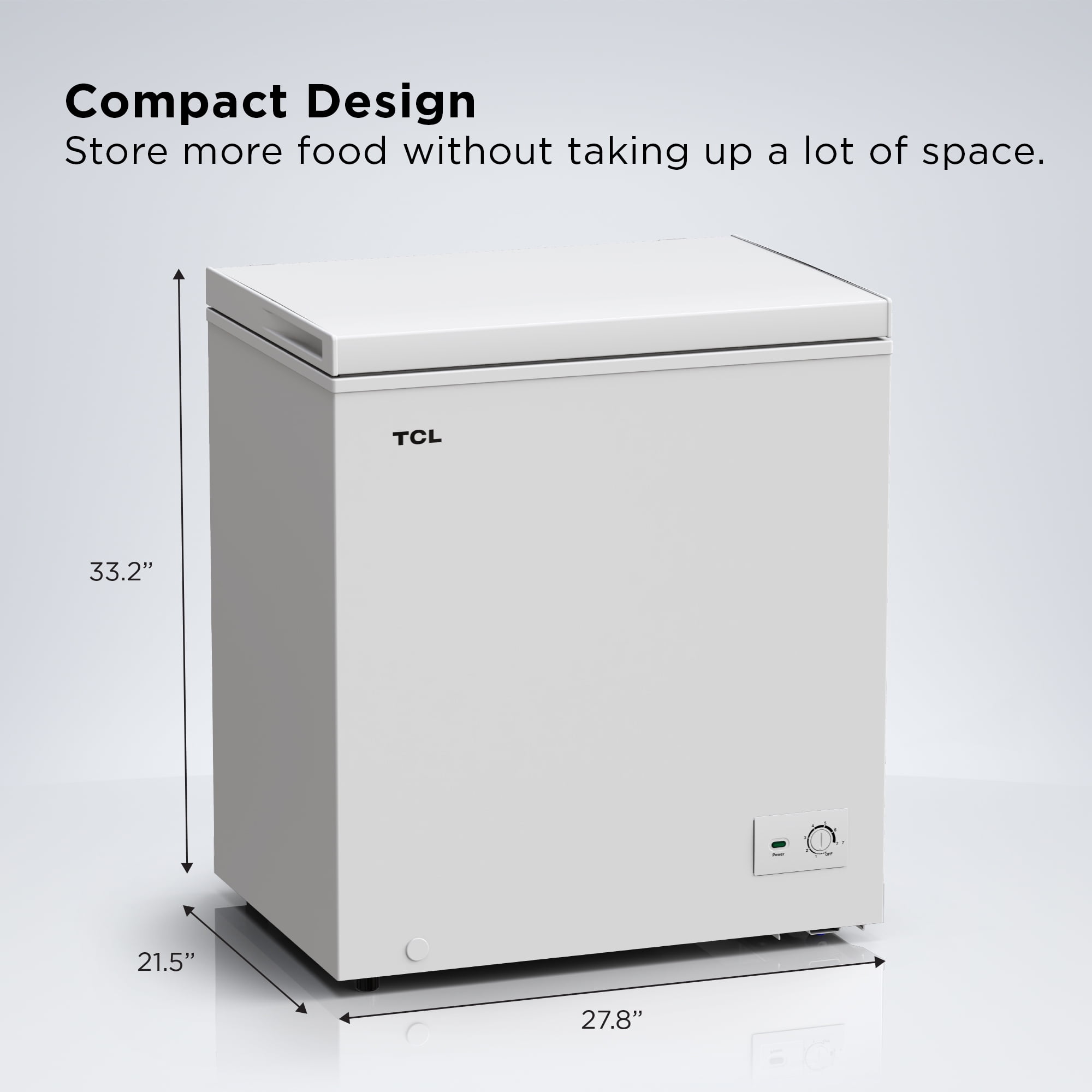 Store More Food at Home. TCL’s chest freezers are offered in three convenient sizes to meet your needs. For those preparing more food at home these days, these TCL freezers can be a valuable enhancement to your lifestyle. Your choice of 5.0 or 7.0 cubic feet versions allow you to store a lot of food without taking up a lot of space. These freezers are Garage ready which means they are designed to operate in ambient temperatures as high as 110° F. There is an included wire basket to help keep your food organized and easily accessible. The LED Power-On Indicator Light lets you see at a glance if the freezer is operating. All TCL Chest Freezers are equipped with a front-accessable drain to enable convenient and easy defrost of the unit. CF053W