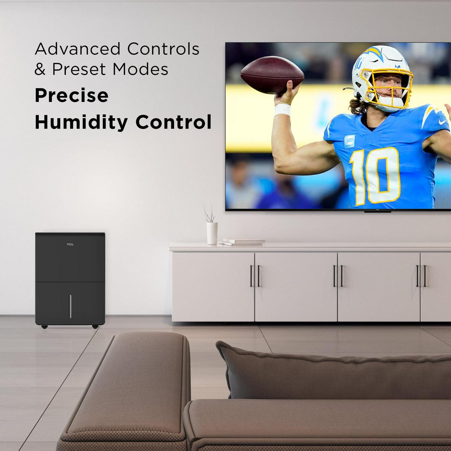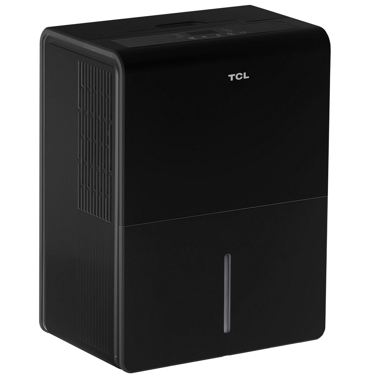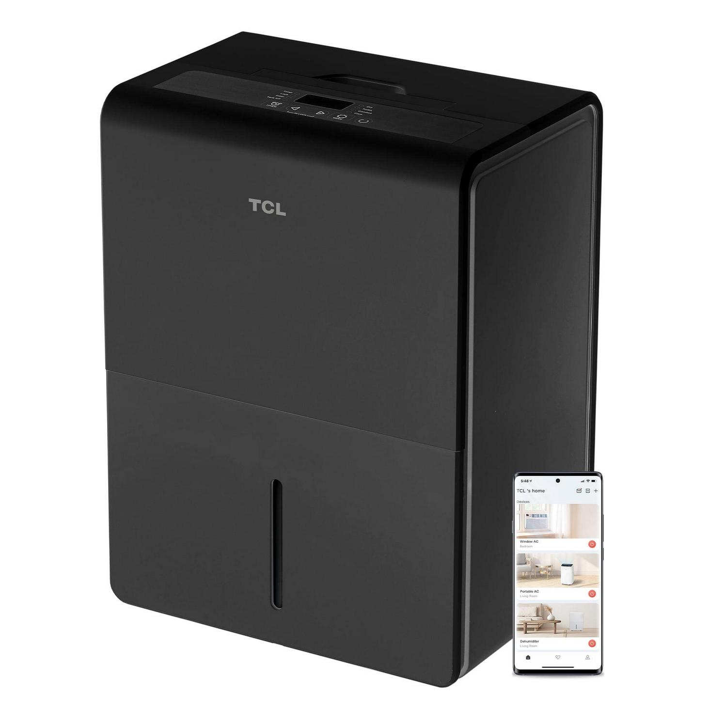 Protect your home from excess moisture with the TCL 4,500 Sq. Ft. 50 Pint Dehumidifier. This Energy Star rated dehumidifier comes equipped with an adjustable humidity display, preset modes, and two fan speeds on the unit s control panel. With smart capabilities, you can control your dehumidifier with simple voice commands using Alexa and Google Assistant. You can also use the TCL Home app to remote control, change the humidity level, set schedules, switch modes and speeds, and more, all from your smartphone. The 24-hour Timer allows you to turn your dehumidifier on or off when you need to, and the bucket full indicator will let you know when the tank needs to be emptied. The washable and reusable filter helps protect the life of your dehumidifier while also reducing large airborne particles like dust and pet hair. Plus, the dehumidifier only takes a few minutes to set up and can easily glide from room to room in seconds. Enjoy precise humidity control and promote healthy air quality with TCL s smart line of dehumidifiers.