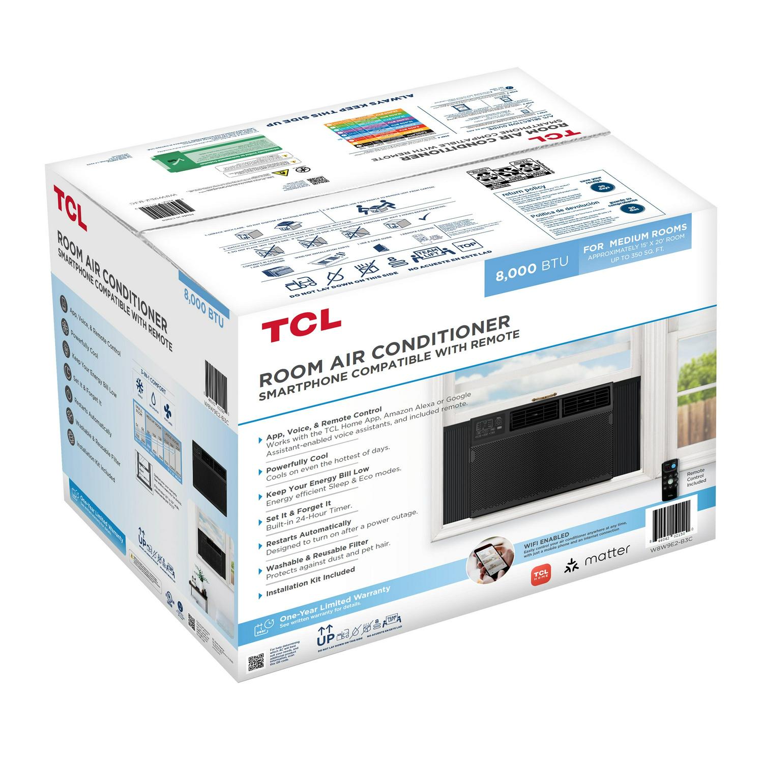 Stay cool and in control with the powerful cooling capacity of the TCL 8,000 BTU Window Air Conditioner. The smart and intuitive TCL Home App helps you control and cool rooms up to 350 sq. ft. When paired with Alexa or Google Assistant, you can use simple voice commands to control your AC without lifting a finger. TCL s line of Energy Star Certified window AC units keeps your energy bill low with the additional Sleep and Eco modes. The washable and reusable filter helps protect the life of your AC while also reducing large airborne particles like dust and pet hair. The included guided instructions mean you don t have to be an expert technician to set up your window AC. Once set up, the LED display makes controlling your window air conditioner simple, while the included remote lets you effortlessly control the unit without ever leaving the couch. It s time to enjoy your home the way it was meant to be.
