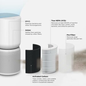 – BREEVA SHIELD PLUS 5-STAGE FILTRATION SYSTEM: Features a pre-filter, True HEPA (H13), activated carbon filter, anion technology, and UV-C sterilization technology that eliminates 99.97% of dust, pollen, mold, bacteria, and other airborne particles as well as absorbs odor, smoke, and volatile organic compounds that can be found in household cleaning supplies. (Filter Life 3-6 months)^