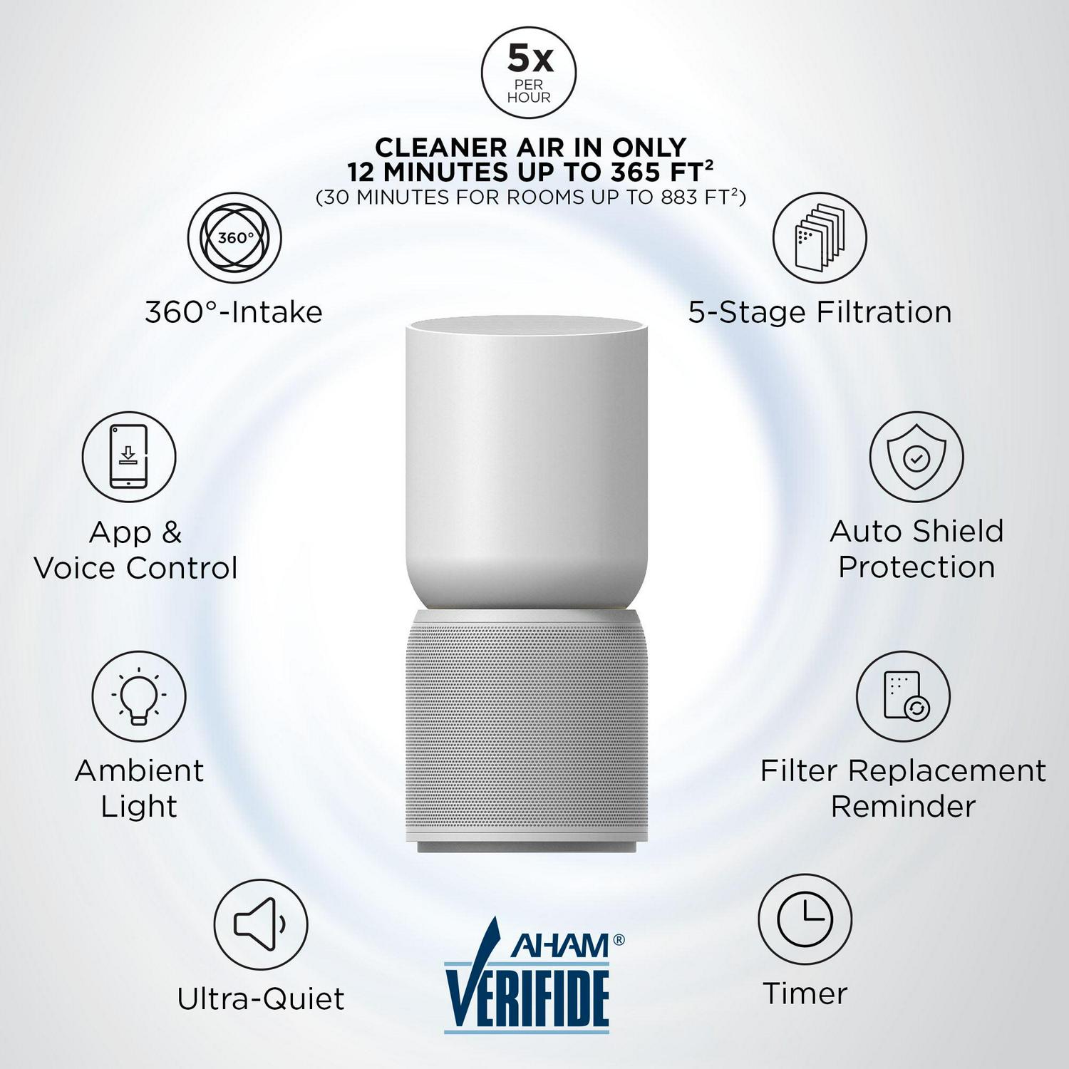 *The air purifier filters the air 5 times an hour (or one time in as little as 12 minutes) in a room up to 365 square feet. This result has been validated through internal testing.