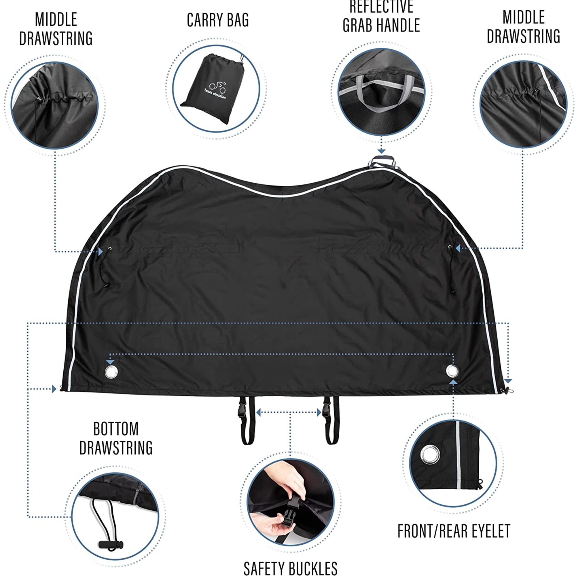 Designed to meet your bike storage needs. Our outdoor bike cover is effective in all weather conditions! This rainproof, anti UV, with PU coating, durable cycling tarp will cover the whole bike body including the wheels to the ground, efficiently protecting your bike against the elements: sun, rain, wind, snow, ice, dust, dirt, hail! It’s suitable for platform-style hitch bike racks on cars and RVs. We’ve designed our waterproof bike cover to last. The strong diamond ripstop material will offer constant protection for your bikes on all your outdoor journeys. With its fitted design, our bike travel case follows the shape of your bicycle so that there won’t be any excess material flapping in the wind. It even comes with a convenient carry bag made of the same material! Keep your ride safe with the Team Obsidian Bike Cover! Designed for your peace of mind, our outdoor bike storage cover can be easily secured on all bikes: mountain, road, hybrid, beach cruiser, electric, city, BMX etc. Just cover the bike from top to bottom, adjust the drawstring cords both at the bottom and in the middle and connect the central buckles for a snug fit. Make sure to knot the extra drawstring at the center. Enjoy extra security with both front and back lock holes – our bike cover is also very noticeable thanks to the reflective straps on both sides. You can easily remove our bike covers by using the top handles. The black and silver style fits both men’s and women’s bikes. Choose the right size and style for you: Stationary L/XL/XXL or Transportation L/XL/XXL. Imagine buying a bike cover and not having to worry about it again. We are here to make that come true and we believe this product will meet all your expectations. In case you have any problems with your cycle protector we’ll have it fixed or replaced at no cost. Don’t settle for anything less than the best in bicycle storage. Add the Team Obsidian Bike Cover to your cart today!