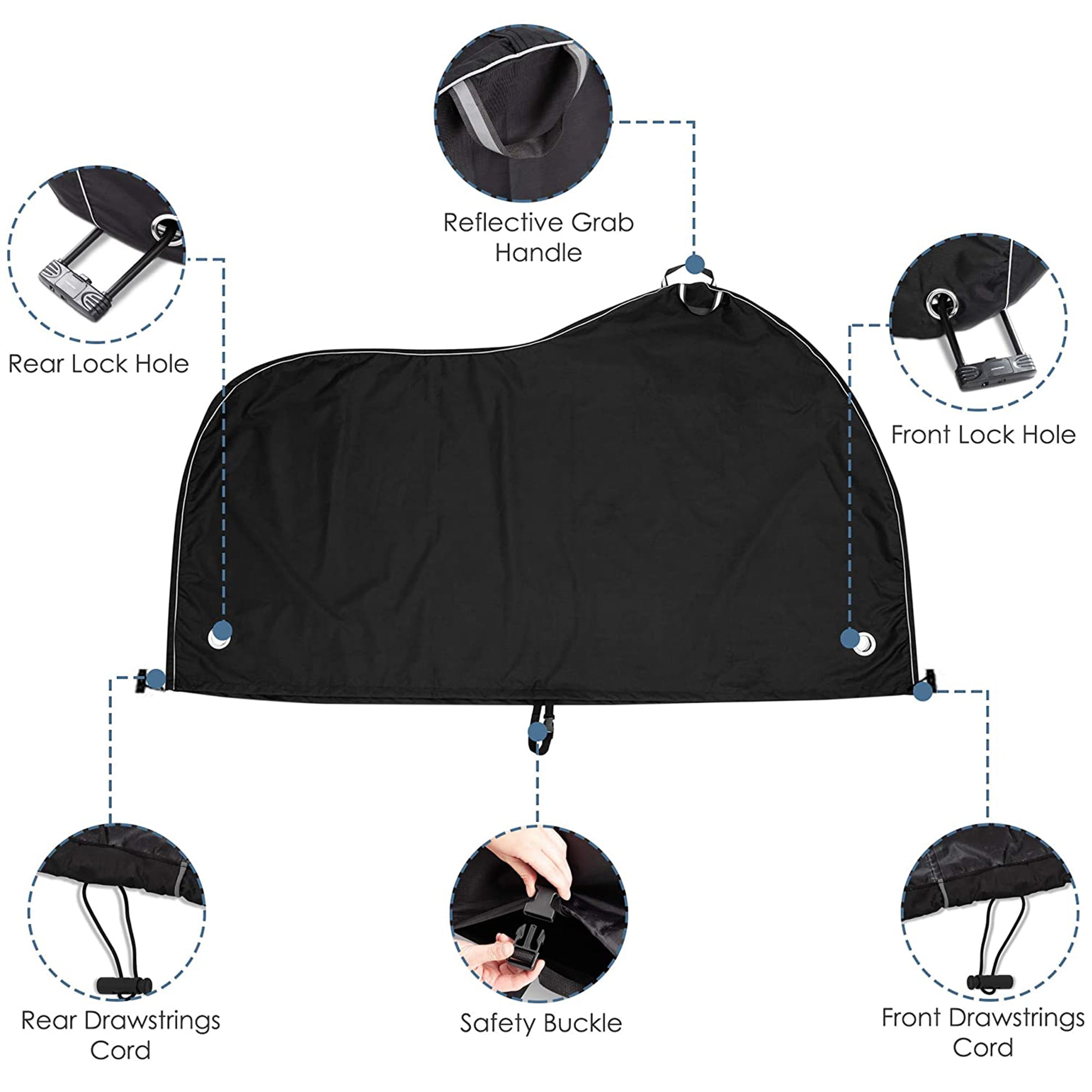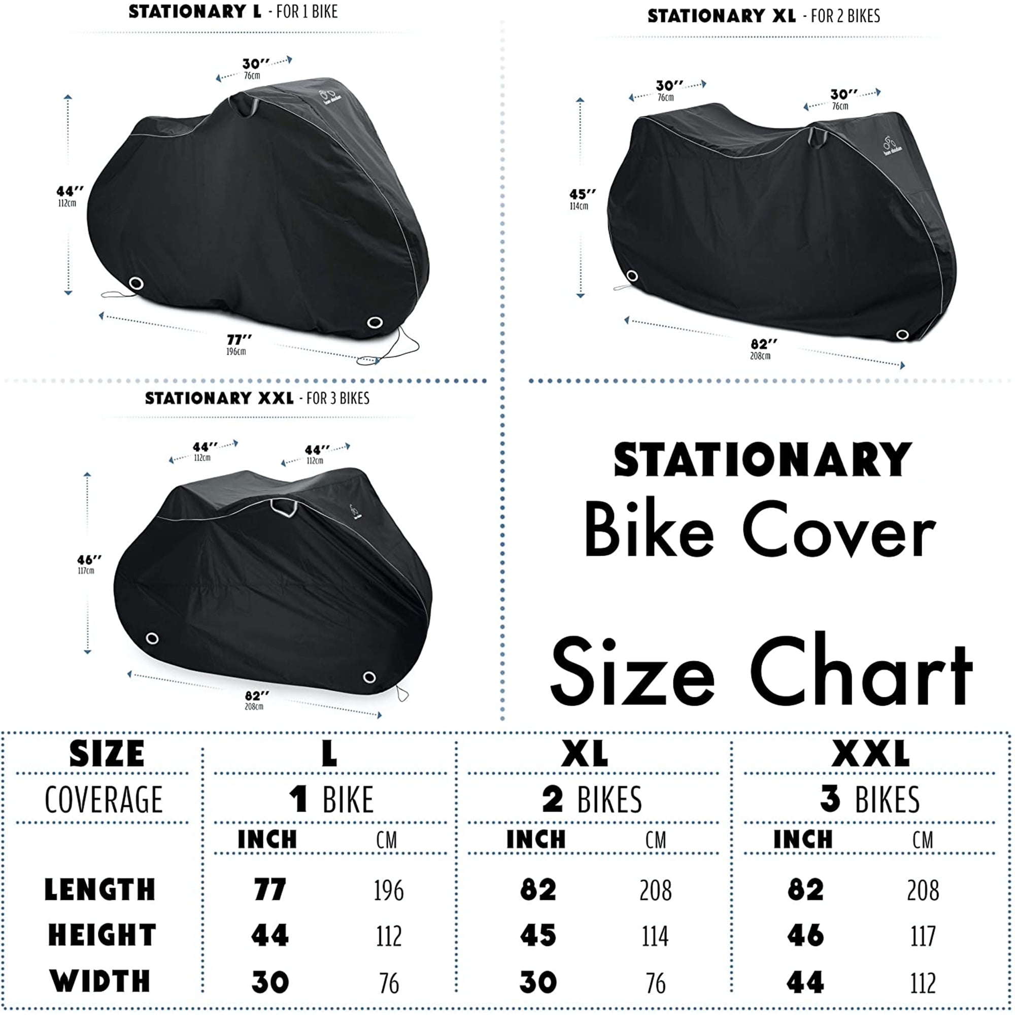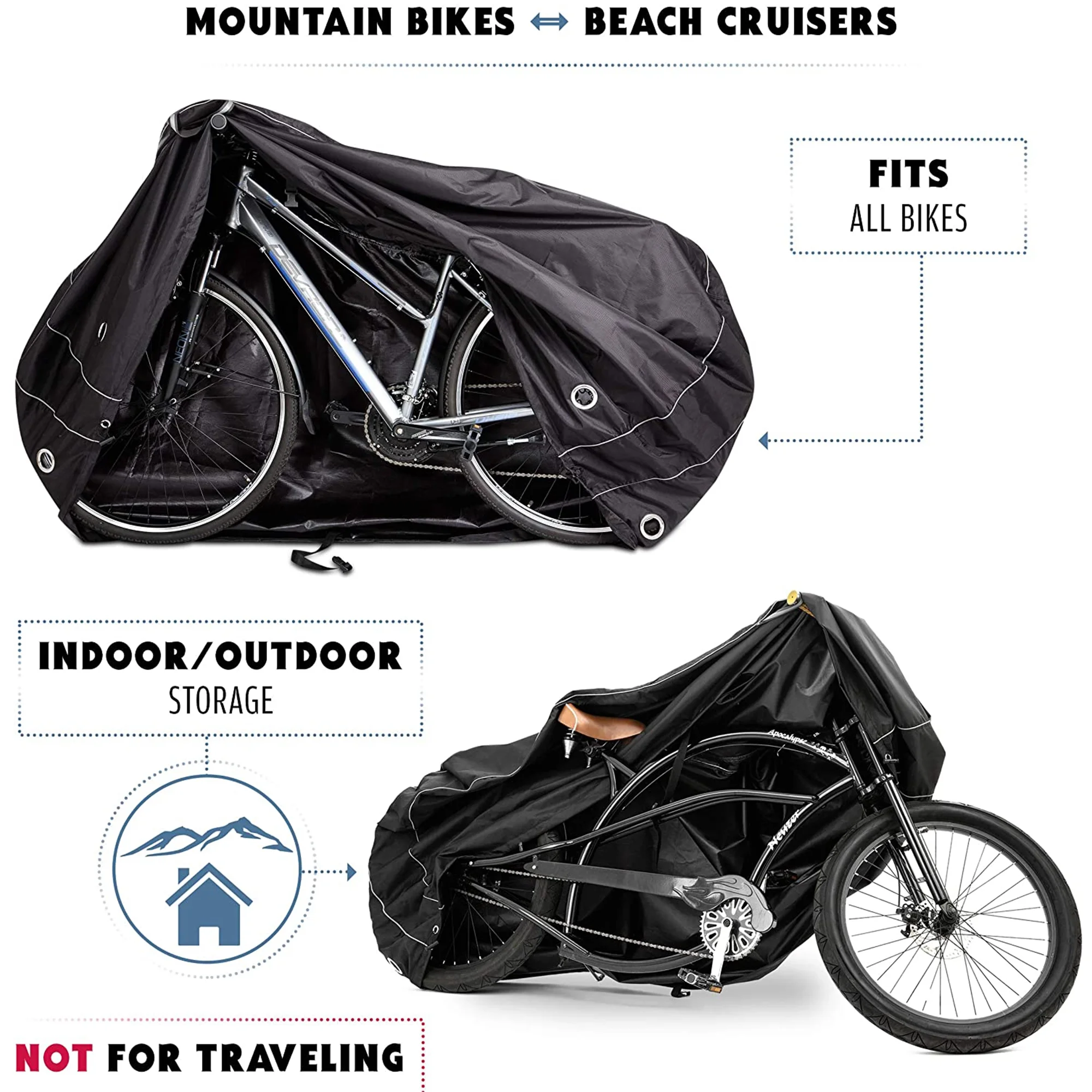 Large bike cover for stationary outdoor storage and 4 seasons use Waterproof heavy duty ripstop material with Anti-UV protection Designed for ease of use and total security Highly versatile – suitable for dirt, mountain, BMX, road, hybrid bikes and more