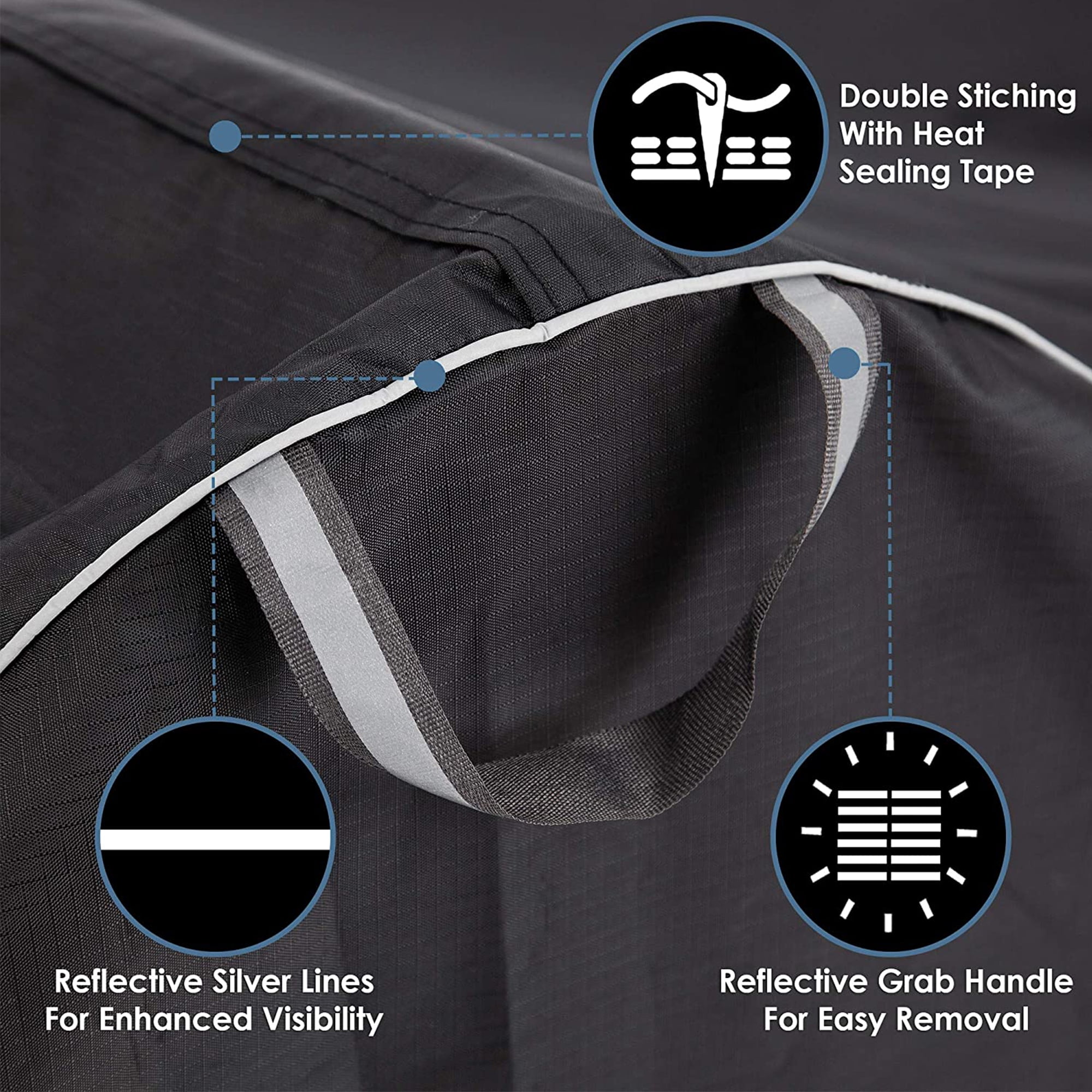 Designed to meet your bike storage needs. Our outdoor bike cover is effective in all weather conditions! This rainproof, anti UV, with PU coating, durable cycling tarp will cover the whole bike body including the wheels to the ground, efficiently protecting your bike against the elements: sun, rain, wind, snow, ice, dust, dirt, hail! We’ve designed our waterproof bike cover to last. The strong diamond ripstop material will offer constant protection for your bikes on all your outdoor journeys. With its fitted design, our bike cover follows the shape of your bicycle so that there won’t be any excess material flapping in the wind. It even comes with a convenient carry bag made of the same material! Keep your ride safe with the Team Obsidian Bike Cover! Designed for your peace of mind, our outdoor bike storage cover can be easily secured on all bikes: mountain, road, hybrid, beach cruiser, electric, city, BMX etc. Just cover the bike from top to bottom, adjust the drawstring cords both at the bottom and in the middle and connect the central buckles for a snug fit. Make sure to knot the extra drawstring at the center. Enjoy extra security with both front and back lock holes – our bike cover is also very noticeable thanks to the reflective straps on both sides. You can easily remove our bike covers by using the top handles. The black and silver style fits both men’s and women’s bikes. Choose the right size and style for you: Stationary L/XL/XXL or Transportation L/XL/XXL. Imagine buying a bike cover and not having to worry about it again. We are here to make that come true and we believe this product will meet all your expectations. In case you have any problems with your cycle protector we’ll have it fixed or replaced at no cost. Don’t settle for anything less than the best in bicycle storage. Add the Team Obsidian Bike Cover to your cart today!
