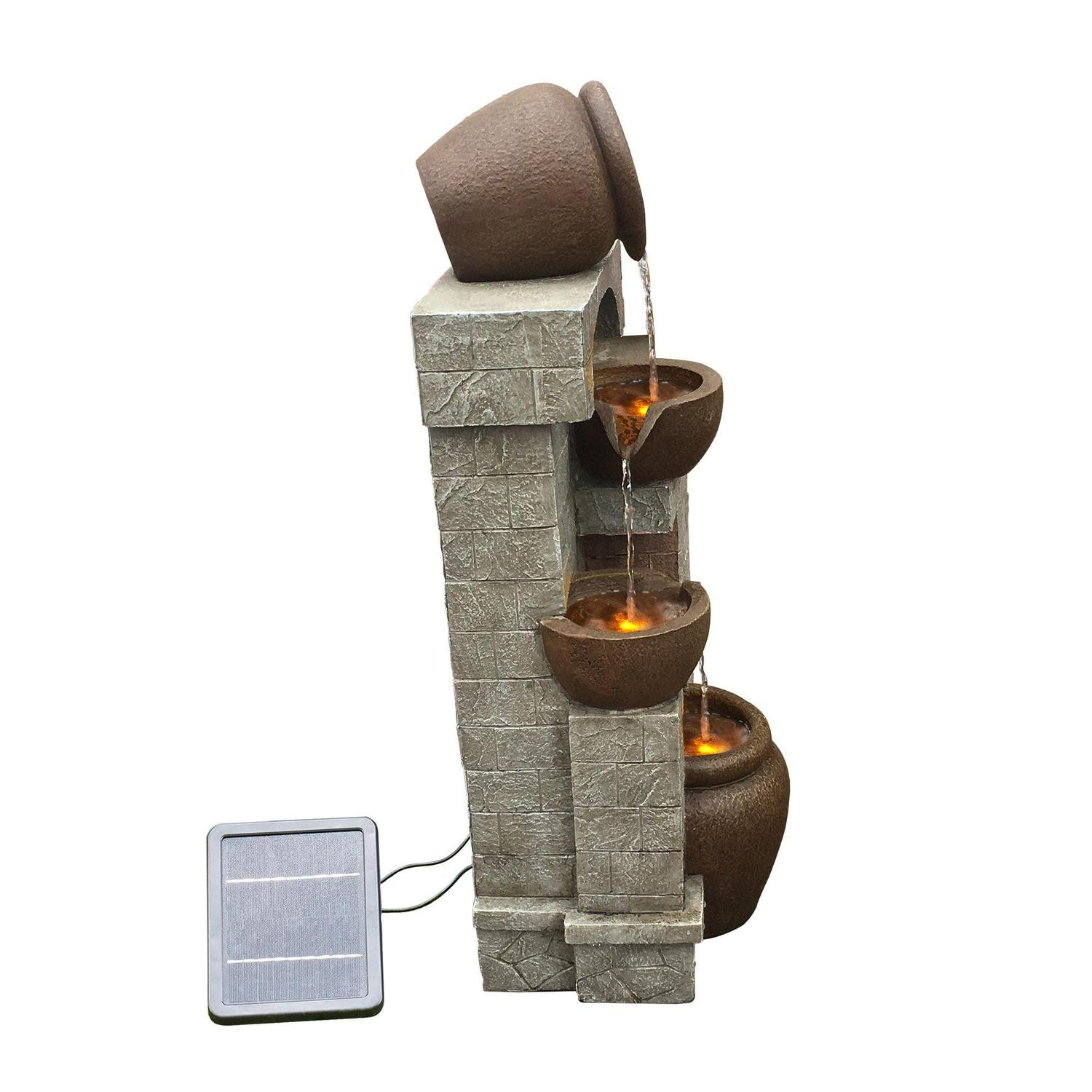 – INCLUDED: One weatherproof polyresin fountain with brown bowls and LED lights on a stone powdered column, plus a solar panel and pump are included.