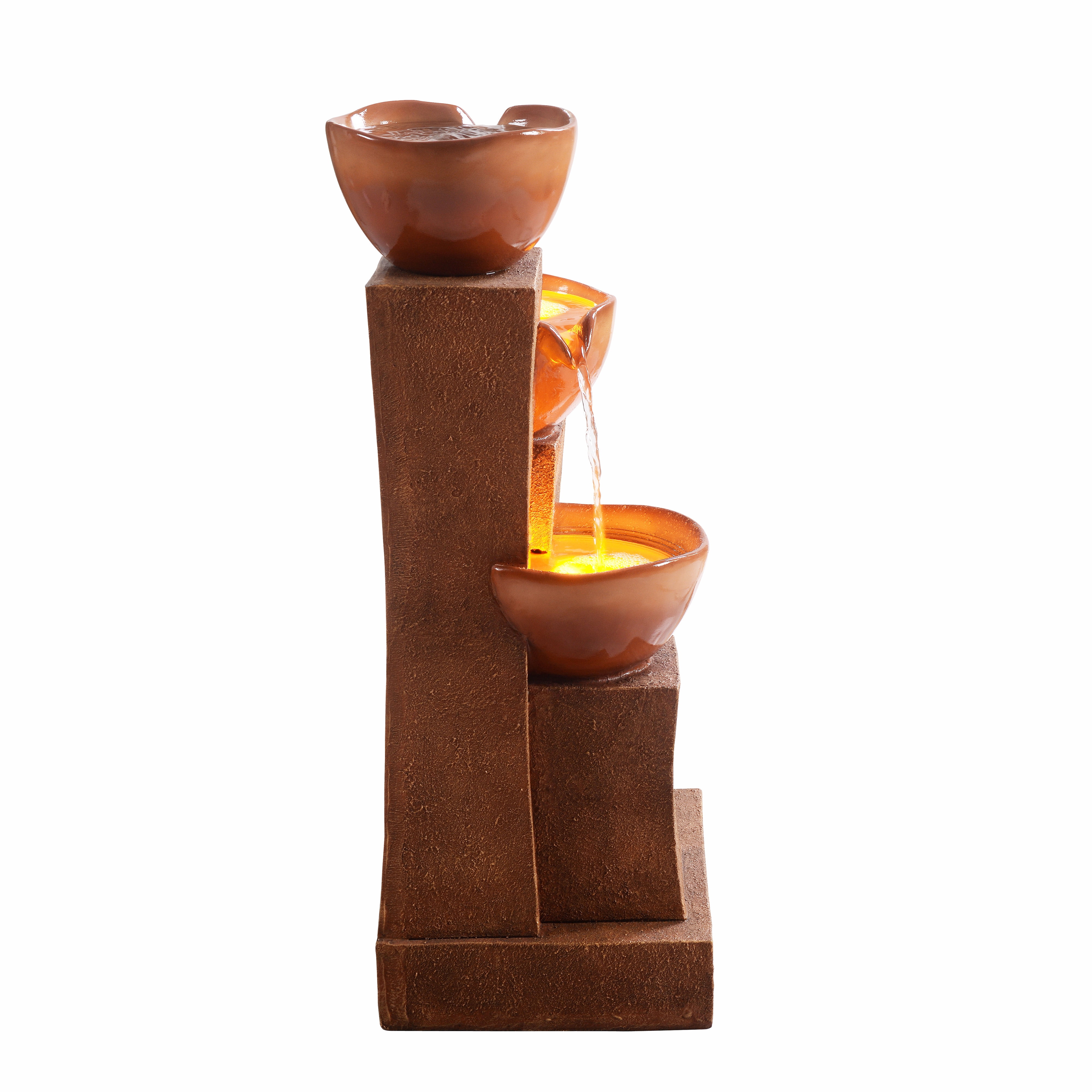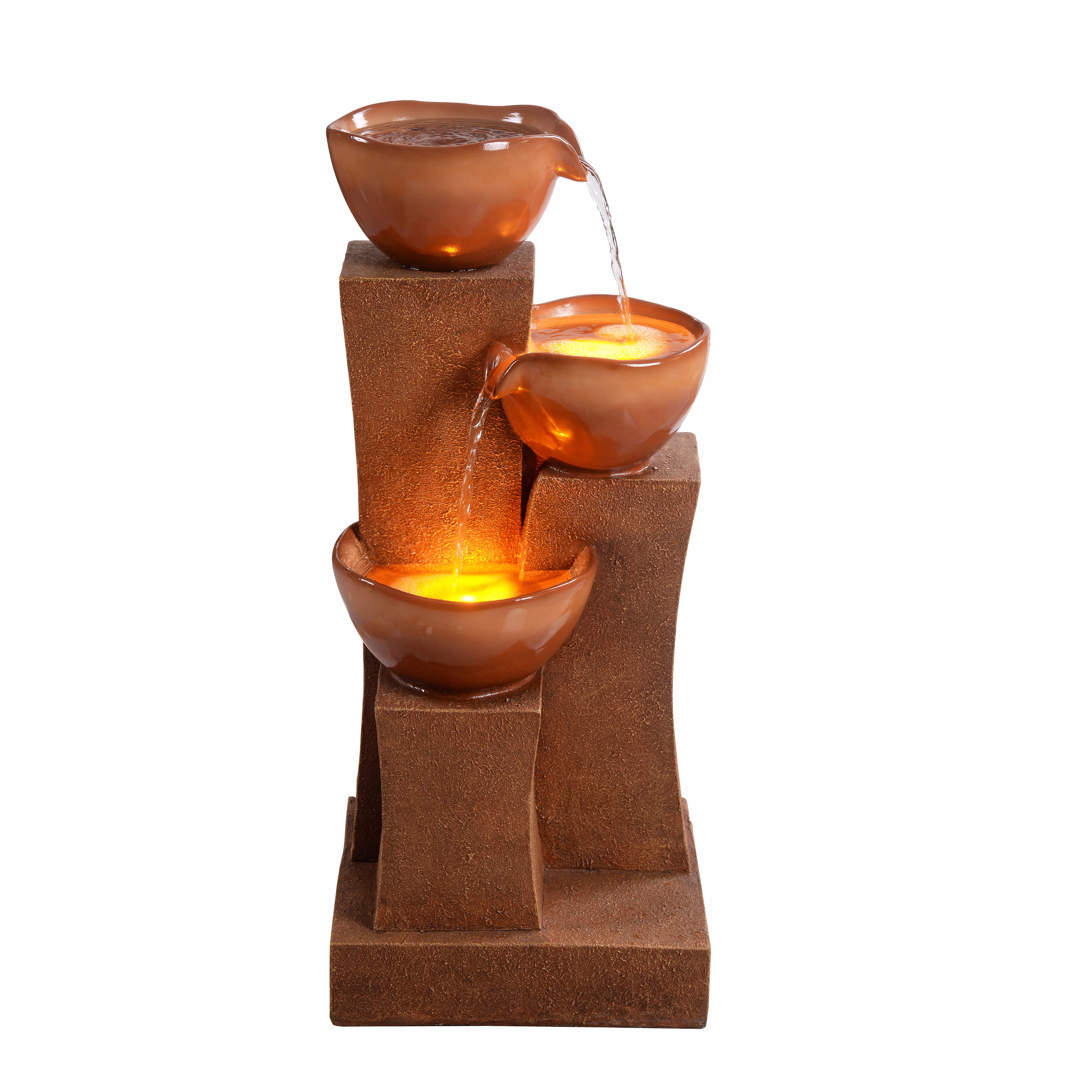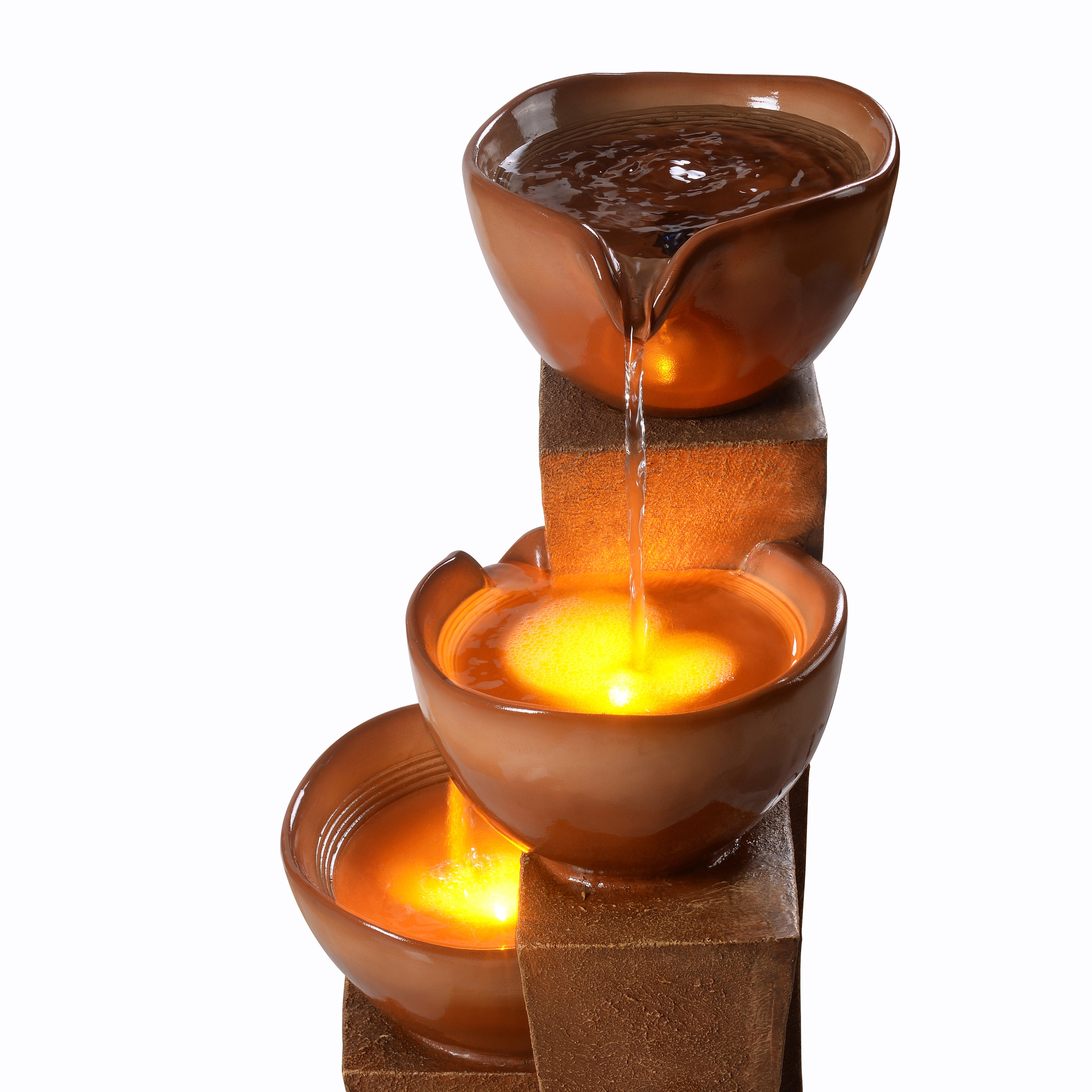 Decorative, multi-textured 3-tier water fountain for outdoors or indoors Shiny brown ombre bowls staggered for soothing water sounds, illuminated from the below by LED lights Textured, staggered pedestals form a contemporary frame Includes an adjustable water pump with a 72.04″ cord and suction cups for secure, submersed placement Dimensions: 12.2″ L x 11.81″ W x 28.54″ H; Water Capacity: 2.1 gallons